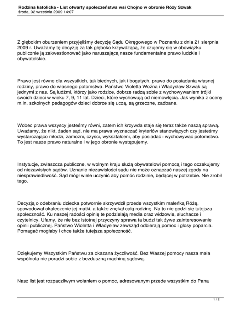 Rodzina katolicka - List otwarty społeczeństwa wsi Chojno w obronie Róży Szwak środa, 02 września 2009 14:07 Z głębokim oburzeniem przyjęliśmy decyzję Sądu Okręgowego w Poznaniu z dnia 21 sierpnia 2009 r. Uważamy tę decyzję za tak głęboko krzywdzącą, że czujemy się w obowiązku publicznie ją zakwestionować jako naruszającą nasze fundamentalne prawo ludzkie i obywatelskie. Prawo jest równe dla wszystkich, tak biednych, jak i bogatych, prawo do posiadania własnej rodziny, prawo do własnego potomstwa. Państwo Violetta Woźna i Władysław Szwak są jednymi z nas. Są ludźmi, którzy jako rodzice, dobrze radzą sobie z wychowywaniem trójki swoich dzieci w wieku 7, 9, 11 lat. Dzieci, które wychowują od niemowlęcia. Jak wynika z oceny m.in. szkolnych pedagogów dzieci dobrze się uczą, są grzeczne, zadbane. Wobec prawa wszyscy jesteśmy równi, zatem ich krzywda staje się teraz także naszą sprawą. Uważamy, że nikt, żaden sąd, nie ma prawa wyznaczać kryteriów stanowiących czy jesteśmy wystarczająco młodzi, zamożni, czyści, wykształceni, aby posiadać i wychowywać potomstwo. To jest nasze prawo naturalne i w jego obronie występujemy. Instytucje, zwłaszcza publiczne, w wolnym kraju służą obywatelowi pomocą i tego oczekujemy od niezawisłych sądów. Uznanie niezawisłości sądu nie może oznaczać naszej zgody na niesprawiedliwość. Sąd mógł wiele uczynić aby pomóc rodzinie, będącej w potrzebie. Nie zrobił tego. Decyzją o odebraniu dziecka potwornie skrzywdził przede wszystkim maleńką Różę, spowodował okaleczenie jej matki, a także znękał całą rodzinę. Na to nie godzi się tutejsza społeczność. Ku naszej radości opinię te podzielają media oraz widzowie, słuchacze i czytelnicy. Ufamy, że nie bez istotnej przyczyny sprawa ta budzi tak żywe zainteresowanie opinii publicznej. Państwo Wioletta i Władysław zewsząd odbierają pomoc i głosy poparcia. Pomagać mogłaby i chce także tutejsza społeczność. Dziękujemy Wszystkim Państwu za okazana życzliwość. Bez Waszej pomocy nasza mała wspólnota nie poradzi sobie z bezduszną machiną sądową. Nasz list jest rozpaczliwym wołaniem o pomoc, adresowanym przede wszystkim do Pana 1/2 Rodzina katolicka - List otwarty społeczeństwa wsi Chojno w obronie Róży Szwak środa, 02 września 2009 14:07 Prezydenta RP, Premiera i Ministra Sprawiedliwości aby zechcieli użyć swoich konstytucyjnych uprawnień by zabrane matce dziecko mogło wrócić do swojej rodziny. Nasz apel zamierzamy skierować także do wszystkich instytucji, po których, jak sądzimy, mamy prawo i nadzieję oczekiwać pomocy. Z poważaniem, Sołtys sołectwa Chojno Błota Jarosław Mikołajczak Proboszcz parafii w Chojnie nad Wartą ks. kanonik Paweł Pawlicki W załączeniu lista poparcia podpisana przez 293 przedstawicieli społeczności lokalnej mieszkańców wsi Chojno (osób dorosłych), która jest poruszona sytuacją rodziny Pani Violetty Woźnej i Pana Władysława Szwaka. Chojno, dnia 24.08.2009 r. www.chojno.pl tel.608471698 2/2