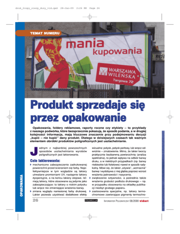 druk_2copy_sierp_duzy_vid.qxd 28-Jan-09 2:26 PM Page 26 TEMAT NUMERU Produkt sprzedaje się przez opakowanie Opakowania, foldery reklamowe, raporty roczne czy etykiety ñ to przyk≥ady z naszego podwÛrka, ktÛre bezsprzecznie pokazujπ, øe sposÛb podania, a w drugiej kolejnoúci informacja, majπ kluczowe znaczenie przy podejmowaniu decyzji ÑkupiÊ ñ nie kupiÊî dany produkt. Dlatego w dzisiejszych czasach tak waønym elementem obrÛbki produktÛw poligraficznych jest uszlachetnianie. wizualne: po≥ysk, po≥ysk per≥owy, lub wrÍcz odwrotnie ñ zmatowienie. Mimo, øe lakier tworzy praktycznie bezbarwnπ powierzchniÍ (analiza spektralna), to jednak wp≥ywa na odbiÛr barwy Cele lakierowania: druku, a w niektÛrych przypadkach (np. barwy niebieskie lub fioletowe) nawet w sposÛb radyv mechaniczne zabezpieczenie zadrukowanej kalny. MÛwi siÍ, øe lakier Ñoøywiaî, Ñwzmacniaî powierzchni przed úcieraniem siÍ farby. NajebarwÍ i wydobywa z niej g≥ÍbiÍ poprzez wzrost fektywniejsze w tym wzglÍdzie sπ lakiery wraøenia jaskrawoúci i nasycenia. utrwalane promieniami UV, nastÍpnie lakiery dyspersyjne, a na koÒcu lakiery olejowe. Ist- v zwiÍkszenie sztywnoúci, a poúrednio takøe wraøenia gruboúci pod≥oøa drukowego ñ np. niejπ lakiery, ktÛre stosowane sπ jedynie jako w przypadku stosowania na ok≥adkÍ publikazabezpieczajπce: to lakiery o niskim po≥ysku cji niezbyt grubego papieru. lub wrÍcz nie zmieniajπce wraøenia barwy. v zmiana wyglπdu naniesionej farby drukowej. v zastosowania specjalne, np. lakiery termochromowe zawierajπce pigmenty termochroLakier pozwala uzyskiwaÊ dodatkowe efekty OPAKOWANIA J 26 ednym z najbardziej powszechnych sposobÛw uszlachetniania wyrobÛw poligraficznych jest lakierowanie. PROMOCJA INFORMATOR POLIGRAFICZNY 08/2008 vidart druk_2copy_sierp_duzy_vid.qxd 28-Jan-09 2:26 PM Page 27 matyczne, dziÍki ktÛrym zmieniajπ barwÍ w rÛønych zakresach temperaturowych), lakiery fotoluminescencyjne (z dodatkami emitujπcymi úwiat≥o w ciemnoúciach), lakiery zapachowe (wydzielajπce zapach na polakierowanej powierzchni po przetarciu jej d≥oniπ w celu zniszczenia mikrokapsu≥ek z substancjπ zapachowπ), lakiery per≥owe (zawierajπce pigment per≥owy), lakiery zdrapkowe (zawierajπce wype≥niacze, dziÍki ktÛrym ≥atwo siÍ zdrapujπ), lakiery brokatowe (zawierajπca brokat), lakiery wypuk≥e (wyraünie wystajπce ponad lakierowanπ powierzchniÍ), lakiery blistrowe, lakiery strukturalne (nie rozlewajπce siÍ rÛwnomiernie na lakierowanej powierzchni lecz tworzπce gÍsto usiane Ñwysepkiî). Oczekiwania wzglÍdem sprzedaøy w bezpoúredni sposÛb przek≥adajπ siÍ na oczekiwania wobec producentÛw farb i lakierÛw. Stπd teø tak istotne jest podnoszenie jakoúci druku. Rodzaje lakierów W poligrafii znajdujπ zastosowanie lakiery olejowe, utrwalane promieniami UV, dyspersyjne. Lakiery te aplikowane sπ na powierzchni druku. Czasem lakier primer stosuje siÍ jako podk≥ad pod lakierowanie lakierem UV. Jako lakierÛw podk≥adowych uøywa siÍ lakierÛw dyspersyjnych. Lakiery olejowe tworzone sπ na bazie modyfikowanych olejÛw roúlinnych i mineralnych. Lakiery te schnπ g≥Ûwnie przez utlenianie. Utlenianiu towarzyszy tworzenie rozbudowanych ≥aÒcuchÛw polimerowych. Lakiery olejowe aplikowane sπ z zespo≥u farbowego maszyn offsetowych. Moøna podzieliÊ je na b≥yszczπce i matowe. NiektÛrzy producenci produkujπ lakiery o pog≥Íbionym macie. WystÍpujπ teø lakiery neutralne, tj. nie zmieniajπce wraøeÒ barwnych druku, a jedynie zabezpieczajπce druk. Naleøy rÛwnieø wymieniÊ farby dyspersyjne Acrylac, gdzie efekt po≥ysku metalicznego jest nieporÛwnywalnie wyøszy niø dotychczas moøliwy do osiπgniÍcia w technice offsetowej, oraz technologiÍ Twin. Technologia Twin oparta na zastosowaniu dwÛch mediÛw hydrofobowych w postaci specjalnego lakieru olejowego Printlack oraz medium hydrofilnego, ktÛrym jest lakier dyspersyjny Acrylac. Efekt matu i po≥ysku moøliwy jest rÛwnieø do uzyskania z wykorzystaniem lakieru UV oraz lakieru olejowego. druk_2copy_sierp_duzy_vid.qxd 28-Jan-09 2:26 PM Page 28 TEMAT NUMERU Kolejnym bardzo popularnym sposobem uszlachetniania jest aplikowanie lakieru UV. Tym sposobem uszlachetnia siÍ aø 35 proc. produkcji poligraficznej. SposÛb utrwalania lakieru UV pozwala na natychmiastowπ obrÛbkÍ po druku. Powierzchnie matowe, b≥yszczπce lakierowanie wybiÛrcze czy chociaøby efekt skÛrki pomaraÒczowej to zaledwie kilka przyk≥adÛw moøliwoúci, ktÛre daje nam ten sposÛb uszlachetniania. Oczywiúcie nie naleøy zapominaÊ, øe oprÛcz niewπtpliwych zalet lakier UV ma rÛwnieø wady, do ktÛrych moøemy zaliczyÊ koszt lakieru, dodatkowe koszty zwiπzane z energiπ wykorzystywanπ do lamp, koniecznoúÊ aplikacji na dedykowanym urzπdzeniu i zapach, ktÛry eliminuje moøliwoúÊ lakierowania opakowaÒ spoøywczych (w ciπgu najbliøszego roku prawdopodobnie pojawi siÍ na rynku produkt, ktÛry jednak da takie moøliwoúci). Lakierowanie moøemy przeprowadziÊ praktycznie we wszystkich technikach druku, od maszyn offsetowych przez maszyny fleksograficzne po maszyny sitodrukowe, a sam sposÛb aplikacji moøe odbywaÊ siÍ inline lub offline. OPAKOWANIA Foliowanie – kaszerowanie folią Kaszerowanie foliπ to najwyøszy stopieÒ uszlachetnienia powierzchni ze wzglÍdu na najpe≥niejsze zabezpieczenie przed uszkodzeniami mechanicznymi i na najwyøszy po≥ysk. Do kaszerowania foliπ stosuje siÍ folie matowe i z po≥yskiem oraz t≥oczeniem. Materia≥em kaszerujπcym jest orientowany polipropylen (OPP) oraz folia octanowa, ktÛrπ moøna skleiÊ i t≥oczyÊ foliπ na gorπco. Zaletπ folii polipropylenowej jest duøa wytrzyma≥oúÊ na rozrywanie. UwagÍ naleøy zwrÛciÊ szczegÛlnie na kleje dyspersyjne, ktÛrych odczyn jest zasadowy. Waøne sπ rÛwnieø warunki, jakie muszπ spe≥niaÊ warstewki farby drukowej podczas kaszerowania. T≥oczenie foli
