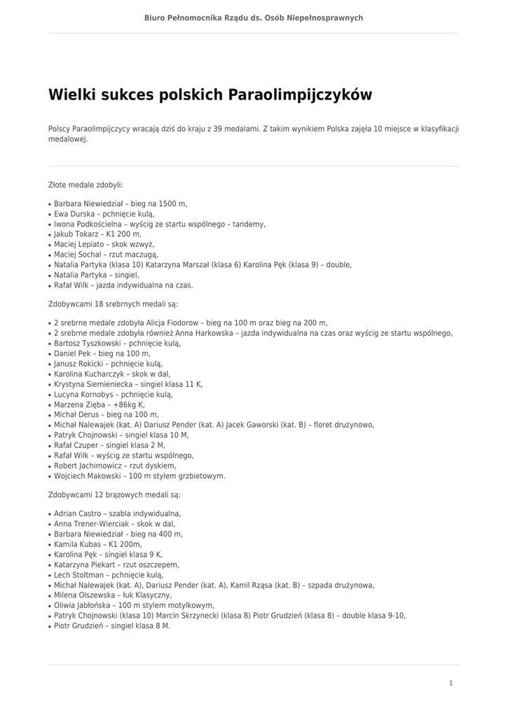 Biuro Pełnomocnika Rządu ds. Osób Niepełnosprawnych Wielki sukces polskich Paraolimpijczyków Polscy Paraolimpijczycy wracają dziś do kraju z 39 medalami. Z takim wynikiem Polska zajęła 10 miejsce w klasyfikacji medalowej. Złote medale zdobyli: ● ● ● ● ● ● ● ● ● Barbara Niewiedział – bieg na 1500 m, Ewa Durska – pchnięcie kulą, Iwona Podkościelna – wyścig ze startu wspólnego – tandemy, Jakub Tokarz – K1 200 m, Maciej Lepiato – skok wzwyż, Maciej Sochal – rzut maczugą, Natalia Partyka (klasa 10) Katarzyna Marszał (klasa 6) Karolina Pęk (klasa 9) – double, Natalia Partyka – singiel, Rafał Wilk – jazda indywidualna na czas. Zdobywcami 18 srebrnych medali są: ● ● ● ● ● ● ● ● ● ● ● ● ● ● ● ● 2 srebrne medale zdobyła Alicja Fiodorow – bieg na 100 m oraz bieg na 200 m, 2 srebrne medale zdobyła również Anna Harkowska – jazda indywidualna na czas oraz wyścig ze startu wspólnego, Bartosz Tyszkowski – pchnięcie kulą, Daniel Pek – bieg na 100 m, Janusz Rokicki – pchnięcie kulą, Karolina Kucharczyk – skok w dal, Krystyna Siemieniecka – singiel klasa 11 K, Lucyna Kornobys – pchnięcie kulą, Marzena Zięba – +86kg K, Michał Derus – bieg na 100 m, Michał Nalewajek (kat. A) Dariusz Pender (kat. A) Jacek Gaworski (kat. B) – floret drużynowo, Patryk Chojnowski – singiel klasa 10 M, Rafał Czuper – singiel klasa 2 M, Rafał Wilk – wyścig ze startu wspólnego, Robert Jachimowicz – rzut dyskiem, Wojciech Makowski – 100 m stylem grzbietowym. Zdobywcami 12 brązowych medali są: ● ● ● ● ● ● ● ● ● ● ● ● Adrian Castro – szabla indywidualna, Anna Trener-Wierciak – skok w dal, Barbara Niewiedział – bieg na 400 m, Kamila Kubas – K1 200m, Karolina Pęk – singiel klasa 9 K, Katarzyna Piekart – rzut oszczepem, Lech Stoltman – pchnięcie kulą, Michał Nalewajek (kat. A), Dariusz Pender (kat. A), Kamil Rząsa (kat. B) – szpada drużynowa, Milena Olszewska – łuk Klasyczny, Oliwia Jabłońska – 100 m stylem motylkowym, Patryk Chojnowski (klasa 10) Marcin Skrzynecki (klasa 8) Piotr Grudzień (klasa 8) – double klasa 9-10, Piotr Grudzień – singiel klasa 8 M. 1 Biuro Pełnomocnika Rządu ds. Osób Niepełnosprawnych Wszystkim zawodnikom i medalistom gratulujemy występów i serdecznie dziękujemy! Źródło: Polski Komitet Paraolimpijski 2