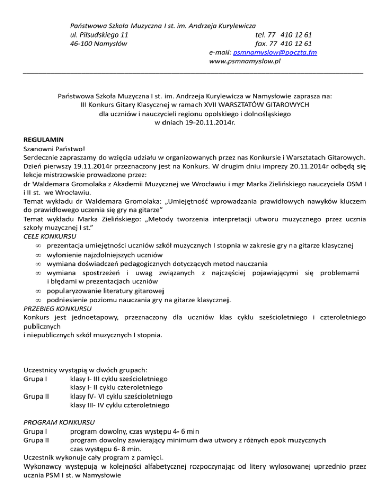 Państwowa Szkoła Muzyczna I st. im. Andrzeja Kurylewicza ul. Piłsudskiego 11 tel. 77 410 12 61 46-100 Namysłów fax. 77 410 12 61 e-mail: [email protected] www.psmnamyslow.pl _______________________________________________________________________________________ Państwowa Szkoła Muzyczna I st. im. Andrzeja Kurylewicza w Namysłowie zaprasza na: III Konkurs Gitary Klasycznej w ramach XVII WARSZTATÓW GITAROWYCH dla uczniów i nauczycieli regionu opolskiego i dolnośląskiego w dniach 19-20.11.2014r. REGULAMIN Szanowni Państwo! Serdecznie zapraszamy do wzięcia udziału w organizowanych przez nas Konkursie i Warsztatach Gitarowych. Dzień pierwszy 19.11.2014r przeznaczony jest na Konkurs. W drugim dniu imprezy 20.11.2014r odbędą się lekcje mistrzowskie prowadzone przez: dr Waldemara Gromolaka z Akademii Muzycznej we Wrocławiu i mgr Marka Zielińskiego nauczyciela OSM I i II st. we Wrocławiu. Temat wykładu dr Waldemara Gromolaka: „Umiejętność wprowadzania prawidłowych nawyków kluczem do prawidłowego uczenia się gry na gitarze” Temat wykładu Marka Zielińskiego: „Metody tworzenia interpretacji utworu muzycznego przez ucznia szkoły muzycznej I st.” CELE KONKURSU • prezentacja umiejętności uczniów szkół muzycznych I stopnia w zakresie gry na gitarze klasycznej • wyłonienie najzdolniejszych uczniów • wymiana doświadczeń pedagogicznych dotyczących metod nauczania • wymiana spostrzeżeń i uwag związanych z najczęściej pojawiającymi się problemami i błędami w prezentacjach uczniów • popularyzowanie literatury gitarowej • podniesienie poziomu nauczania gry na gitarze klasycznej. PRZEBIEG KONKURSU Konkurs jest jednoetapowy, przeznaczony dla uczniów klas cyklu sześcioletniego i czteroletniego publicznych i niepublicznych szkół muzycznych I stopnia. Uczestnicy wystąpią w dwóch grupach: Grupa I klasy I- III cyklu sześcioletniego klasy I- II cyklu czteroletniego Grupa II klasy IV- VI cyklu sześcioletniego klasy III- IV cyklu czteroletniego PROGRAM KONKURSU Grupa I program dowolny, czas występu 4- 6 min Grupa II program dowolny zawierający minimum dwa utwory z różnych epok muzycznych czas występu 6- 8 min. Uczestnik wykonuje cały program z pamięci. Wykonawcy występują w kolejności alfabetycznej rozpoczynając od litery wylosowanej uprzednio przez ucznia PSM I st. w Namysłowie Wszyscy uczestnicy otrzymują dyplomy uczestnictwa, a laureaci nagrody rzeczowe. Laureaci Konkursu (miejsca I- III z obu grup) zobowiązani są do wzięcia udziału w koncercie laureatów, który nastąpi po ogłoszeniu wyników Konkursu i wręczeniu nagród. Laureaci konkursów z lat poprzednich nie mogą uczestniczyć w przesłuchaniach konkursowych. TERMINY III Konkurs Gitary Klasycznej w ramach XVII Warsztatów Gitarowych dla uczniów i nauczycieli szkół muzycznych regionu opolskiego odbędzie się w dniach 19-20.11.2014r W dniu 19.11.2014r odbędzie się konkurs, wykłady oraz Koncert i promocja nowej płyty dr Waldemara Gromolaka. W dniu 20.11.2014r przewidziane są wykłady, zajęcia warsztatowe, prezentacja gitar firmy Yamaha oraz prezentacja książki dr Waldemara Gromolaka pt. „O pięknym dźwięku gitary klasycznej” Wykładowcy: dr Waldemar Gromolak- Akademia Muzyczna we Wrocławiu mgr Marek Zieliński- OSM I i II st. we Wrocławiu Warunkiem udziału w konkursie jest nadesłanie do dnia 24.10.2014r drogą elektroniczną na adres: [email protected] zgłoszenie zawierające: 1) Imię, nazwisko i datę urodzenia uczestnika 2) Klasę oraz grupę konkursową 3) Imię, nazwisko nauczyciela 4) Nazwa szkoły delegującej 5) Program występu uczestnika (imię, nazwisko kompozytora, tytuł utworu, opus, numer) Prosimy o dołączenie w załączniku skan dowodu wpłaty wpisowego. Harmonogram Konkursu zostanie przesłany przez organizatorów drogą elektroniczną. Wpisowe na III Konkurs Gitary Klasycznej w Namysłowie w wysokości 70 zł od uczestnika prosimy wpłacać na konto: Stowarzyszenie Wspierające Państwową Szkołę Muzyczna I st. w Namysłowie 46-100 Namysłów, ul. Józefa Piłsudskiego 11 nr konta: 52 1090 2196 0000 0001 1478 3316 z dopiskiem „Cele statutowe” Wpisowe nie podlega zwrotowi w razie rezygnacji uczestnika z udziału w konkursie. Koszty uczestnictwa w Konkursie oraz koszty noclegu uczestnicy pokrywają we własnym zakresie. Baza noclegowa: Osobom zainteresowanym noclegami proponujemy zakwaterowanie w niżej wymienionych hotelach: - Hotel Dworek Różany; ul. Oławska 36 A, 46-100 Namysłów; www.dworekrozany.pl - Hotel Pod Lasem; ul. M. C. Skłodowskiej 16, 46-100 Namysłów; www.hotelpodlasem.com.pl - Hotelik na Stadionie; ul. Pułaskiego 5; 46-100 Namysłów; tel. (77) 410 24 09 - Hotel Stylowa; ul. Braterska 3a, 46-100 Namysłów; tel. (77) 410 34 81 z poważaniem dyrektor szkoły - mgr Jacek Rybitw