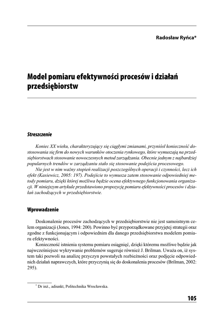 Radosław Ryńca* Model pomiaru efektywności procesów i działań przedsiębiorstw Streszczenie Koniec XX wieku, charakteryzujący się ciągłymi zmianami, przyniósł konieczność dostosowania się firm do nowych warunków otoczenia rynkowego, które wymuszają na przedsiębiorstwach stosowanie nowoczesnych metod zarządzania. Obecnie jednym z najbardziej popularnych trendów w zarządzaniu stało się stosowanie podejścia procesowego. Nie jest w nim ważny stopień realizacji poszczególnych operacji i czynności, lecz ich efekt (Kasiewicz, 2005: 197). Podejście to wymusza zatem stosowanie odpowiedniej metody pomiaru, dzięki której możliwa będzie ocena efektywnego funkcjonowania organizacji. W niniejszym artykule przedstawiono propozycję pomiaru efektywności procesów i działań zachodzących w przedsiębiorstwie. Wprowadzenie Doskonalenie procesów zachodzących w przedsiębiorstwie nie jest samoistnym celem organizacji (Jones, 1994: 200). Powinno być przyporządkowane przyjętej strategii oraz zgodne z funkcjonującym i odpowiednim dla danego przedsiębiorstwa modelem pomiaru efektywności. Konieczność istnienia systemu pomiaru osiągnięć, dzięki któremu możliwe będzie jak najwcześniejsze wykrywanie problemów sugeruje również J. Brilman. Uważa on, iż system taki pozwoli na analizę przyczyn powstałych rozbieżności oraz podjęcie odpowiednich działań naprawczych, które przyczynią się do doskonalenia procesów (Brilman, 2002: 295). * Dr inż., adiunkt, Politechnika Wrocławska. 105 WS P Ó Ł C Z E S N A E K O N O M I A Nr 4/2009(12) W związku z tym, iż przedmiotem pracy jest zaprezentowanie modelu pomiaru efektywności procesów i działań konieczne wydaje się wyjaśnienie, czym ów proces i działanie jest. Termin „proces” wykracza poza tradycyjne odniesienie wyłącznie do procesu produkcyjnego i jest rozumiany jako sekwencja działań realizowanych w celu utrzymania określonego efektu finalnego. Według J.W. Dangela proces to łańcuch działań zmierzający do wytworzenia wartości odpowiadających wymaganiom klienta (Muller, 2000: 21). Inną definicję przedstawia Słownik Wyrazów Obcych, według którego proces to (...) przebieg regularnie następujących po sobie zjawisk, pozostających między sobą w związku przyczynowym (Słownik Wyrazów Obcych, 1980: 601). Procesy zachodzące w przedsiębiorstwie stanowią centra działań, obejmują kilka ściśle powiązanych ze sobą rodzajów działań. Przytoczone definicje wskazują na pojęcie procesu jako sekwencji realizowanych działań, mających na celu przekształcenie jasno zdefiniowanego stanu wejściowego w stan wyjściowy, przy wykorzystaniu niezbędnych do tego zasobów (Zawistowski, 2001). Kolejnym terminem wymagającym wyjaśnienia jest termin „działanie” (ang. acvtivity). J. Gierusz określa działanie jako wycinek pracy niezbędny do stworzenia wyrobu lub usługi. Działanie w literaturze często definiowane jest jako zbiór powtarzalnych, jednorodnych lub podobnych zdarzeń i czynności wykonywanych w celu realizacji określonej funkcji gospodarczej oraz powodujących powstawanie kosztów (Gierusz, 1999: 2). Po zdefiniowaniu pojęcia procesu i działania nasuwa się konieczność zdefiniowania pojęcia „zadania”. Zadania są bowiem elementarną częścią działań. Działania wchodzą w skład procesów. Procesy natomiast są związane z określonym produktem, usługą lub klientem. Zadanie jest to działanie na tak zwanym mikropoziomie. Jest pojedynczą czynnością, wykonywaną przez człowieka lub przez maszynę (Sołtys, 2003: 200). Na rys. 1 przedstawiono zależności pomiędzy pojęciami proces, działanie i zadanie. W celu dalszego zaprezentowania potrzeby budowy modelu pomiaru efektywności procesów konieczne wydaje się wyjaśnienie, czym jest efektywność. W literaturze przedmiotu można spotkać szereg definicji tego pojęcia. R. Piechota definiuje efektywność jako „realizację wyznaczonych celów przy użyciu możliwie najmniejszych zasobów” (Piechota 2005: 183). G. Świderska ujmuje efektywność w postaci dwóch kryteriów wydajności i oszczędności. Pierwsze polega na zwiększeniu liczby wykonywanych poprawnie Rys. 1. Zależności pomiędzy pojęciami: proces, działanie i zadanie PROCES Działanie Zadanie Zadanie Działanie Zadanie Źródło: Opracowanie własne na podstawie: Miller, Pniewski, Polakowski, 2000. 106 Zadanie Nr 4/2009(12) WS P Ó Ł C Z E S N A E K O N O M I A działań poprzez skrócenie czasu wykonywania pojedynczej operacji i zwiększeniu prawdopodobieństwa prawidłowego wykonania zadania, drugie natomiast polega na zmniejszeniu zużycia zasobów i obniżki kosztów (Świderka, 2003: 6). Często zamiast terminu „efektywność” używa się terminu „sprawność”, która obejmuje realizację celów oraz związane z tym nakłady (Pawłowski, 2007: 30). W niniejszej pracy pod pojęciem efektywności należy rozumieć ilościową cechę działania, odzwierciedloną w relacji wyników działania uzyskanych w pewnym czasie i zmierzających do zaspokojenia potrzeb odbiorcy (którym może być klient zewnętrzny, jak i wewnętrzny1) oraz nakładów koniecznych do osiągnięcia tych wyników (Czakon, 2004: 3). Obecnie większość przedsiębiorstw dokonuje pomiaru osiąganych wyników. Do tego celu wykorzystują zazwyczaj metody pochodzące z początku XX w., które opierają się na systemach rachunkowości i analizie kosztów. Wykorzystywane były jako instrument kontroli, a nie jako narzędzie, którego celem jest usprawnienie podjętych działań (Sinclair, 1995: 77). „Dobry system mierzenia efektywności powinien być zrównoważony, adekwatny, oparty na faktach i reagować na potrzeby odbiorców informacji o efektywności” (Miller, 2000: 180). S. Kasiewicz uważa, iż ocena procesu może być dokonana poprzez pomiar czterech zasadniczych atrybutów procesu, takich jak: koszt, czas realizacji, elastyczność o