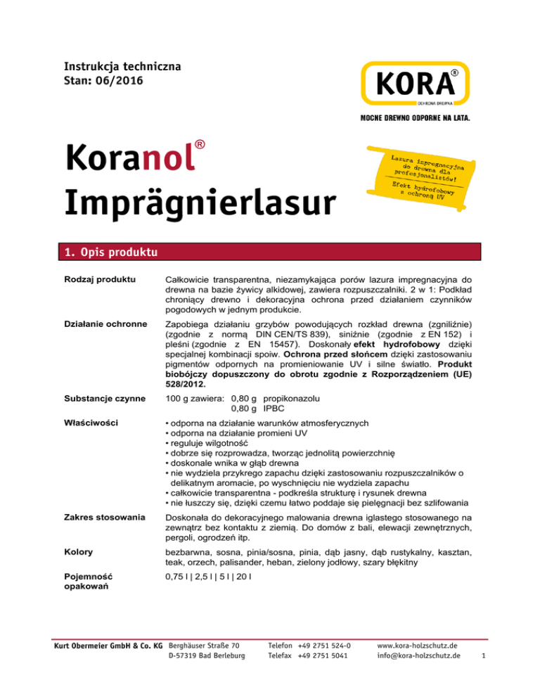 ® Rodzaj produktu Całkowicie transparentna, niezamykająca porów lazura impregnacyjna do drewna na bazie żywicy alkidowej, zawiera rozpuszczalniki. 2 w 1: Podkład chroniący drewno i dekoracyjna ochrona przed działaniem czynników pogodowych w jednym produkcie. Działanie ochronne Zapobiega działaniu grzybów powodujących rozkład drewna (zgniliźnie) (zgodnie z normą DIN CEN/TS 839), siniźnie (zgodnie z EN 152) i pleśni (zgodnie z EN 15457). Doskonały efekt hydrofobowy dzięki specjalnej kombinacji spoiw. Ochrona przed słońcem dzięki zastosowaniu pigmentów odpornych na promieniowanie UV i silne światło. Produkt biobójczy dopuszczony do obrotu zgodnie z Rozporządzeniem (UE) 528/2012. Substancje czynne 100 g zawiera: 0,80 g propikonazolu 0,80 g IPBC Właściwości • odporna na działanie warunków atmosferycznych • odporna na działanie promieni UV • reguluje wilgotność • dobrze się rozprowadza, tworząc jednolitą powierzchnię • doskonale wnika w głąb drewna • nie wydziela przykrego zapachu dzięki zastosowaniu rozpuszczalników o delikatnym aromacie, po wyschnięciu nie wydziela zapachu • całkowicie transparentna - podkreśla strukturę i rysunek drewna • nie łuszczy się, dzięki czemu łatwo poddaje się pielęgnacji bez szlifowania Zakres stosowania Doskonała do dekoracyjnego malowania drewna iglastego stosowanego na zewnątrz bez kontaktu z ziemią. Do domów z bali, elewacji zewnętrznych, pergoli, ogrodzeń itp. Kolory bezbarwna, sosna, pinia/sosna, pinia, dąb jasny, dąb rustykalny, kasztan, teak, orzech, palisander, heban, zielony jodłowy, szary błękitny Pojemność opakowań 0,75 l | 2,5 l | 5 l | 20 l Berghäuser Straße 70 D-57319 Bad Berleburg Telefon +49 2751 524-0 Telefax +49 2751 5041 www.kora-holzschutz.de [email protected] 1 Gęstość 20 °C ok. 0,86 g/cm³ Lepkość Rozrzedzona ciecz Temperatura zapłonu > 61 °C Czas schnięcia W warunkach umiarkowanych (23 °C, 50% względnej wilgotności powietrza wg DIN 50.014) i na zwykłych gatunkach drewna, takich jak sosna i świerk po ok. 5 godz. powierzchnia jest sucha. Po ok. 10 godz. można nakładać kolejne warstwy. W niekorzystnych warunkach pogodowych (wysoka wilgotność powietrza, niskie temperatury) czas schnięcia może się znacznie wydłużyć. Czas schnięcia może być także dłuższy w zależności od gatunku drewna. ż Przygotowanie Pokrywające warstwy preparatów do malowania, lakierów lub lazur grubowarstwowych należy całkowicie usunąć. Drewno bardzo zniszczone wskutek działania warunków atmosferycznych przeszlifować w celu usunięcia podniesionych włókien drewna i uzyskania równej powierzchni. Oczyścić powierzchnię drewna z brudu i pyłu. Podczas szlifowania stosować maskę chroniącą przed pyłem. Materiały bitumiczne i tworzywa sztuczne, a także tynki, beton i kamień należy przykryć w celu ochrony przed zabrudzeniem. Rośliny osłonić przed spryskaniem. Podczas stosowania (malowania) należy użyć odpowiedniego przykrycia (np. folii, plandeki) chroniącego podłoże. Sprawdzona dawka 160-180 ml/m² Sposób nanoszenia Przy pomocy pędzla, zanurzanie, urządzeniach, automat malarski. Zastosowanie Koranol® Imprägnierlasur przed użyciem dokładnie wstrząsnąć lub wymieszać. Nanosić przy pomocy miękkiego pędzla wzdłuż włókien. Aby uzyskać jednolity kolor na drewnie o zróżnicowanej chłonności (np. świerk, sosna) przed nałożeniem kolorowej lazury pomalować lazurą bezbarwną lub podkładem bezbarwnym, np. Koranol Grund farblos. Przed zastosowaniem metodą natrysku w zamkniętych urządzeniach prosimy o kontakt z naszym działem technicznym. Optymalna temperatura pracy i schnięcia wynosi od +15 °C do +30 °C (dotyczy podłoża, preparatu Koranol® Imprägnierlasur i temperatury otoczenia). Temperatura schnięcia min. +5 °C. Berghäuser Straße 70 D-57319 Bad Berleburg natrysk Telefon +49 2751 524-0 Telefax +49 2751 5041 tylko w zamkniętych www.kora-holzschutz.de [email protected] 2 Zalecenia Przed użyciem na dużej powierzchni należy sprawdzić odcień, w każdym przypadku zalecamy wykonanie próbnego malowania. Wszystkie kolory można ze sobą mieszać. Sama lazura bezbarwna nie może stanowić jedynej powłoki malarskiej w zastosowaniu na zewnątrz. Nie dodawać rozcieńczalników. Wilgotność drewna nie może przekraczać 20%. Zszarzałe powierzchnie (stare drewno) i gatunki drewna posiadające własne zabarwienie mogą wpływać na kolor lazur; dotyczy to szczególnie jasnych kolorów lazury (np. sosna). Wskutek wchłaniania wody przez niechronione powierzchnie drewna w przekroju czołowym może następować wymywanie z drewna składników barwiących, a wskutek tego mogą powstawać plamy na przyległych jasnych powierzchniach tynku i muru. W takim przypadku po zastosowaniu preparatu Koranol Imprägnierlasur zalecamy zabezpieczenie powierzchni czołowych drewna środkiem Koralan® Hirnholzschutz (nałożyć co najmniej 2 warstwy). W celu utworzenia kapinosa należy podciąć dolne powierzchnie czołowe drewna. Właściwości zaimpregnowanego drewna Wyschnięta lazura nie wchodzi w reakcję z tworzywami sztucznymi i materiałami bitumicznymi i nie wpływa na palność drewna. Działanie korozyjne Nie powoduje korozji szkła i metalu. Renowacja Stare powierzchnie pomalowane lazurą Koranol Imprägnierlasur łatwo poddają się renowacji. Oczyścić powierzchnię drewna z brudu i pyłu, następnie nałożyć Koranol® Imprägnierlasur. Czyszczenie narzędzi Przy użyciu preparatów do czyszczenia pędzli, benzyny ekstrakcyjnej lub rozcieńczalnika nitro. Berghäuser Straße 70 D-57319 Bad Berleburg Telefon +49 2751 524-0 Telefax +49 2751 5041 www.kora-holzschutz.de [email protected] 3 Oznakowanie zgodnie z Rozporządzeniem (WE) Nr 1272/2008 [CLP] Słowo sygnałowe: Zagrożenie dla zdrowia Zawiera: węglowodory, C10-C13, n-alkany, izoalkany, cykleny, < 2% aromaty; Zagrożenia: H304 Połknięcie i dostanie się