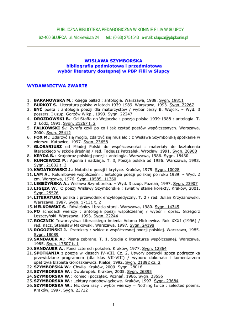 PUBLICZNA BIBLIOTEKA PEDAGOGICZNA W KONINIE FILIA W SŁUPCY 62-400 SŁUPCA ul. Mickiewicza 24 tel.: (0 63) 2751543 e-mail: [email protected] WISŁAWA SZYMBORSKA bibliografia podmiotowa i przedmiotowa wybór literatury dostępnej w PBP Filii w Słupcy WYDAWNICTWA ZWARTE 1. BARANOWSKA M.: Księga ballad : antologia. Warszawa, 1988. Sygn. 19811 2. BURKOT S.: Literatura polska w latach 1939-1989. Warszawa, 1993. Sygn. 22267 3. BYĆ poeta : antologia poezji dla maturzystów / wybór Jerzy B. Wójcik. – Wyd. 3 poszerz. I uzup. Gorzów Wlkp., 1993. Sygn. 22247 4. DROZDOWSKI B.: Od Staffa do Wojaczka : poezja polska 1939-1988 : antologia. T. 2. Łódź, 1991. Sygn. 21267 t. 2 5. FALKOWSKI S.: Żyrafa czyli po co i jak czytać poetów współczesnych. Warszawa, 2000. Sygn. 25412 6. FOX M.: Zdarzyć się mogło, zdarzyć się musiało : z Wisława Szymborską spotkanie w wierszu. Katowice, 1997. Sygn. 23658 7. GLOSARIUSZ od Młodej Polski do współczesności : materiały do kształcenia literackiego w szkole średniej / red. Tadeusz Patrzałek. Wrocław, 1991. Sygn. 20908 8. KRYDA B.: Krajobraz polskiej poezji : antologia. Warszawa, 1986. Sygn. 18430 9. KUNCEWICZ P.: Agonia i nadzieja. T. 3, Poezja polska od 1956. Warszawa, 1993. Sygn. 21832 t. 3 10. KWIATKOWSKI J.: Notatki o poezji i krytyce. Kraków, 1975. Sygn. 10028 11. LAM A.: Kolumbowie współcześni : antologia poezji polskiej po roku 1939. – Wyd. 2 zm. Warszawa, 1976. Sygn. 10585, 11360 12. LEGEŻYŃSKA A.: Wisława Szymborska. – Wyd. 3 uzup. Poznań, 1997. Sygn. 23907 13. LIGĘZA W.: O poezji Wisławy Szymborskie : świat w stanie korekty. Kraków, 2001. Sygn. 25576 14. LITERATURA polska : przewodnik encyklopedyczny. T. 2 / red. Julian Krzyżanowski. Warszawa, 1987. Sygn. 17131 t. 2 15. MELKOWSKI S.: Rówieśnicy i bracia starsi. Warszawa, 1980. Sygn. 14345 16. PO schodach wierszy : antologia poezji współczesnej / wybór i oprac. Grzegorz Leszczyński. Warszawa, 1993. Sygn. 22244 17. ROCZNIK Towarzystwa Literackiego imienia Adama Mickiewicz. Rok XXXI (1996) / red. nacz. Stanisław Makowski. Warszawa, 1997. Sygn. 24198 18. ROGOZIŃSKI J.: Preteksty : szkice o współczesnej poezji polskiej. Warszawa, 1985. Sygn. 18089 19. SANDAUER A.: Pisma zebrane. T. 1, Studia o literaturze współczesnej. Warszawa, 1985. Sygn. 17507 t. 1 20. SANDAUER A.: Poeci czterech pokoleń. Kraków, 1977. Sygn. 12364 21. SPOTKANIA z poezja w klasach IV-VIII. Cz. 2, Utwory poetycki spoza podręcznika przewidziane programem (dla klas VII-VIII) / wyboru dokonała i komentarzem opatrzyła Elżbieta Goroszkiewicz. Kielce, 1992. Sygn. 21892 cz. 2 22. SZYMBOESKA W.: Chwila. Kraków, 2009. Sygn. 28016 23. SZYMBORSKA W.: Dwukropek. Kraków, 2005. Sygn. 26895 24. SZYMBORSKA W.: Koniec i początek. Poznań, 1966. Sygn. 23556 25. SZYMBORSKA W.: Lektury nadobowiązkowe. Kraków, 1997. Sygn. 23684 26. SZYMBORSKA W.: Nic dwa razy : wybór wierszy = Nothing twice : selected poems. Kraków, 1997. Sygn. 23732 1 27. SZYMBORSKA W.: Nowe Lektury nadobowiązkowe 1997-2002. Kraków, 2002. Sygn. 25910 28. SZYMBORSKA W.: O śmierci bez przesady = De la mort Sans exagérer. Kraków, 1997. Sygn. 23783 29. SZYMBOESKA W.: Sto wierszy – sto pociech = Hundert Gedichtr – hundert Freund. Kraków, 1997. Sygn. 23784 30. SZYMBORSKA W.: Tutaj. Kraków, 2009. Sygn. 28035 31. SZYMBORSKA W.: Widok z ziarenkiem piasku : 102 wiersze. Poznań, 1996. Sygn. 23660, 23600 32. SZYMBORSKA W.: Wieczór autorski. – Wyd. 2. Warszawa, 1993. Sygn. 21616 33. WĘGRZYNIAKOWA A.: Nie ma rozpusty większej niż myślenie : o poezji Wisławy Szymborskiej. Katowice, 1996. Sygn. 23659 34. WISŁAWA Szymborska : Nobel’96 / red. nacz. Bronisław Maj. Kraków, 1996. Sygn. 23577 ARTYKUŁY Z CZASOPISM 1. ARLT J.: „Piszę więc jestem – nie bezbronna… „ : o Noblu dla Szymborskiej w Niemczech i w Szwajcarii // Polonistyka. – 1997, nr 8, s. 461-464 2. BARANOWSKA M.: Prywatna historia poezji. Na Widnokręgu // Twórczość. – 1995, nr 2, s. 145 3. BARANOWSKA M.: Prywatna historia poezji. Na Widnokręgu // Twórczość. – 1995, nr 3, s. 119 4. BARANOWSKA M.: Prywatna historia poezji. Na Widnokręgu // Twórczość. – 1995, nr 7/8, s. 297 5. BARAŃCZAK S.: Bierze nas na serio // Tygodnik Powszechny. – 1996, nr 41, s. 8 6. BATOR D. [i in.]: Nad wierszami Wisławy Szymborskiej // Warsztaty Polonistyczne. – 1996, nr 4, s. 14-22 7. BILSKA G.: Laureaci literackiej Nagrody Nobla. Wisława Szymborska (zestawienie bibliograficzne) // Biblioteka w szkole. – 1997, nr 1, s. 13-16 8. BIKONT A., SZCZĘSNA J.: Pan Szymborski fragm. // Tygodnik Powszechny. – 1997, nr 13, nr 14-15 9. BRUDNICKA A.: Kształtowanie postaw twórczych w procesie dydaktycznowychowawczym // Język Polski w Szkole dla klas IV-VIII. – 1987/88, z. 1, s. 6-14 10. BUDREWICZ Z., SIENKO M.: Gry ironiczne (w szkolonej lekturze wierszy Szymborskiej: „Pogrzeb”, „Urodziny”, „Jarmak cudów”) // Polonistyka. – 1997, nr 8, s. 486-490 11. BURY K.: Spróbujmy polubić poezję współczesną // Język Polski w Szkole dla klas IVVIII. – 1986/87, z. 5, s. 613-618 12. DRZEWUCKI J.: Gdzieś obok, poza wszystkim : (Wisława Szymborska „Koniec i początek”) ksiązka miesiąca // Twórczość. – 1993, nr 12, s. 103-110 13. DZIEDZIC L.: Szymborskiej rozumienie poezji // Polonistyka. – 1997, nr 8, s. 475477 14. GŁOWIŃSKI M.: Wisława Szymborska : literacka Nagroda Nobla 1996 // Nowe Książki. – 1996, nr 11, s. II okł., 1 15. GOŚCINIEWICZ B.: Jak Bogacic słownictwo dziecka związane z doznaniami emocjonalnymi, analizując utwory liryczne w szkole podstawowej // Język Polski w Szkole dla klas IV-VIII. – 1989/90, z. 5, s. 469-470 16. GÓRECKA K.: Zdania osaczające (o poezji W. Szymborskiej kl. VIII) // Język Polski w Szkole dla klas IV-VIII. – 1986/87, z. 6, s. 51-60 17. HAYKOWSKA M.: Mozart poezji: korespondencja ze Sztokholmu // Nowe Książki. – 1996,nr 11, s. 67-68 18. HEYDEL M.: Przekraczanie granic Szymborska i Mił