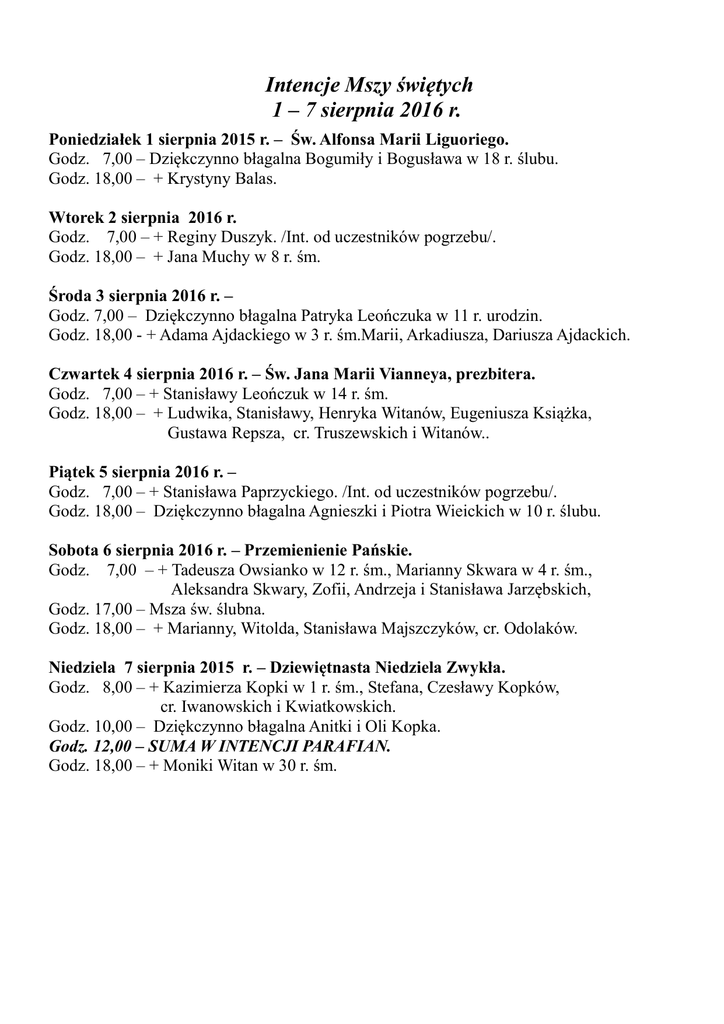 Intencje Mszy świętych 1 – 7 sierpnia 2016 r. Poniedziałek 1 sierpnia 2015 r. – Św. Alfonsa Marii Liguoriego. Godz. 7,00 – Dziękczynno błagalna Bogumiły i Bogusława w 18 r. ślubu. Godz. 18,00 – + Krystyny Balas. Wtorek 2 sierpnia 2016 r. Godz. 7,00 – + Reginy Duszyk. /Int. od uczestników pogrzebu/. Godz. 18,00 – + Jana Muchy w 8 r. śm. Środa 3 sierpnia 2016 r. – Godz. 7,00 – Dziękczynno błagalna Patryka Leończuka w 11 r. urodzin. Godz. 18,00 - + Adama Ajdackiego w 3 r. śm.Marii, Arkadiusza, Dariusza Ajdackich. Czwartek 4 sierpnia 2016 r. – Św. Jana Marii Vianneya, prezbitera. Godz. 7,00 – + Stanisławy Leończuk w 14 r. śm. Godz. 18,00 – + Ludwika, Stanisławy, Henryka Witanów, Eugeniusza Książka, Gustawa Repsza, cr. Truszewskich i Witanów.. Piątek 5 sierpnia 2016 r. – Godz. 7,00 – + Stanisława Paprzyckiego. /Int. od uczestników pogrzebu/. Godz. 18,00 – Dziękczynno błagalna Agnieszki i Piotra Wieickich w 10 r. ślubu. Sobota 6 sierpnia 2016 r. – Przemienienie Pańskie. Godz. 7,00 – + Tadeusza Owsianko w 12 r. śm., Marianny Skwara w 4 r. śm., Aleksandra Skwary, Zofii, Andrzeja i Stanisława Jarzębskich, Godz. 17,00 – Msza św. ślubna. Godz. 18,00 – + Marianny, Witolda, Stanisława Majszczyków, cr. Odolaków. Niedziela 7 sierpnia 2015 r. – Dziewiętnasta Niedziela Zwykła. Godz. 8,00 – + Kazimierza Kopki w 1 r. śm., Stefana, Czesławy Kopków, cr. Iwanowskich i Kwiatkowskich. Godz. 10,00 – Dziękczynno błagalna Anitki i Oli Kopka. Godz. 12,00 – SUMA W INTENCJI PARAFIAN. Godz. 18,00 – + Moniki Witan w 30 r. śm.