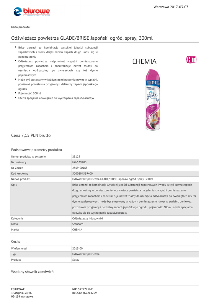 Warszawa 2017-03-07 Karta produktu: Odświeżacz powietrza GLADE/BRISE Japoński ogród, spray, 300ml Brise aerozol to kombinacja wysokiej jakości substancji zapachowych i wody dzięki czemu zapach długo unosi się w pomieszczeniu Odświeżacz powietrza natychmiast wypełni pomieszczenie przyjemnym zapachem i zneutralizuje nawet trudny do usunięcia odór po zwierzętach czy też dymie papierosowym Może być stosowany w każdym pomieszczeniu nawet w sypialni, ponieważ pozostawia przyjemny i delikatny zapach japońskiego ogrodu Pojemność: 300ml Oferta specjalna obowiązuje do wyczerpania zapasów Cena 7,15 PLN brutto Podstawowe parametry produktu Numer produktu w systemie 25125 Nr dostawcy HG-539400 Nr Celcen 2369-00165 Kod kreskowy 5000204539400 Nazwa produktu Odświeżacz powietrza GLADE/BRISE Japoński ogród, spray, 300ml Opis Brise aerozol to kombinacja wysokiej jakości substancji zapachowych i wody dzięki czemu zapach długo unosi się w pomieszczeniu; odświeżacz powietrza natychmiast wypełni pomieszczenie przyjemnym zapachem i zneutralizuje nawet trudny do usunięcia odór po zwierzętach czy też dymie papierosowym; może być stosowany w każdym pomieszczeniu nawet w sypialni, ponieważ pozostawia przyjemny i delikatny zapach japońskiego ogrodu; pojemność: 300ml; oferta specjalna obowiązuje do wyczerpania zapasów Kategoria Odświeżacze i dozowniki Klasa Standard Marka CHEMIA Cecha W ofercie od 2015-09 Typ Odświeżacz powietrza Produkt Spray Wspólny słownik zamówień EBIUROWE 1 Sierpnia 39/26 02-134 Warszawa NIP: 5222725611 REGON: 362214769 Warszawa 2017-03-07 Karta katalogowa produktu cd. Odświeżacz powietrza GLADE/BRISE Japoński ogród, spray, 300ml CPV 39830000-9 Środki czyszczące Wymiary Pojemność (ml) 300 Certyfikaty Hit Hit Nowy produkt w ofercie Standard Serdecznie zapraszamy do współpracy EBIUROWE zespół. EBIUROWE 1 Sierpnia 39/26 02-134 Warszawa NIP: 5222725611 REGON: 362214769