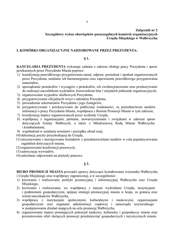 1 Załącznik nr 2 Szczegółowy wykaz obowiązków poszczególnych komórek organizacyjnych Urzędu Miejskiego w Wałbrzychu I. KOMÓRKI ORGANIZACYJNE NADZOROWANE PRZEZ PREZYDENTA: § 1. KANCELARIA PREZYDENTA wykonuje zadania z zakresu obsługi pracy Prezydenta i spraw przekazanych przez Prezydenta Miasta poprzez: 1) koordynację prawidłowego przygotowania narad, odpraw, posiedzeń i spotkań organizowanych przez Prezydenta, ustalanie ich harmonogramu oraz zapewnienie prawidłowego przygotowania materiałów, 2) sporządzanie protokołów i wyciągów z protokołów, ich ewidencjonowanie oraz przekazywanie do realizacji naczelnikom wydziałów, kierownikom biur i miejskich jednostek organizacyjnych, 3) organizowanie wyjazdów służbowych Prezydenta, 4) przygotowywanie oficjalnych wizyt z udziałem Prezydenta, 5) prowadzenie sekretariatów Prezydenta i jego Zastępców, 6) przygotowywanie i przekazywanie do publicznej wiadomości, za pośrednictwem mediów informacji o pracy Prezydenta Miasta, współpraca z Biurem Promocji Miasta w tym zakresie, 7) koordynację imprez organizowanych przez wydziały Urzędu, 8) współpracę z organizacjami, partiami, stowarzyszeniami i związkami w zakresie spraw dotyczących Gminy Wałbrzych, a także z Młodzieżową Radą Miasta Wałbrzycha i kombatantami, 9) współudział w ustalaniu terminów i porządku obrad sesji, 10) dekretację poczty przychodzącej do Urzędu, 11) utrzymywanie i nawiązywanie kontaktów z przedstawicielami mediów w celu popularyzowania zagadnień dotyczących miasta, 12) organizowanie konferencji prasowych, 13) autoryzację wywiadów, 14) udzielanie odpowiedzi na artykuły prasowe. § 2. BIURO PROMOCJI MIASTA prowadzi sprawy dotyczące kształtowania wizerunku Wałbrzycha i Urzędu Miejskiego oraz współpracy zagranicznej, a w szczególności: 1) kreowanie i realizowanie polityki promocyjnej i informacyjnej Wałbrzycha oraz Urzędu Miejskiego, 2) kreowanie i realizowanie, we współpracy z innymi wydziałami Urzędu, instytucjami i podmiotami gospodarczymi, spójnej strategii promocyjnej miasta w kraju, za granicą oraz wśród mieszkańców Wałbrzycha, 3) współpraca z instytucjami społecznymi, kulturalnymi i naukowymi, organizacjami gospodarczymi oraz organami administracji rządowej i samorządu terytorialnego w podejmowaniu działań mających na celu promocję Wałbrzycha, 4) organizowanie imprez promujących potencjał naukowy, kulturalny i gospodarczy miasta oraz prezentowanie ofert służących promocji przedsięwzięć gospodarczych i turystycznych miasta 2 w kraju i za granicą, takich jak: targi turystyczne, gospodarcze, konferencje, seminaria, misje gospodarcze, 5) podejmowanie i inicjowanie działań mających na celu upowszechnianie wiedzy o Wałbrzychu wśród mieszkańców miasta i kraju, 6) przygotowywanie materiałów reklamowo-informacyjnych, promujących Wałbrzych jako miejsce atrakcyjne dla potencjalnych inwestorów i turystów (książki, albumy, plakaty, ulotki, gadżety itp.), 7) pozyskiwanie sponsorów dla miejskich działań promocyjnych oraz współpraca ze środkami masowego przekazu w zakresie promocji miasta, 8) wspieranie przedsięwzięć promocyjnych organizowanych przez instytucje pozarządowe i rozpatrywanie wniosków o ich dofinansowanie, 9) prowadzenie i aktualizowanie strony internetowej miasta Wałbrzycha, 10) rozwijanie kontaktów z innymi miastami, samorządem powiatowym i wojewódzkim oraz organizacjami krajowymi i zagranicznymi w celu wspólnych działań promujących Wałbrzych i Dolny Śląsk, 11) współpraca z instytucjami, organizacjami i podmiotami gospodarczymi w zakresie opracowywania i realizacji materiałów promocyjnych o mieście, 12) dystrybucja materiałów promocyjnych oraz prowadzenie związanych z tym czynności organizacyjno-finansowych, 13) obsługa kontaktów zagranicznych miasta, w tym organizację współpracy miasta w ramach umów partnerskich z miastami zagranicznymi oraz przynależność miasta do stowarzyszeń i organizacji międzynarodowych, 14) organizowanie pobytu i obsługę techniczno-tłumaczeniowa zagranicznych gości miasta, 15) współpraca z placówkami konsularnymi w celu upowszechniania wiedzy o Wałbrzychu jako mieście atrakcyjnym dla turystów i inwestorów, 16) współpraca z Ministerstwem Spraw Zagranicznych oraz przedstawicielstwami rządu RP za granicą w zakresie organizacji kontaktów międzynarodowych i promocji miasta, 17) prowadzenie spraw dotyczących współpracy Wałbrzycha z miastami partnerskimi, 18) inspirowanie, inicjowanie, organizowanie i koordynowanie projektów oraz przedsięwzięć prowadzonych przez Gminę, dotyczących współpracy z miastami partnerskimi oraz innymi partnerami zagranicznymi, 19) załatwianie spraw związanych z wydawaniem przez Prezydenta Miasta zgody na stosowanie herbu i logo miasta Wałbrzycha dla celów służących do oznaczania nazwy firm, towarów, usług i in. § 3. BIURO OCHRONY I REAGOWANIA KRZYZYSOWEGO zapewnia ochronę przed nadzwyczajnymi zagrożeniami dla życia i zdrowia ludzi oraz środowiska, prowadzi sprawy z zakresu obronności, czuwa nad przestrzeganiem zasad ochrony informacji niejawnych, a w szczególności: 1. Miejskie Centrum Zarządzania Kryzysowego wykonuje zadania poprzez: 1)prace planistyczne w zakresie: a)reagowania kryzysowego, b)ochrony przeciwpowodziowej, c)ochrony infrastruktury krytycznej. 3 2) kierowanie działaniami związanymi z monitorowaniem, reagowaniem i usuwaniem skutków zagrożeń na terenie miasta, 3) zarządzanie, organizowanie i prowadzenie szkoleń, ćwiczeń i treningów z zakresu reagowania na potencjalne zagrożenia, 4) wykonywanie przedsięwzięć wynikających z planu operacyjnego funkcjonowania miasta, 5) przeciwdziałanie skutkom zdarzeń o charakterze terrorystycznym, 6) realizację zadań z zakresu ochrony infrastruktury krytycznej, 7) współdziałanie z centrami zarządzania kryzysowego organów administracji publicznej, 8) nadzór nad f