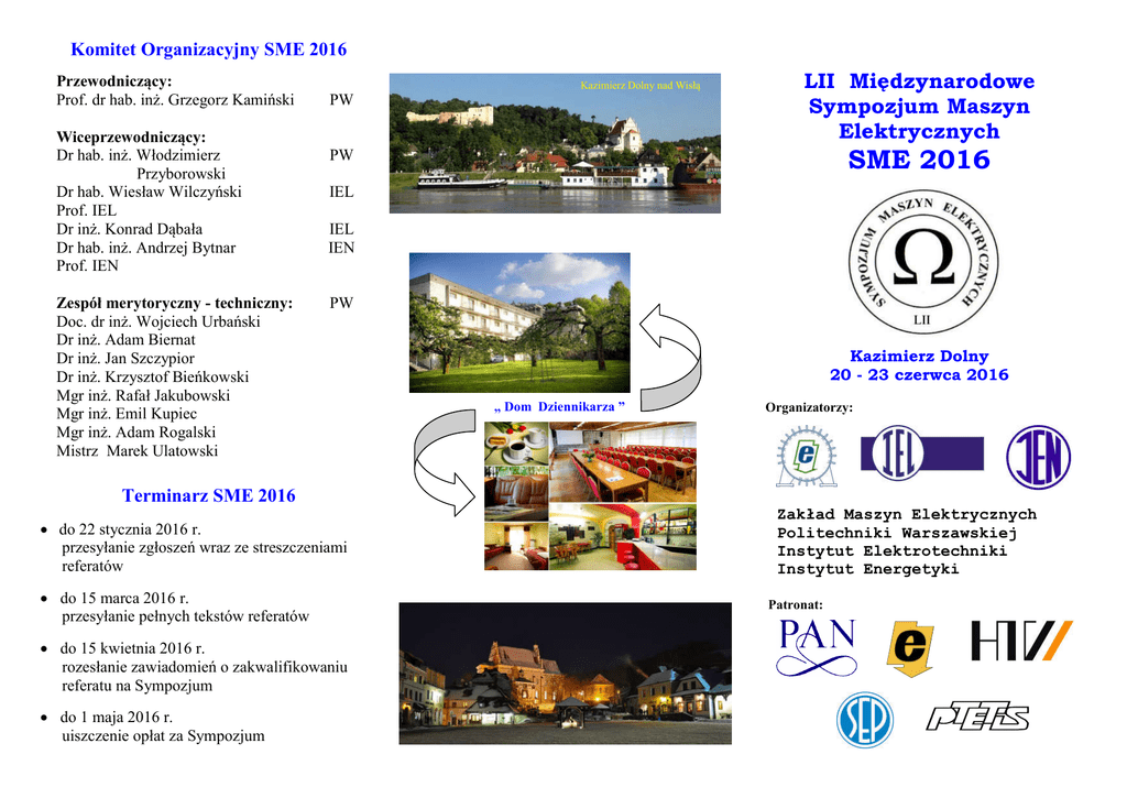 Komitet Organizacyjny SME 2016 Przewodniczący: Prof. dr hab. inż. Grzegorz Kamiński Wiceprzewodniczący: Dr hab. inż. Włodzimierz Przyborowski Dr hab. Wiesław Wilczyński Prof. IEL Dr inż. Konrad Dąbała Dr hab. inż. Andrzej Bytnar Prof. IEN Zespół merytoryczny - techniczny: Doc. dr inż. Wojciech Urbański Dr inż. Adam Biernat Dr inż. Jan Szczypior Dr inż. Krzysztof Bieńkowski Mgr inż. Rafał Jakubowski Mgr inż. Emil Kupiec Mgr inż. Adam Rogalski Mistrz Marek Ulatowski PW LII Międzynarodowe Sympozjum Maszyn Elektrycznych PW SME 2016 Kazimierz Dolny nad Wisłą IEL IEL IEN PW Kazimierz Dolny 20 - 23 czerwca 2016 „ Dom Dziennikarza ” Organizatorzy: Terminarz SME 2016 do 22 stycznia 2016 r. przesyłanie zgłoszeń wraz ze streszczeniami referatów do 15 marca 2016 r. przesyłanie pełnych tekstów referatów do 15 kwietnia 2016 r. rozesłanie zawiadomień o zakwalifikowaniu referatu na Sympozjum do 1 maja 2016 r. uiszczenie opłat za Sympozjum Zakład Maszyn Elektrycznych Politechniki Warszawskiej Instytut Elektrotechniki Instytut Energetyki Patronat: SYMPOZJUM MASZYN ELEKTRYCZNYCH SME 2016 będzie spotkaniem krajowych oraz zagranicznych pracowników ośrodków naukowych i przemysłowych zajmujących się szeroko pojętą tematyką maszyn elektrycznych. Organizowane jest w terminie szczególnym. Oto w 2016 roku społeczność elektryków polskich obchodzić będzie dwa znaczące jubileusze: 95-lecie Wydziału Elektrycznego PW oraz jubileusz 100-lecia urodzin profesora Władysława Latka. To 14 czerwca 1921 roku rozpoczął pracę dydaktyczną i naukową najstarszy dziś w kraju fakultet elektrotechniczny – jako w pełni samodzielna jednostka Politechniki Warszawskiej . Z Wydziałem tym związał swą kilkudziesięcioletnią zawodową aktywność wybitny specjalista maszyn elektrycznych, wychowawca wielu pokoleń młodzieży akademickiej Władysław Latek. Obie, piękne rocznice sprawiły że rok 2016 został uznany ROKIEM PROFESORA WŁADYSŁAWA LATKA przez Polskie Towarzystwo Elektrotechniki Teoretycznej i Stosowanej oraz Stowarzyszenie Elektryków Polskich. Profesor był twórcą ośrodka naukowo-badawczego, zajmującego się projektowaniem, analizą stanów ustalonych i przejściowych oraz eksploatacją maszyn prądu przemiennego dużej mocy, zwłaszcza turbogeneratorów. Był autorem dzieł naukowych, istotnych opracowań dla przemysłu oraz cennych monografii i podręczników. Piastował funkcję dziekana Wydziału Elektrycznego, czynnie angażował się w zadania SEP i PTETiS. To Władysławowi Latkowi środowisko elektrotechników zawdzięcza także swe coroczne konferencje – Sympozja Maszyn Elektrycznych SME, nieprzerwanie organizowane od 1965 roku. Prof. dr inż. Władysław Latek (1916-1991) Miejsce i termin Sympozjum SME 2016 odbędzie się w Kazimierzu Dolnym, miejscowości pięknie położonej nad Wisłą w dniach 20 – 23 czerwca 2016 roku. Koszt Sympozjum Kazimierz Dolny nad Wisłą Planowany koszt uczestnictwa w Sympozjum wynosi 1800 zł i obejmuje: - zakwaterowanie i wyżywienie; - materiały konferencyjne; - imprezy towarzyszące. Dla studentów i doktorantów przewiduje się zniżkową opłatę (1000 zł). Zgłoszenie udziału Tematyka SME 2016 1. Konstrukcje przetworników elektromechanicznych. 2. Maszyny specjalne. 3. Modele matematyczne i symulacja. 4. Projektowanie i optymalizacja. 5. Pomiary, diagnostyka i monitoring. 6. Sprawność i straty w maszynach elektrycznych. 7. Eksploatacja systemów napędowych. 8. Współpraca maszyn elektrycznych z urządzeniami energoelektronicznymi. 9. Współczesne technologie maszyn elektrycznych. 10. Zagadnienia oddziaływań na środowisko naturalne. 11. Dydaktyka maszyn elektrycznych. 12. Trendy dyscypliny. Zgłoszenia udziału w Sympozjum oraz streszczenia referatów prosimy przesyłać na karcie zgłoszenia uczestnictwa umieszczonej na stronie www.sme16.iel.waw.pl pocztą elektroniczną na adres organizatora ([email protected]). Wszystkie referaty będą recenzowane, a po ich zakwalifikowaniu zostaną umieszczone w materiałach konferencyjnych. Po obradach Sympozjum wybrane referaty będą drukowane w Przeglądzie Elektrotechnicznym albo w Pracach Instytutu Elektrotechniki. Informacje dodatkowe Oficjalnymi językami Sympozjum będą polski i angielski. Informacje o Sympozjum można znaleźć pod adresem: www.sme16.iel.waw.pl