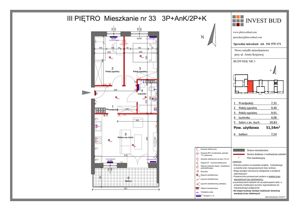 III PIĘTRO Mieszkanie nr 33 3P+AnK/2P+K 116 145 146 200 INVEST BUD www.pbinvestbud.com hp 90 hp 35 N CV22/500x600 [email protected] CV22/500x600 RTV 116 24 Sprzedaż mieszkań: tel. 511 575 171 RTV 50 146 Nowe osiedle mieszkaniowe przy ul. Armii Krajowej 268 240 Ośw. Ośw. 405 72 355 100 BUDYNEK NR 3 2 3 Pokój sypialny Pokój sypialny 3 2 N 1 0 SAN11 05 P TM 348 4 Ośw. 250 Łazienka 275 Ośw. D 1 0 1 2 3 0 1 2 3 Przedpokój 157 110 325 1 2 Przedpokój Pokój sypialny 7,32 9,40 3 Pokój sypialny 9,91 4 5 Łazienka Salon z an. kuch. Pow. użytkowa 6 OK 51,54m2 balkon 7,54 405 5 Salon z an. kuch. 3F 4,08 20,83 Ośw. Ośw. 110 Gniazdo elektryczne RTV Gniazdo RTV (multimedia, petrotel, TV naziemna) 110 Gniazdo elektryczne na wys.110 cm 3F Wypust 3F - kuchnia elektryczna OK Wypust zasilania okapu i oświetlenia podszafkowego D Domofon 516 Ściana nierozbieralna Ściana działowa z możliwością rozbiórki RTV L CV22/500x500 110 CV22/500x500 116 145 hp 90 160 Wypust oświetleniowy 6 Ośw. Łącznik oświetleniowy Balkon Łącznik oświetleniowy podwójny 551 TM Tablica mieszkaniowa Podejście wody CV22/500x500 Grzejnik C. O. Pion kanalizacyjny UWAGA: - Wymiary podano na postawie projektu budowlanego w świetle ścian niewyprawionych (bez tynków). - Mogą wystąpić nieznaczne odstępstwa w projekcie wykonawczym. - Powierzchnie pomieszczeń podano w świetle ścian wyprawionych (po otynkowaniu). -w pomieszczeniu łazienki nie są wykonywane tynki, a przewody instalacyjne są luźno wyprowadzone do indywidualnego podłączenia. - Na etapie budowy istnieje możliwość dowolnej aranżacji ścian działowych. data aktualizacji: 02,2017