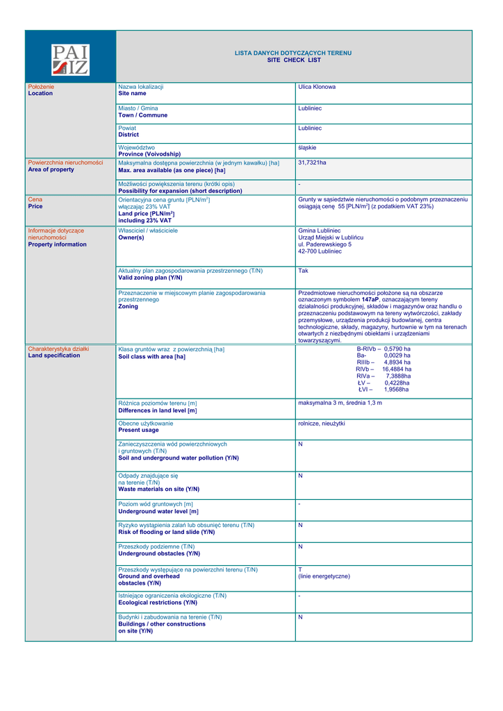 LISTA DANYCH DOTYCZĄCYCH TERENU SITE CHECK LIST Położenie Location Powierzchnia nieruchomości Area of property Cena Price Informacje dotyczące nieruchomości Property information Charakterystyka działki Land specification Nazwa lokalizacji Site name Ulica Klonowa Miasto / Gmina Town / Commune Lubliniec Powiat District Lubliniec Województwo Province (Voivodship) Maksymalna dostępna powierzchnia (w jednym kawałku) [ha] Max. area available (as one piece) [ha] śląskie Możliwości powiększenia terenu (krótki opis) Possibility for expansion (short description) Orientacyjna cena gruntu [PLN/m2] włączając 23% VAT Land price [PLN/m2] including 23% VAT - 31,7321ha Grunty w sąsiedztwie nieruchomości o podobnym przeznaczeniu osiągają cenę 55 [PLN/m2] (z podatkiem VAT 23%) Własciciel / właściciele Owner(s) Gmina Lubliniec Urząd Miejski w Lublińcu ul. Paderewskiego 5 42-700 Lubliniec Aktualny plan zagospodarowania przestrzennego (T/N) Valid zoning plan (Y/N) Tak Przeznaczenie w miejscowym planie zagospodarowania przestrzennego Zoning Przedmiotowe nieruchomości położone są na obszarze oznaczonym symbolem 147aP, oznaczającym tereny działalności produkcyjnej, składów i magazynów oraz handlu o przeznaczeniu podstawowym na tereny wytwórczości, zakłady przemysłowe, urządzenia produkcji budowlanej, centra technologiczne, składy, magazyny, hurtownie w tym na terenach otwartych z niezbędnymi obiektami i urządzeniami towarzyszącymi. B-RIVb – 0,5790 ha Ba0,0029 ha RIIIb – 4,8934 ha RIVb – 16,4884 ha RIVa – 7,3888ha ŁV – 0,4228ha ŁVI – 1,9568ha Klasa gruntów wraz z powierzchnią [ha] Soil class with area [ha] Różnica poziomów terenu [m] Differences in land level [m] maksymalna 3 m, średnia 1,3 m Obecne użytkowanie Present usage rolnicze, nieużytki Zanieczyszczenia wód powierzchniowych i gruntowych (T/N) Soil and underground water pollution (Y/N) N Odpady znajdujące się na terenie (T/N) Waste materials on site (Y/N) N Poziom wód gruntowych [m] Underground water level [m] - Ryzyko wystąpienia zalań lub obsunięć terenu (T/N) Risk of flooding or land slide (Y/N) N Przeszkody podziemne (T/N) Underground obstacles (Y/N) N Przeszkody występujące na powierzchni terenu (T/N) Ground and overhead obstacles (Y/N) T (linie energetyczne) Istniejące ograniczenia ekologiczne (T/N) Ecological restrictions (Y/N) - Budynki i zabudowania na terenie (T/N) Buildings / other constructions on site (Y/N) N Ograniczenia budowlane Building restrictions Połączenia transportowe Transport links Procent dopuszczalnej zabudowy Building coverage [%] - intensywność zabudowy w granicach do 2 lub powierzchnia zabudowana w granicach do 80%, - minimalny udział powierzchni biologicznie czynnej – 20%, Ograniczenia wysokości budynków [m] Building height limit [m] wysokość zabudowy – nie przekraczająca uzasadnionych potrzeb technologicznych Strefa buforowa [m] Buffer zone [m] Nieprzekraczalna linia zabudowy w odległości: - 8,0 m od zewnętrznej krawędzi jezdni publicznych dróg zbiorczych (KDz) od ul. Częstochowskiej i 10,0 m od ul. Klonowej - 6,0 m od linii rozgraniczających pas drogowy dróg wewnętrznych (KDW) Inne, jeśli występują Others if any Droga dojazdowa do terenu (rodzaj drogi i jej szerokość) Access road to the plot (type and width of access road) - Autostrada / droga krajowa [km] Nearest motorway / national road [km] Droga krajowa Nr 46 – 2 km Kolej [km] Railway line [km] Lubliniec, 2 km Bocznica kolejowa [km] Railway siding [km] Przylega do nieruchomości Najbliższe lotnisko międzynarodowe [km] Nearest international airport [km] Katowice-Pyrzowice 40 km Najbliższe miasto wojewódzkie [km] Nearest province capital [km] Katowice – 60 km Opole - 60 km Wrocław - 150 km Droga gminna, asfalt. – szer.10 m Istniejąca infrastruktura Existing infrastructure Elektryczność na terenie (T/N) Electricity (Y/N) • • • Odległość przyłącza od granicy terenu Connection point (distance from boundary) [m] Napięcie Voltage [kV] 110/15 kW Dostępna moc Available capacity [MW] 5MW Gaz na terenie (T/N) Gas (Y/N) • • • • Odległość przyłącza od granicy działki Connection point (distance from boundary) [m] Wartość kaloryczna Calorific value [MJ/Nm3] • • • ok. 1000 m - 225 Dostępna objętość Available capacity [m3 /h ] 4900m Odległość przyłącza od granicy terenu Connection point (distance from boundary) [m] Dostępna objętość Available capacity [m3/24h] Kanalizacja na terenie (T/N) Sewage discharge (Y/N) • N Konieczna budowa instalacji doprowadzającej gaz przez rozbudowę gazociągu Ø225 od istniejącej stacji redukcyjnej gazu przy ul. Powstańców Śl. Średnica rury Pipe diameter [mm] Woda na terenie (T/N) Water supply (Y/N) • N Konieczna budowa instalacji doprowadzającej energię elektryczną z istniejącego Głównego Punktu Zasilania (110/15kW) przy ulicy Powstańców Śląskich i Klonowej ok. 600 m Odległość przyłącza od granicy terenu Connection point (distance from boundary) [m] Dostępna objętość Available capacity [m3/24h] Ograniczenie zrzutu ścieków Limitation of discharge 3 /h T Budowa instalacji doprowadzającej wodę z istniejącego wodociągu Ø 150 biegnącego przy ul. Klonowej ok. 50 m 720 m3/24h N Odprowadzenie nieczystości ciekłych do istniejącego kolektora sanitarnego Ks Ø300 znajdującego się na rogu ulic KW. Niegolewskich i Klonowej ok. 150 m - Dla ścieków przemysłowych zgodnie z rozporządzeniem Ministra Budownictwa z dn. 14.07.2006r. Dz.U. nr 136 poz 964 w uzupełnieniu określa się: Zawiesiny ogólne – 500mg/dm3 i poniżej ChZT – 1000mg O2/dm3 i poniżej BZT5 – 250mg O2/dm3 i poniżej Fosfor ogólny – 15mg P/dm3 i poniżej Odprowadzenie wód deszczowych na terenie (T/N) Rain water discharge (Y/N) T Doprowadzenie wód opadowych do istniejącego kolektora deszczowego Ø500 znajdującego się przy ul. Klonowej Oczyszczalnia ścieków na terenie bądź w bezp
