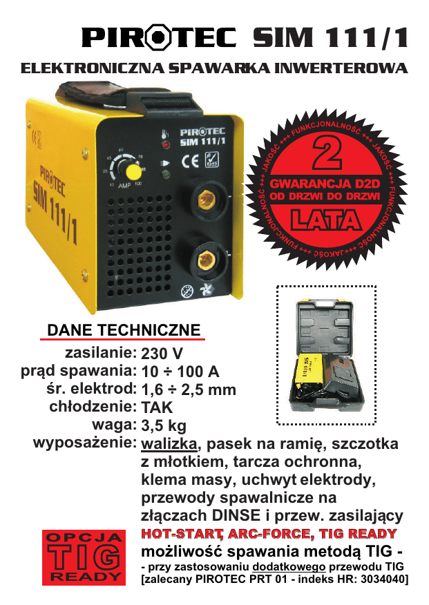 SIM 111/1 ELEKTRONICZNA SPAWARKA INWERTEROWA DANE TECHNICZNE zasilanie: 230 V pr¹d spawania: 10 ÷ 100 A œr. elektrod: 1,6 ÷ 2,5 mm ch³odzenie: TAK waga: 3,5 kg wyposa¿enie: walizka, pasek na ramiê, szczotka z m³otkiem, tarcza ochronna, klema masy, uchwyt elektrody, przewody spawalnicze na z³¹czach DINSE i przew. zasilaj¹cy OPCJA HOT-START, ARC-FORCE, TIG READY mo¿liwoœæ spawania metod¹ TIG READY - przy zastosowaniu dodatkowego przewodu TIG [zalecany PIROTEC PRT 01 - indeks HR: 3034040]