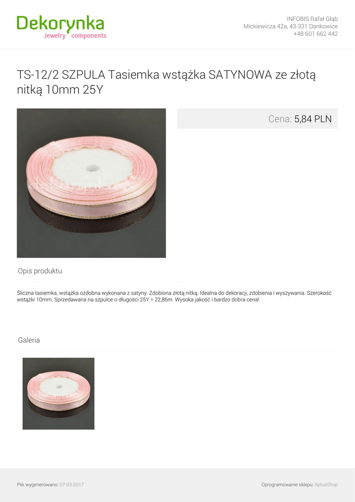 INFOBIS Rafał Głąb Mickiewicza 42a, 43-331 Dankowice +48 601 662 442 TS-12/2 SZPULA Tasiemka wstążka SATYNOWA ze złotą nitką 10mm 25Y Cena: 5,84 PLN Opis produktu Śliczna tasiemka, wstążka ozdobna wykonana z satyny. Zdobiona złotą nitką. Idealna do dekoracji, zdobienia i wyszywania. Szerokość wstążki 10mm. Sprzedawana na szpulce o długości 25Y = 22,86m. Wysoka jakość i bardzo dobra cena! Galeria Plik wygenerowano: 07-03-2017 Powered by TCPDF (www.tcpdf.org) Oprogramowanie sklepu: AptusShop