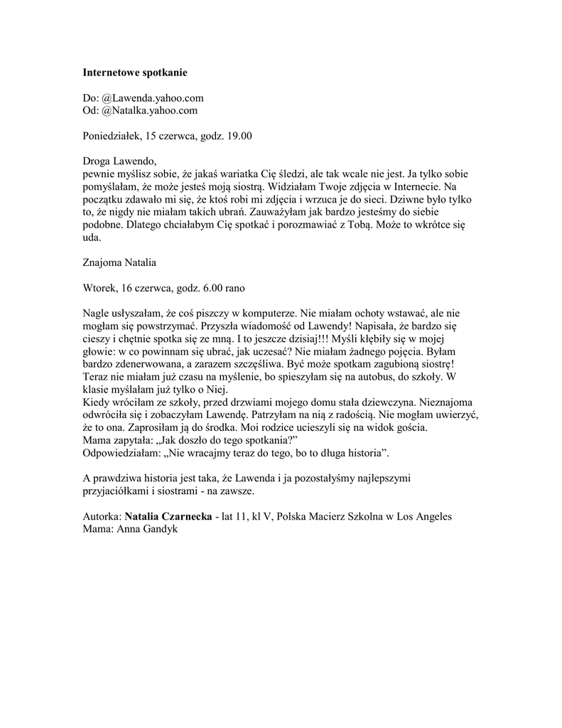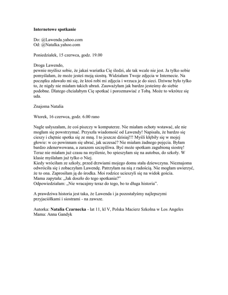 Internetowe spotkanie Do: @Lawenda.yahoo.com Od: @Natalka.yahoo.com Poniedziałek, 15 czerwca, godz. 19.00 Droga Lawendo, pewnie myślisz sobie, że jakaś wariatka Cię śledzi, ale tak wcale nie jest. Ja tylko sobie pomyślałam, że może jesteś moją siostrą. Widziałam Twoje zdjęcia w Internecie. Na początku zdawało mi się, że ktoś robi mi zdjęcia i wrzuca je do sieci. Dziwne było tylko to, że nigdy nie miałam takich ubrań. Zauważyłam jak bardzo jesteśmy do siebie podobne. Dlatego chciałabym Cię spotkać i porozmawiać z Tobą. Może to wkrótce się uda. Znajoma Natalia Wtorek, 16 czerwca, godz. 6.00 rano Nagle usłyszałam, że coś piszczy w komputerze. Nie miałam ochoty wstawać, ale nie mogłam się powstrzymać. Przyszła wiadomość od Lawendy! Napisała, że bardzo się cieszy i chętnie spotka się ze mną. I to jeszcze dzisiaj!!! Myśli kłębiły się w mojej głowie: w co powinnam się ubrać, jak uczesać? Nie miałam żadnego pojęcia. Byłam bardzo zdenerwowana, a zarazem szczęśliwa. Być może spotkam zagubioną siostrę! Teraz nie miałam już czasu na myślenie, bo spieszyłam się na autobus, do szkoły. W klasie myślałam już tylko o Niej. Kiedy wróciłam ze szkoły, przed drzwiami mojego domu stała dziewczyna. Nieznajoma odwróciła się i zobaczyłam Lawendę. Patrzyłam na nią z radością. Nie mogłam uwierzyć, że to ona. Zaprosiłam ją do środka. Moi rodzice ucieszyli się na widok gościa. Mama zapytała: „Jak doszło do tego spotkania?” Odpowiedziałam: „Nie wracajmy teraz do tego, bo to długa historia”. A prawdziwa historia jest taka, że Lawenda i ja pozostałyśmy najlepszymi przyjaciółkami i siostrami - na zawsze. Autorka: Natalia Czarnecka - lat 11, kl V, Polska Macierz Szkolna w Los Angeles Mama: Anna Gandyk