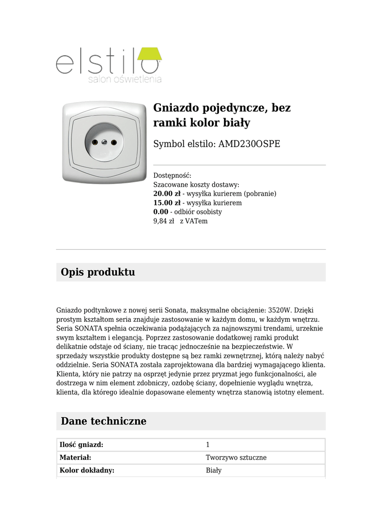 Gniazdo pojedyncze, bez ramki kolor biały Symbol elstilo: AMD230OSPE Dostępność: Szacowane koszty dostawy: 20.00 zł - wysyłka kurierem (pobranie) 15.00 zł - wysyłka kurierem 0.00 - odbiór osobisty 9,84 zł z VATem Opis produktu Gniazdo podtynkowe z nowej serii Sonata, maksymalne obciążenie: 3520W. Dzięki prostym kształtom seria znajduje zastosowanie w każdym domu, w każdym wnętrzu. Seria SONATA spełnia oczekiwania podążających za najnowszymi trendami, urzeknie swym kształtem i elegancją. Poprzez zastosowanie dodatkowej ramki produkt delikatnie odstaje od ściany, nie tracąc jednocześnie na bezpieczeństwie. W sprzedaży wszystkie produkty dostępne są bez ramki zewnętrznej, którą należy nabyć oddzielnie. Seria SONATA została zaprojektowana dla bardziej wymagającego klienta. Klienta, który nie patrzy na osprzęt jedynie przez pryzmat jego funkcjonalności, ale dostrzega w nim element zdobniczy, ozdobę ściany, dopełnienie wyglądu wnętrza, klienta, dla którego idealnie dopasowane elementy wnętrza stanowią istotny element. Dane techniczne Ilość gniazd: 1 Materiał: Tworzywo sztuczne Kolor dokładny: Biały Uziemienie: Brak Stopień ochrony: IP20 Napięcie znamionowe [V]: 230 Prąd znamionowy [A]: 16 Montaż: Podtynkowy Podświetlanie: Nie Typ: Gniazda elektryczne Rodzina: Ton Color System Kolor: Biały