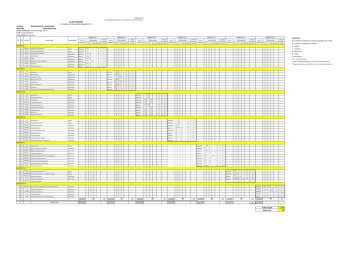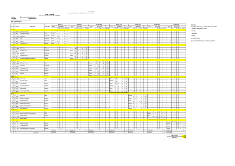 Załącznik nr 2 do Zarządzenia Rektora nr 18/2013 z 14 czerwca 2013 r. PLAN STUDIÓW Obowiązuje od roku akademickiego 2014/15 Elektrotechniki i Automatyki Elektrotechnika WYDZIAŁ: KIERUNEK: poziom kształcenia: studia pierwszego stopnia profil : ogólnoakademicki forma studiów: stacjonarne SEMESTR I Lp. O/F symbol* nazwa zajęć grupa zajęć** forma zaliczenia SEMESTR II SEMESTR III liczba liczba liczba godzin forma punktów punktów l p/s razem ECTS zaliczenia w ć l p/s razem ECTS liczba godzin w ć forma zaliczenia SEMESTR IV liczba forma punktów p/s razem ECTS zaliczenia w liczba godzin w ć l SEMESTR V liczba forma punktów p/s razem ECTS zaliczenia w liczba godzin ć l SEMESTR VI liczba forma punktów p/s razem ECTS zaliczenia liczba godzin ć l SEMESTR VII liczba forma punktów p/s razem ECTS zaliczenia w liczba godzin w ć l objaśnienia: liczba punktów p/s razem ECTS liczba godzin ć l SEMESTR I O - przedmiot obowiązkowy do zaliczenia danego roku studiów F - przedmiot fakultatywny (do wyboru) w - wykład 1 O HUMAN_1 Przedmiot humanistyczny I ogólne zaliczenie 30 30 2 2 O MKPO_1 ć - ćwiczenia Technologie informacyjne ogólne zaliczenie 30 30 2 3 O MKPO_2 4 O Mat_1 l - laboratorium Propedeutyka matematyki podstawowe zaliczenie 30 30 60 4 p - projekt egzamin 30 30 60 5 5 O MKPO_3 s - seminarium podstawowe egzamin 45 30 75 6 staż - moduł opcjonalny 6 O 7 O MKOB_25 Geometria i grafika inżynierska podstawowe zaliczenie 15 30 3 *symbol modułu/przedmiotu na kierunku i poziomie kształcenia MKOB_1 Mechanika kierunkowe zaliczenie 30 15 45 4 8 O **grupy zajęć zgodne z załącznikiem nr 1 do niniejszego zarządzenia ObwEl_1 Obwody elektryczne I kierunkowe egzamin 30 30 60 4 Matematyka I podstawowe Fizyka 15 SEMESTR II 9 O JO_1 Język obcy I ogólne zaliczenie 10 O Mat_2 Matematyka II podstawowe egzamin 30 30 1 45 60 105 11 O MKPO_4 Laboratorium fizyki podstawowe zaliczenie 7 30 12 O MKPO_5 Metody numeryczne podstawowe zaliczenie 15 30 2 45 13 O Info_1 Informatyka I podstawowe zaliczenie 30 4 45 14 O ObwEl_2 Obwody elektryczne II kierunkowe egzamin 5 30 30 60 15 O MKOB_2 Metrologia kierunkowe 6 egzamin 30 30 16 O MKOB_4 Technologie wytwarzania energii elektrycznej kierunkowe 3 zaliczenie 30 30 2 30 15 SEMESTR III 17 O JO_3 Język obcy II ogólne zaliczenie 30 30 1 18 O WF_2 Wychowanie fizyczne I ogólne zaliczenie 30 30 1 19 O Info_2 Informatyka II podstawowe zaliczenie 15 30 45 3 20 O MKOB_24 Inżynieria materiałowa kierunkowe zaliczenie 30 15 45 4 21 O ObwEl_3 Obwody elektryczne III kierunkowe egzamin 15 45 4 22 O MKOB_3 Laboratorium metrologii kierunkowe zaliczenie 30 30 2 23 O MKOB_5 Elektrodynamika kierunkowe egzamin 30 15 45 5 24 O MKOB_6 Elektronika kierunkowe egzamin 30 30 60 5 25 O MKOB_7 Maszyny elektryczne kierunkowe egzamin 30 30 60 5 30 SEMESTR IV 26 O JO_3 Język obcy III ogólne zaliczenie 30 30 1 27 O WF_2 Wychowanie fizyczne II ogólne zaliczenie 30 30 1 28 O MKOB_8 Podstawy automatyki kierunkowe zaliczenie 30 15 45 4 29 O MKOB_9 Energoelektronika kierunkowe egzamin 30 15 15 60 4 30 O MKOB_10 Techniki mikroprocesorowe kierunkowe zaliczenie 30 30 60 4 31 O MKOB_11 Napęd elektryczny kierunkowe egzamin 30 15 45 4 32 O MKOB_12 Elektroenergetyka kierunkowe egzamin 30 15 45 4 33 O MKOB_13 Technika wysokich napięć kierunkowe egzamin 30 15 45 4 34 O MKOB_14 Inżynieria elektryczna w transporcie kierunkowe zaliczenie 30 15 45 4 SEMESTR V 35 O ogólne zaliczenie 30 2 36 O MKOB_15 Sygnały i systemy dynamiczne JO_4 kierunkowe zaliczenie 30 15 45 4 37 O MKOB_16 Sterowniki programowalne kierunkowe egzamin 30 15 15 60 4 38 O MKOB_17 Urządzenia elektryczne kierunkowe egzamin 15 15 30 4 39 O MKOB_18 Instalacje elektryczne i technika oświetleniowa kierunkowe egzamin 30 60 5 40 O MKOB_19 Systemy elektroenergetyczne kierunkowe zaliczenie 30 15 45 3 41 O MKOB_20 Inżynieria systemów alarmowych kierunkowe zaliczenie 15 15 30 2 42 O MKOB_21 Przemysłowe sieci informatyczne kierunkowe zaliczenie 15 15 30 2 43 F kierunkowe zaliczenie 30 30 60 4 PO_1 Język obcy IV Przedmioty obieralne I 30 30 SEMESTR VI 44 O HUMAN_2 Przedmiot humanistyczny II ogólne zaliczenie 30 45 O EKONOM ogólne zaliczenie 15 46 O MKOB_22 Budynek inteligentny kierunkowe egzamin 15 47 F kierunkowe egzamin 120 48 O PO_2 Rachunek ekonomiczny i zarządzanie energią Przedmioty obieralne II 30 15 60 30 30 PRAKTYKA Praktyka zawodowa 30 3 45 4 30 3 240 16 4 SEMESTR VII 49 O 50 O MKOB_23 Bezpieczeństwo użytkowania urządzeń elektrycznych SD 51 O PracDyp 52 O PD 53 O PdED kierunkowe zaliczenie Seminarium dyplomowe kierunkowe zaliczenie 15 15 1 Pracownia dyplomowa kierunkowe zaliczenie 60 60 11 Praca dyplomowa kierunkowe zaliczenie 0 10 Przygotowanie do egzaminu dyplomowego kierunkowe egzamin 0 ŁĄCZNIE PRAKTYKA 390 30 ŁĄCZNIE 375 30 ŁĄCZNIE 390 30 ŁĄCZNIE 405 30 ŁĄCZNIE 390 30 ŁĄCZNIE 345 30 30 ŁĄCZNIE 15 45 120 3 5 30 4 SUMA GODZIN 2415 SUMA ECTS 210