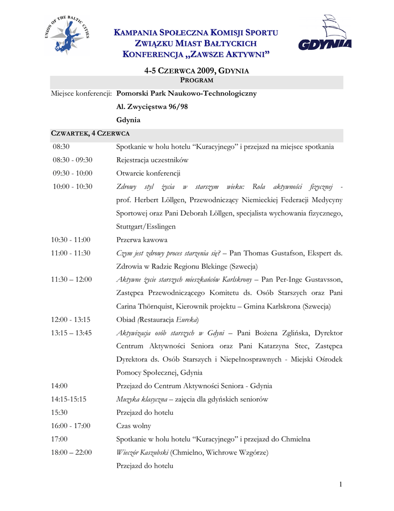 KAMPANIA SPOŁECZNA KOMISJI SPORTU ZWIĄZKU MIAST BAŁTYCKICH KONFERENCJA ,,ZAWSZE AKTYWNI” 4-5 CZERWCA 2009, GDYNIA PROGRAM Miejsce konferencji: Pomorski Park Naukowo-Technologiczny Al. Zwycięstwa 96/98 Gdynia CZWARTEK, 4 CZERWCA 08:30 Spotkanie w holu hotelu “Kuracyjnego” i przejazd na miejsce spotkania 08:30 - 09:30 Rejestracja uczestników 09:30 - 10:00 Otwarcie konferencji 10:00 - 10:30 Zdrowy styl życia w starszym wieku: Rola aktywności fizycznej - prof. Herbert Löllgen, Przewodniczący Niemieckiej Federacji Medycyny Sportowej oraz Pani Deborah Löllgen, specjalista wychowania fizycznego, Stuttgart/Esslingen 10:30 - 11:00 Przerwa kawowa 11:00 - 11:30 Czym jest zdrowy proces starzenia się? – Pan Thomas Gustafson, Ekspert ds. Zdrowia w Radzie Regionu Blekinge (Szwecja) 11:30 – 12:00 Aktywne życie starszych mieszkańców Karlskrony – Pan Per-Inge Gustavsson, Zastępca Przewodniczącego Komitetu ds. Osób Starszych oraz Pani Carina Thörnquist, Kierownik projektu – Gmina Karlskrona (Szwecja) 12:00 - 13:15 Obiad (Restauracja Eureka) 13:15 – 13:45 Aktywizacja osób starszych w Gdyni – Pani Bożena Zglińska, Dyrektor Centrum Aktywności Seniora oraz Pani Katarzyna Stec, Zastępca Dyrektora ds. Osób Starszych i Niepełnosprawnych - Miejski Ośrodek Pomocy Społecznej, Gdynia 14:00 Przejazd do Centrum Aktywności Seniora - Gdynia 14:15-15:15 Muzyka klasyczna – zajęcia dla gdyńskich seniorów 15:30 Przejazd do hotelu 16:00 - 17:00 Czas wolny 17:00 Spotkanie w holu hotelu “Kuracyjnego” i przejazd do Chmielna 18:00 – 22:00 Wieczór Kaszubski (Chmielno, Wichrowe Wzgórze) Przejazd do hotelu 1 PIĄTEK, 5 CZERWCA 09:30 Spotkanie w holu hotelu “Kuracyjnego” i przejazd na miejsce spotkania 10:00 – 10:45 Sport dla seniorów w Danii, Profesjonaliści v. amatorzy– Pan Carsten Hansen, Pani Ann Baunbæk Hansen, Konsultanci ds. Sportu - Danish Company Sport Association 10:45 – 11:15 Wstańmy z foteli – Pan Vegard Vige, Specjalista ds. Medycznych w Gminie Kristiansand (Norwegia) 11:15 – 11:45 Przerwa kawowa 11:45 – 12:15 Ćwicz w domu! – Pani Tiina Malmisalo, Doradca ds. Aktywności Fizycznej, Turku, Pani Heini Parkkunen, Dyrektor Wykonawczy – Stowarzyszenie Zdrowych Miast Regionu Morza Bałtyckiego (Finlandia) 12:15 - 13:00 Strefa tanga – prezentacja zajęć tanecznych dla osób starszych i niepełnosprawnych 13:30 – 15:00 Obiad 15:00 – 18:00 Zwiedzanie miasta 2