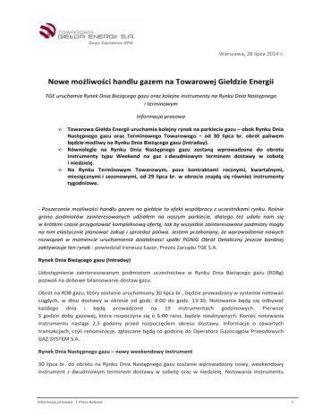 Warszawa, 28 lipca 2014 r. Nowe możliwości handlu gazem na Towarowej Giełdzie Energii TGE uruchamia Rynek Dnia Bieżącego gazu oraz kolejne instrumenty na Rynku Dnia Następnego i terminowym Informacja prasowa • • • Towarowa Giełda Energii uruchamia kolejny rynek na parkiecie gazu – obok Rynku Dnia Następnego gazu oraz Terminowego Towarowego – od 30 lipca br. obrót paliwem będzie możliwy na Rynku Dnia Bieżącego gazu (Intraday). Równolegle na Rynku Dnia Następnego gazu zostaną wprowadzone do obrotu instrumenty typu Weekend na gaz z dwudniowym terminem dostawy w sobotę i niedzielę. Na Rynku Terminowym Towarowym, poza kontraktami rocznymi, kwartalnymi, miesięcznymi i sezonowymi, od 29 lipca br. w obrocie znajdą się również instrumenty tygodniowe. - Poszerzenie możliwości handlu gazem na giełdzie to efekt współpracy z uczestnikami rynku. Rośnie grono podmiotów zainteresowanych udziałem na naszym parkiecie, dlatego też udało nam się w krótkim czasie przygotować kompleksową ofertę, tak by wszystkie zainteresowane podmioty mogły na nim elastycznie planować zakup i sprzedaż paliwa. Jestem przekonany, że wprowadzenie nowych rozwiązań w momencie uruchomienia działalności spółki PGNiG Obrót Detaliczny jeszcze bardziej zaktywizuje ten rynek - powiedział Ireneusz Łazor, Prezes Zarządu TGE S.A. Rynek Dnia Bieżącego gazu (Intraday) Udostępnienie zainteresowanym podmiotom uczestnictwa w Rynku Dnia Bieżącego gazu (RDBg) pozwoli na dobowe bilansowanie dostaw gazu. Obrót na RDB gazu, który zostanie uruchomiony 30 lipca br., będzie prowadzony w systemie notowań ciągłych, w dniu dostawy w okresie od godz. 8:00 do godz. 13:30. Notowania będą się odbywać każdego dnia i będą prowadzone na 19 instrumentach godzinowych. Pierwsze 5 godzin doby gazowej, która rozpoczyna się o 6:00 rano, będzie nieaktywnych. Koniec notowania instrumentu nastąpi 2,5 godziny przed rozpoczęciem okresu dostawy. Informacje o zawartych transakcjach, czyli renominacje, zgłaszane będą co godzinę do Operatora Gazociągów Przesyłowych GAZ-SYSTEM S.A. Rynek Dnia Następnego gazu – nowy weekendowy instrument 30 lipca br. do obrotu na Rynku Dnia Następnego gazu zostanie wprowadzony nowy, weekendowy instrument z dwudniowym terminem dostawy w sobotę oraz w niedzielę. Notowania instrumentu Informacja prasowa Ι Press Release 1 weekend będą prowadzone w systemie notowań ciągłych w czwartek i piątek. Przedmiotem obrotu będzie dostawa gazu w jednakowej ilości we wszystkich godzinach okresu dostawy. Nowy instrument weekendowy jest instrumentem typu BASE, jeden kontrakt odpowiada dostawie 1MWh gazu w każdej godzinie dnia dostawy. Informacje o zawartych transakcjach, czyli nominacje przekazywane będą do Operatora Gazociągów Przesyłowych GAZ-SYSTEM S.A. Rynek Terminowy Towarowy – nowy instrument tygodniowy na gaz 29 lipca br. do obrotu na Rynku Terminowym Towarowym zostanie wprowadzony nowy, tygodniowy instrument na gaz. Notowania na instrumentach tygodniowych będą prowadzone w systemie notowań ciągłych, od godz. 8:00 do godz. 14.00. Instrument tygodniowy to kontrakt na dostawę gazu w okresie od godz. 6:00 w poniedziałek do godz. 6:00 w kolejny poniedziałek. W obrocie będą dostępne cztery serie, z dostawą na cztery najbliższe tygodnie. Uczestnicy rynku gazu Obecnie bezpośrednio na RDNg działa 14 podmiotów, na RTT w zakresie instrumentów terminowych na gaz również 14 uczestników. Natomiast pośrednio - przez dom maklerski - działa 27 uczestników (tylko i wyłącznie poprzez domy maklerskie działają 23 spółki). *** Towarowa Giełda Energii S.A. (TGE) powstała pod koniec 1999 roku. Jest jedyną licencjonowaną giełdą energii w Polsce. Działalność operacyjną rozpoczęła 30 czerwca 2000 roku. Uruchomienie TGE było jednym z pierwszych działań w kierunku liberalizacji polskiego rynku energii elektrycznej i prywatyzacji sektora elektroenergetycznego. Od lutego 2012 r. TGE jest wyłączną własnością Giełdy Papierów Wartościowych w Warszawie. TGE prowadzi rynki: energii elektrycznej (Rynek Terminowy Towarowy - RTT, Rynek Dnia Następnego - RDN, Rynek Dnia Bieżącego - RDB) oraz gazu (RTT, RDNg), a także Rynek Praw Majątkowych. Jest obecnie najbardziej dynamicznie rozwijającą się giełdą towarową w regionie. Potwierdza to przynależność do organizacji EUROPEX, promującej idee konsolidacji rynków energetycznych poprzez połączenia transgraniczne i zrzeszającej wszystkie towarowe i finansowe giełdy energii w Europie. Od grudnia 2010 TGE i Nord Pool Spot prowadzą połączone rynki dnia następnego na zasadach market coupling na połączeniu Swe-Pol Link łączącym Szwecję i Polskę. Obrót na wszystkich parkietach dedykowanych energii elektrycznej w roku 2013 wyniósł 176,55 TWh, był wyższy o 33,76 proc. niż w roku 2012 - 132 TWh. Na rynku gazu całkowity wolumen obrotu osiągnął wartość 2 393 418 MWh - to jest szacunkowo 214 656 323 m3 gazu. www.tge.pl Kontakt dla mediów: Towarowa Giełda Energii S.A.; [email protected], +48 885 885 645, +48 607 030 573 Informacja prasowa Ι Press Release 2