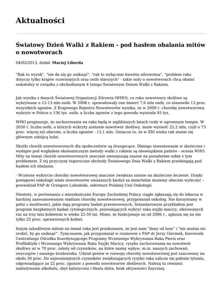 Aktualności Światowy Dzień Walki z Rakiem - pod hasłem obalania mitów o nowotworach 04/02/2013, dodał: Maciej Liberda "Rak to wyrok", "nie da się go uniknąć", "rak to wyłącznie kwestia zdrowotna", "problem raka dotyczy tylko krajów rozwiniętych oraz osób starszych" - takie mity o nowotworach chcą obalać onkolodzy w związku z obchodzonym 4 lutego Światowym Dniem Walki z Rakiem. Jak wynika z danych Światowej Organizacji Zdrowia (WHO), co roku nowotwory złośliwe są wykrywane u 12-13 mln osób. W 2008 r. spowodowały one śmierć 7,6 mln osób, co stanowiło 13 proc. wszystkich zgonów. Z Krajowego Rejestru Nowotworów wynika, że w 2009 r. chorobę nowotworową wykryto w Polsce u 156 tys. osób, a liczba zgonów z tego powodu wyniosła 93 tys. WHO prognozuje, że zachorowania na raka będą w najbliższych latach rosły w ogromnym tempie. W 2030 r. liczba osób, u których wykryty zostanie nowotwór złośliwy, może wynieść 22,2 mln, czyli o 75 proc. więcej niż obecnie, a liczba zgonów - 13,1 mln. Oznacza to, że w XXI wieku rak stanie się głównym zabójcą ludzi. Skutki chorób nowotworowych dla społeczeństw są druzgocące. Dlatego inwestowanie w skuteczne i wydajne pod względem ekonomicznym metody walki z rakiem są obowiązkiem państw - ocenia WHO. Mity na temat chorób nowotworowych znacznie zmniejszają szanse na poradzenie sobie z tym problemem. Z tej przyczyny tegoroczne obchody Światowego Dnia Walki z Rakiem przebiegają pod hasłem ich obalania. - Wczesne wykrycie choroby nowotworowej znacznie zwiększa szanse na skuteczne leczenie. Dzięki postępowi onkologii wiele nowotworów uważanych kiedyś za śmiertelne możemy obecnie wyleczyć powiedział PAP dr Grzegorz Luboiński, sekretarz Polskiej Unii Onkologii. Niestety, w porównaniu z mieszkańcami Europy Zachodniej Polacy ciągle zgłaszają się do lekarza w bardziej zaawansowanym stadium choroby nowotworowej, przypomniał onkolog. Nie korzystamy w pełni z możliwości, jakie dają programy badań przesiewowych. Sztandarowym przykładem jest program bezpłatnych badań cytologicznych, pozwalających wykryć raka szyjki macicy, oferowanych raz na trzy lata kobietom w wieku 25-59 lat. Mimo, że funkcjonuje on od 2006 r., zgłasza się na nie tylko 25 proc. uprawnionych kobiet. Innym szkodliwym mitem na temat raka jest przekonanie, że jest nam "dany od losu" i "nie można nic zrobić, by go uniknąć". Tymczasem, jak przypomniał w rozmowie z PAP dr Jerzy Giermek, kierownik Centralnego Ośrodka Koordynującego Programy Wczesnego Wykrywania Raka Piersi oraz Profilaktyki i Wczesnego Wykrywania Raka Szyjki Macicy, ryzyko zachorowania na nowotwór złośliwy aż w 70 proc. zależy od czynników, na które mamy wpływ, m.in. naszych zachowań, zwyczajów i naszego środowiska. Udział genów w rozwoju choroby nowotworowej jest szacowany na około 30 proc. Do najważniejszych czynników zwiększających ryzyko raka zalicza się palenie tytoniu, odpowiadające za 22 proc. zgonów z powodu nowotworów złośliwych. Należą tu również: nadużywanie alkoholu, zbyt kaloryczna i tłusta dieta, brak aktywności fizycznej. Przewlekłe infekcje wirusowe lub bakteryjne odpowiadają za około 20 proc. zgonów z powodu nowotworów złośliwych, głównie w krajach rozwijających się i biednych. Chodzi m.in. o zakażenie wirusami HBV i HCV, które wywołują wirusowe zapalenie wątroby (odpowiednio typu B i typu C) i przyczyniają się do zachorowań na raka wątroby oraz zakażenie wirusem brodawczaka ludzkiego HPV, który powoduje raka szyjki macicy. Przeciwko wirusom HBV oraz HPV istnieją obecnie skuteczne szczepionki. Prewencja jest najbardziej opłacalnym i efektywnym sposobem na zredukowanie skutków chorób nowotworowych - podkreślają przedstawiciele organizacji. I chodzi tu nie tylko o skutki zdrowotne. Schorzenia te mają również wymiar społeczny i ekonomiczny, ponieważ mogą hamować rozwój gospodarczy na całym świecie. W krajach rozwijających się ok. 50 proc. zachorowań na nowotwory dotyczy osób do 65. roku życia. Według danych Polskiego Towarzystwa Onkologicznego (PTO), nowotwory są w Polsce pierwszą przyczyną przedwczesnych zgonów osób w tej grupie wiekowej, czyli w wieku produkcyjnym. W tej sytuacji nakłady rządów na prewencję, wczesne wykrywanie i skuteczne leczenie nowotworów w ramach tzw. narodowych programów walki z rakiem są koniecznością - oceniają eksperci WHO. - Polska Unia Onkologii przypomina, że za dwa lata kończy się Narodowy Program Zwalczania Chorób Nowotworowych. Liczymy, że politycy opracują kolejny program, który pozwoli nam zbliżyć się pod względem skuteczności leczenia nowotworów do średniej Unii Europejskiej - podkreśla dr Luboiński. Z danych wynika, że obecnie w Europie tzw. pięcioletnie przeżycia uzyskuje się u ok. 50 proc. chorych, a w naszym kraju - u 40 proc. - Wiąże się to w dużej mierze z tym, że leczenie nowotworów jest bardzo drogie, a nakłady Polski na ten cel daleko odbiegają od innych państw - ocenił dr Luboiński. Zgodnie z danymi podawanymi przez PTO, Polska przeznacza na leczenie onkologiczne jedynie 28 proc. średnich wydatków europejskich, tymczasem polskie PKB stanowi 64 proc. średniego PKB w UE. Zdaniem onkologów oznacza to, że nasz kraj na leczeniu raka oszczędza. Źródło tekstu: www.rynekzdrowia.pl Źródło zdjęcia: www.tvp.info