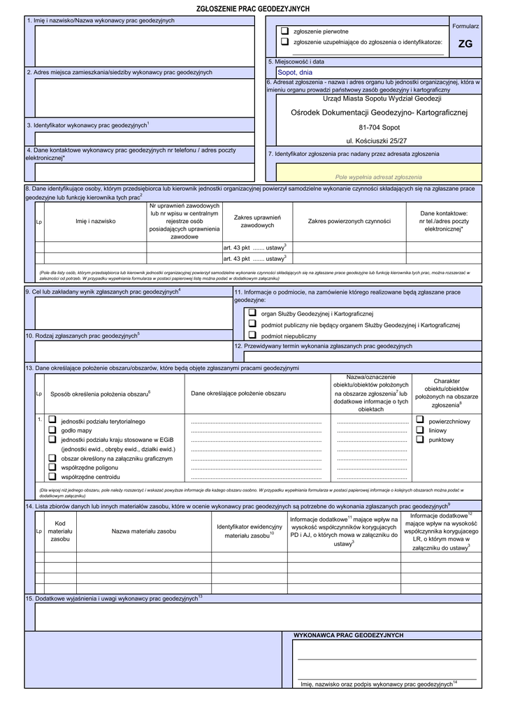 ZGŁOSZENIE PRAC GEODEZYJNYCH 1. Imię i nazwisko/Nazwa wykonawcy prac geodezyjnych q q Formularz zgłoszenie pierwotne zgłoszenie uzupełniające do zgłoszenia o identyfikatorze: ZG 5. Miejscowość i data Sopot, dnia 2. Adres miejsca zamieszkania/siedziby wykonawcy prac geodezyjnych 6. Adresat zgłoszenia - nazwa i adres organu lub jednostki organizacyjnej, która w imieniu organu prowadzi państwowy zasób geodezyjny i kartograficzny Urząd Miasta Sopotu Wydział Geodezji Ośrodek Dokumentacji Geodezyjno- Kartograficznej 1 3. Identyfikator wykonawcy prac geodezyjnych 81-704 Sopot ul. Kościuszki 25/27 4. Dane kontaktowe wykonawcy prac geodezyjnych nr telefonu / adres poczty elektronicznej* 7. Identyfikator zgłoszenia prac nadany przez adresata zgłoszenia Pole wypełnia adresat zgłoszenia 8. Dane identyfikujące osoby, którym przedsiębiorca lub kierownik jednostki organizacyjnej powierzył samodzielne wykonanie czynności składających się na zgłaszane prace 2 geodezyjne lub funkcję kierownika tych prac Nr uprawnień zawodowych Dane kontaktowe: lub nr wpisu w centralnym Zakres uprawnień Imię i nazwisko Zakres powierzonych czynności nr tel./adres poczty rejestrze osób Lp zawodowych elektronicznej* posiadających uprawnienia zawodowe art. 43 pkt ....... ustawy3 art. 43 pkt ....... ustawy3 (Pole dla listy osób, którym przedsiębiorca lub kierownik jednostki organizacyjnej powierzył samodzielne wykonanie czynności składających się na zgłaszane prace geodezyjne lub funkcję kierownika tych prac, można rozszerzać w zalezności od potrzeb. W przypadku wypełniania formularza w postaci papierowej listę można podać w dodatkowym załączniku) 9. Cel lub zakładany wynik zgłaszanych prac geodezyjnych4 11. Informacje o podmiocie, na zamówienie którego realizowane będą zgłaszane prace geodezyjne: q q q 10. Rodzaj zgłaszanych prac geodezyjnych5 organ Służby Geodezyjnej i Kartograficznej podmiot publiczny nie będący organem Służby Geodezyjnej i Kartograficznej podmiot niepubliczny 12. Przewidywany termin wykonania zgłaszanych prac geodezyjnych 13. Dane określające położenie obszaru/obszarów, które będą objęte zgłaszanymi pracami geodezyjnymi Nazwa/oznaczenie obiektu/obiektów położonych Lp 1. 6 Sposób określenia położenia obszaru q q q q q q 7 Dane określające położenie obszaru na obszarze zgłoszenia lub dodatkowe informacje o tych obiektach jednostki podziału terytorialnego ................................................................................ ............................................ godło mapy ................................................................................ ........................................... jednostki podziału kraju stosowane w EGiB ................................................................................ ........................................... (jednostki ewid., obręby ewid., działki ewid.) ................................................................................ ........................................... obszar określony na załączniku graficznym ................................................................................ ........................................... współrzędne poligonu ................................................................................ ........................................... współrzędne centroidu ................................................................................ ........................................... Charakter obiektu/obiektów położonych na obszarze zgłoszenia8 q q q powierzchniowy liniowy punktowy (Dla więcej niż jednego obszaru, pole należy rozszerzyć i wskazać powyższe informacje dla każego obszaru osobno. W przypadku wypełniania formularza w postaci papierowej informacje o kolejnych obszarach można podać w dodatkowym załączniku) 14. Lista zbiorów danych lub innych materiałów zasobu, które w ocenie wykonawcy prac geodezyjnych są potrzebne do wykonania zgłaszanych prac geodezyjnych9 Lp Kod materiału zasobu Nazwa materiału zasobu Identyfikator ewidencyjny materiału zasobu10 Informacje dodatkowe11 mające wpływ na wysokość współczynników korygujacych PD i AJ, o których mowa w załączniku do ustawy3 Informacje dodatkowe12 mające wpływ na wysokość współczynnika korygujacego LR, o którym mowa w załączniku do ustawy3 15. Dodatkowe wyjaśnienia i uwagi wykonawcy prac geodezyjnych13 WYKONAWCA PRAC GEODEZYJNYCH Imię, nazwisko oraz podpis wykonawcy prac geodezyjnych14 Przypisy: 1. Identyfikatorem wykonawcy jest: - w przypadku gdy wykonawcą jest przedsiębiorca lub jednostka organizacyjna - nr REGON; - w przypadku gdy wykonawcą jest biegły sądowy - nr uprawnień zawodowych lub nr wpisu w centralnym rejestrze osób posiadających uprawnienia zawodowe; - w przypadku gdy wykonawcą jest mierniczy górniczy (asystent mierniczego górniczego) - nr świadectwa wydanego przez Prezesa Wyższego Urzędu Górniczego o stwierdzeniu kwalifikacji do wykonywania czynności mierniczego górniczego; - w przypadku wykonawcy będącego podmiotem zagranicznym - nr identyfikacyjny stosowany w kraju, w którym ma siedzibę wykonawca. 2 Należy wypełnić w przypadku gdy wykonawcą zgłaszanych prac geodezyjnych jest przedsiębiorca lub jednostka organizacyjna. . 3. Ustawa z dnia 17 maja 1989 r. - Prawo geodezyjne i kartograficzne (Dz. U. z 2010 r., Nr 193, poz. 1287, z późn. zm.). 4. Należy wpisać cel/cele lub zakładany wynik/zakładane wyniki pracy wybrany/wybrane z listy stanowiącej załącznik nr 1 do niniejszego wzoru. 5. Należy wpisać rodzaj pracy wybrany z listy stanowiącej załącznik nr 2 do niniejszego wzoru. 6. Należy wybrać jeden sposób określenia obszaru. 7. Nazwa/nazwy lub oznaczenie/oznaczenia obiektu/obiektów nadane przez wykonawcę prac geodezyjnych - informacja nieobowiązkowa. 8. Dla konkretnego obiektu można wybrać tylko jeden atrybut opisujący jego charakte