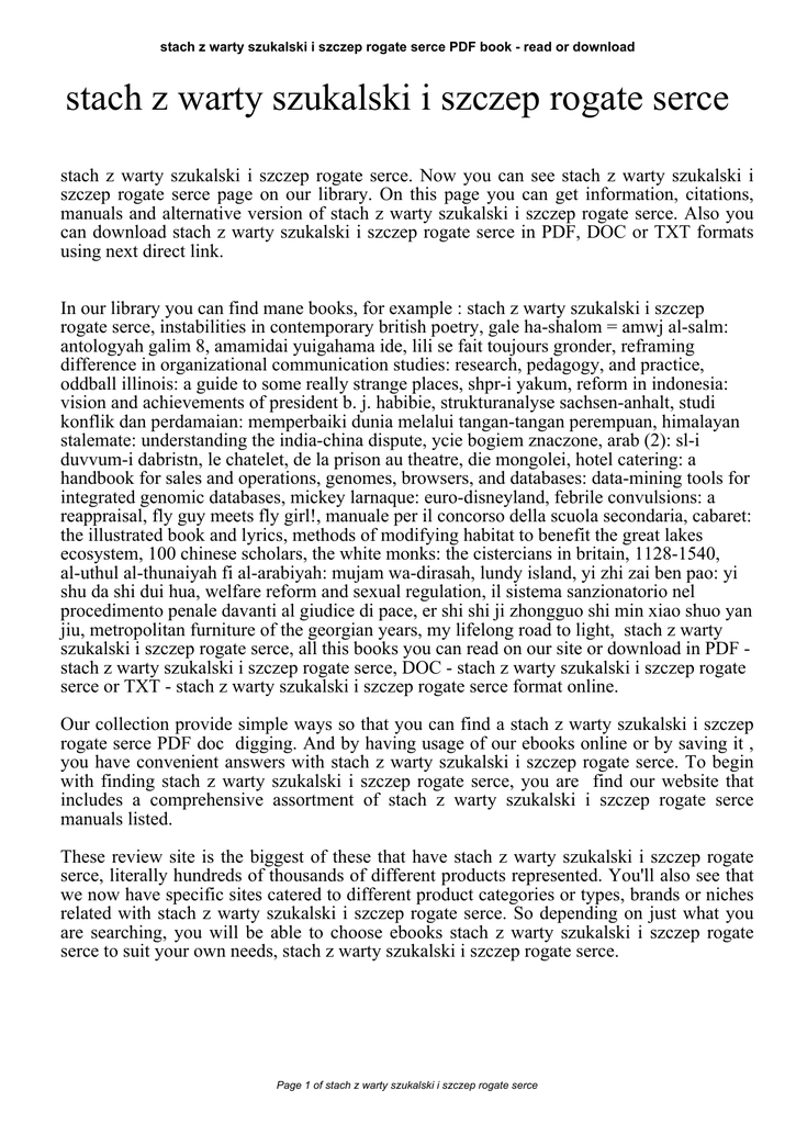 stach z warty szukalski i szczep rogate serce PDF book - read or download stach z warty szukalski i szczep rogate serce stach z warty szukalski i szczep rogate serce. Now you can see stach z warty szukalski i szczep rogate serce page on our library. On this page you can get information, citations, manuals and alternative version of stach z warty szukalski i szczep rogate serce. Also you can download stach z warty szukalski i szczep rogate serce in PDF, DOC or TXT formats using next direct link. In our library you can find mane books, for example : stach z warty szukalski i szczep rogate serce, instabilities in contemporary british poetry, gale ha-shalom = amwj al-salm: antologyah galim 8, amamidai yuigahama ide, lili se fait toujours gronder, reframing difference in organizational communication studies: research, pedagogy, and practice, oddball illinois: a guide to some really strange places, shpr-i yakum, reform in indonesia: vision and achievements of president b. j. habibie, strukturanalyse sachsen-anhalt, studi konflik dan perdamaian: memperbaiki dunia melalui tangan-tangan perempuan, himalayan stalemate: understanding the india-china dispute, ycie bogiem znaczone, arab (2): sl-i duvvum-i dabristn, le chatelet, de la prison au theatre, die mongolei, hotel catering: a handbook for sales and operations, genomes, browsers, and databases: data-mining tools for integrated genomic databases, mickey larnaque: euro-disneyland, febrile convulsions: a reappraisal, fly guy meets fly girl!, manuale per il concorso della scuola secondaria, cabaret: the illustrated book and lyrics, methods of modifying habitat to benefit the great lakes ecosystem, 100 chinese scholars, the white monks: the cistercians in britain, 1128-1540, al-uthul al-thunaiyah fi al-arabiyah: mujam wa-dirasah, lundy island, yi zhi zai ben pao: yi shu da shi dui hua, welfare reform and sexual regulation, il sistema sanzionatorio nel procedimento penale davanti al giudice di pace, er shi shi ji zhongguo shi min xiao shuo yan jiu, metropolitan furniture of the georgian years, my lifelong road to light, stach z warty szukalski i szczep rogate serce, all this books you can read on our site or download in PDF stach z warty szukalski i szczep rogate serce, DOC - stach z warty szukalski i szczep rogate serce or TXT - stach z warty szukalski i szczep rogate serce format online. Our collection provide simple ways so that you can find a stach z warty szukalski i szczep rogate serce PDF doc digging. And by having usage of our ebooks online or by saving it , you have convenient answers with stach z warty szukalski i szczep rogate serce. To begin with finding stach z warty szukalski i szczep rogate serce, you are find our website that includes a comprehensive assortment of stach z warty szukalski i szczep rogate serce manuals listed. These review site is the biggest of these that have stach z warty szukalski i szczep rogate serce, literally hundreds of thousands of different products represented. You'll also see that we now have specific sites catered to different product categories or types, brands or niches related with stach z warty szukalski i szczep rogate serce. So depending on just what you are searching, you will be able to choose ebooks stach z warty szukalski i szczep rogate serce to suit your own needs, stach z warty szukalski i szczep rogate serce. Page 1 of stach z warty szukalski i szczep rogate serce