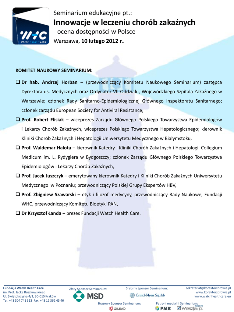 Seminarium edukacyjne pt.: Innowacje w leczeniu chorób zakaźnych - ocena dostępności w Polsce Warszawa, 10 lutego 2012 r. KOMITET NAUKOWY SEMINARIUM: Dr hab. Andrzej Horban – (przewodniczący Komitetu Naukowego Seminarium) zastępca Dyrektora ds. Medycznych oraz Ordynator VII Oddziału, Wojewódzkiego Szpitala Zakaźnego w Warszawie; członek Rady Sanitarno-Epidemiologicznej Głównego Inspektoratu Sanitarnego; członek zarządu European Society for Antiviral Resistance, Prof. Robert Flisiak – wiceprezes Zarządu Głównego Polskiego Towarzystwa Epidemiologów i Lekarzy Chorób Zakaźnych, wiceprezes Polskiego Towarzystwa Hepatologicznego; kierownik Kliniki Chorób Zakaźnych i Hepatologii Uniwersytetu Medycznego w Białymstoku, Prof. Waldemar Halota – kierownik Katedry i Kliniki Chorób Zakaźnych i Hepatologii Collegium Medicum im. L. Rydygiera w Bydgoszczy; członek Zarządu Głównego Polskiego Towarzystwa Epidemiologów i Lekarzy Chorób Zakaźnych, Prof. Jacek Juszczyk – emerytowany kierownik Katedry i Kliniki Chorób Zakaźnych Uniwersytetu Medycznego w Poznaniu; przewodniczący Polskiej Grupy Ekspertów HBV, Prof. Zbigniew Szawarski – etyk i filozof medycyny, przewodniczący Rady Naukowej Fundacji WHC, przewodniczący Komitetu Bioetyki PAN, Dr Krzysztof Łanda – prezes Fundacji Watch Health Care. Fundacja Watch Health Care im. Prof. Jacka Ruszkowskiego Ul. Świętokrzyska 4/1, 30-015 Kraków Tel. +48 504 741 313 Fax. +48 12 362 45 46 Złoty Sponsor Seminarium: Srebrny Sponsor Seminarium: Brązowy Sponsor Seminarium: [email protected] www.korektorzdrowia.pl www.watchhealthcare.eu Patroni medialni Seminarium: Seminarium edukacyjne pt.: Innowacje w leczeniu chorób zakaźnych - ocena dostępności w Polsce Warszawa, 10 lutego 2012 r. RAMOWY PROGRAM SEMINARIUM 10:00-10:15 Otwarcie: Przedstawienie Komitetu Naukowego oraz uczestników dyskusji – Dr Krzysztof Łanda, prezes Fundacji WHC 10:15-10:40 12:25-12:45 Dr hab. Andrzej Horban – „Programy terapeutyczne/lekowe w chorobach zakaźnych - dostęp do innowacyjnych leków” Wystąpienie przedstawicieli Ministra Zdrowia i Narodowego Funduszu Zdrowia* Dr Elżbieta Narolska – „Rola Państwowej Inspekcji Sanitarnej w zapobieganiu i zwalczaniu HCV”* Prof. Waldemar Halota – „Zakażenia HCV – współczesne zagrożenie” Prof. Robert Flisiak – „Miejsce terapii trójlekowej w leczeniu zakażeń HCV” Prof. Jacek Juszczyk – „Prace polskiej grupy ekspertów HBV” Dr Ewa Borek – „Analiza racjonalizacyjna wydatków płatnika na realizację terapeutycznego programu zdrowotnego - Leczenie przewlekłego WZW typu B” Prof. Zbigniew Szawarski – „Jeżeli dojdzie do pandemii grypy - refleksje etyczne” 12:45-13:00 Przerwa kawowa 13:00-13:15 Dr Wojciech Matusewicz – „Innowacyjne metody w profilaktyce i leczeniu AIDS na bazie Narodowego Programu Leczenia Antyretrowirusowego” Mec. Katarzyna Bondaryk – „Centralne zakupy leków na przykładzie leków przeciw AIDS” Dr Dariusz Lipowski – „Leczenie ciężkich zakażeń. Propozycje zmian w finansowaniu” Lek. Maciej Nowicki – „Program szczepień – jako element koszyka świadczeń gwarantowanych” Dr Krzysztof Łanda – „Mapowanie ograniczeń dostępu do świadczeń zdrowotnych – działalność Fundacji Watch Health Care” 10:40-11:10 11:10-11:25 11:25-11:40 11:40-11:55 11:55-12:10 12:10-12:25 13:15-13:30 13:30-13:45 13:45-14:00 14:00-14:30 14:30-14:45 Przerwa kawowa 14:45-16:15 Dyskusja dotycząca możliwości rozwiązania problemów z dostępem do innowacyjnych metod leczenia chorób zakaźnych w Polsce (wypowiedź otwierająca dyskusję – Dr Dorota Fal) 16:15-17:00 Poczęstunek i dyskusje nieformalne w foyer *w oczekiwaniu na potwierdzenie wystąpienia W dyskusji, poprowadzonej przez Krzysztofa Łandę, na temat możliwości rozwiązania problemów z dostępem do innowacyjnych metod leczenia chorób zakaźnych w Polsce wezmą udział: Dr Dorota Fal – ekspert Polskiej Izby Ubezpieczeń (wypowiedź otwierająca dyskusję) Prezes Fundacji „Gwiazda Nadziei” Barbara Pepke Mec. Katarzyna Bondaryk Dr hab. Andrzej Horban Prof. Zbigniew Szawarski Dr n. med. Dariusz Lipowski Dr Krzysztof Łanda Fundacja Watch Health Care im. Prof. Jacka Ruszkowskiego Ul. Świętokrzyska 4/1, 30-015 Kraków Tel. +48 504 741 313 Fax. +48 12 362 45 46 Złoty Sponsor Seminarium: Srebrny Sponsor Seminarium: Brązowy Sponsor Seminarium: [email protected] www.korektorzdrowia.pl www.watchhealthcare.eu Patroni medialni Seminarium: