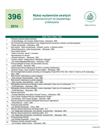396 Wykaz wydawnictw zwartych przeznaczonych do bezpłatnego przekazania 2014 Tytuł. Tom / Autor - Rok 1. 2. 3. 4. 5. 6. 7. 8. 9. 10. 11. 12. 13. 14. 15. 16. 17. 18. 19. 20. Podręczny słownik polsko-niemiecki. / Andrzej Bzdęga, Jan Chodera, Stefan Kubica.- Warszawa, 1993. Der Polnische Novemberaufstand in der zeitgenössischen deutschen Literatur und Historiographie. / Marek Jaroszewski. - Warszawa, 1992. Ignis ardens : Julian Krzyżanowski : człowiek i uczony : w stulecie urodzin. / Maria Bokszczanin, Julian Krzyżanowski. - Warszawa, 1993. Zarys historii retoryki. / Helena Cichocka, Jakub Z. Lichański. Wprowadzenie do retoryki. / Richard Volkmann. - Warszawa, 1993. Joachim Lelewel - księgoznawca, bibliotekarz, bibliograf. / red. Maria Magdalena Biernacka. - Warszawa, 1993. Pricing strategies for library and information services. / Johan Olaisen. - Sandvika, 1990. Zastosowanie filtracji adaptacyjnej do EKG o wysokiej rozdzielczości. / Buchner Teodor, Jerzy Cytowski, Roman Kępski. - Warszawa, 1995. Die Sinnmőglichkeit ist jeweils einamling und einzigartig: Festschrift fur Prof. DDr. Viktor E. Frankl zum 90. Geburstag. – Wien, 1995. Mały słownik matematyczny polsko-angielski . / Zofia Jóźwiak, Alicja Zielińska. - Łódź, 1996. Mały słownik matematyczny polsko-angielski. / Zofia Jóźwiak, Alicja Zielińska. - Łódź, 1996. Bibliografija piśmiennictwa polskiego z działu matematyki i fizyki oraz ich zastósowań. T.1. / Teofil Żebrawski. - Warszawa, 1992. Bibliografija piśmiennictwa polskiego z działu matematyki i fizyki oraz ich zastósowań . T.2./ Teofil Żebrawski. - Warszawa, 1992. Słownik synonimów. / Andrzej Dąbrówka, Ewa Geller, Ryszard Turczyn. - Warszawa, 1993. Julius Caesar Scaligers Kritik der neulateinischen Dichter. – / Ilse Reineke, Julius Caesar Scaliger. - München, 1988. Rozwój metodyczny polskich bibliografii historycznych regionalnych. / Alicja Matczuk. - Lublin, 1994. Komputeryzacja bibliotek. / red. Bohdan Ryszewski. - Toruń, 1994. Słownik naukowo-techniczny niemiecko-polski : A-Z. / red. Małgorzata Sokołowska, Anna Bender, Krzysztof Żak. - Warszawa, 1993. Słownik naukowo-techniczny niemiecko-polski : A-Z. / red. Małgorzata Sokołowska, Anna Bender, Krzysztof Żak. - Warszawa, 1993. Komputeryzacja bibliotek. / red. Bohdan Ryszewski. - Toruń, 1994. Podręczny słownik niemiecko-polski. / Jan Chodera, Stefan Kubica. - Warszawa, 1993. 10 lipca 2014 10 lipca 2014