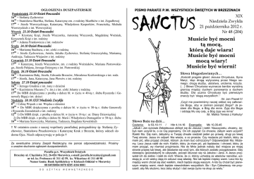 OGŁOSZENIA DUSZPASTERSKIE Poniedziałek 22.10 Dzień Powszedni 1600 + Stefanię Zychowicz 1630 + Stanisława Skarbka, Stefana, Katarzynę zm. z rodziny Skarbków z int. Zegadłowej 1700 + Józefa Wawrzyckiego, Katarzynę, Władysława Kasperków, Franciszkę, Michała Wawrzyckich z int. Wawrzyckiej Wtorek 23.10 Dzień Powszedni 1630 + Krystynę Krąż, Józefa Wieczorka, Antoninę Wieczorek, Magdalenę Woźniak, Krzysztofa Krąż z int. rodziny 1700 + Adama Frankowicza z int. rodziców Środa 24.10 Dzień Powszedni 1630 + Mariannę Stachura, z int. córki z rodziną 1700 + Józefa Zychowicza, Aniela, Jakuba Zychowicz, Stefanię Gruszczyńską, Mariannę, Andrzeja, Tadeusza Wiejasów z int. rodziny Czwartek 25.10 Dzień Powszedni 1700 + Katarzynę, Józefa Wieczorków, zm. z rodziny Woźniaków, Mariana Piotrowskiego, Józefa Pabjana, Jerzego Dziergwę z int. Piotrowskiej Piątek 26.10 Dzień Powszedni 1630 + Kazimierza Bałę, Józefa, Edwarda Brzozów, Mirosława Kozłowskiego z int. rodz. 1700 + Józefa, Jana, Katarzynę, Jana Plewów z int. rodziny Sobota 27.10 Dzięń powszedni 1600 + Jerzego Grudnia z int. żony z dziećmi 1630 + Kazimierza Mazura (7 r. śm.) z int. córki Jolanty z rodziną 1700 Do MBR dziękczynna z prośbą o dalsze bł. w życiu w 40-tą r. ślubu Ryszarda i Genowefy Bigaj z int. dzieci Niedziela 28.10 XXX Niedziela Zwykła 800 + Celinę Więcek z int. Więcka z dziećmi 1000 + Do MBR dziękczynna z prośbą o dalsze bł. w życiu w 50-tą r. ślubu Genowefy i Ryszarda Zawadzkich z int. rodziny 1200 1) Do MBR dzięk. z prośbą o dalsze bł. w życiu w 18-tą r. ur. Diany Dziewięckiej 2) Do MBR dzięk. z prośbą o dalsze bł. Marii i Władysława Domagałów w 50-tą r. ślubu 1600 + Mariana Szewczyka, Mariannę, Tadeusza, Bogdana Kowalskich † W ostatnim czasie z naszej wspólnoty parafialnej pożegnaliśmy śp. Stefanię Zychowicz, Stanisława Praszkiewicza i Katarzynę Kruk z Brzezin, którzy odeszli do domu Ojca. Niech odpoczywają w pokoju † Za ewentualne zmiany Zespół Redakcyjny nie ponosi odpowiedzialności. Prosimy o uważne słuchanie ogłoszeń duszpasterskich. Parafia p.w. Wszystkich Świętych Brzeziny ul. Chęcińska 312, 26-026 Morawica, e-mail: [email protected] nr tel. ks. Proboszcz 41 311 42 59, ks. Wikariusz 41 311 48 98 Numer konta: Bank Spółdzielczy w Kielcach Oddział w Morawicy 08 84930004 0070 0205 4104 0001 D O U Ż Y T K U W E W N Ę T R Z N E G O PISMO PARAFII P.W. WSZYSTKICH ŚWIĘTYCH W BRZEZINACH SANCTUS XIX Niedziela Zwykła 21 października 2012 r. Nr 48 (204) Musicie być mocni tą mocą, którą daje wiara! Musicie być mocni mocą wiary! Musicie być wierni! Słowa błogosławionych… „Kościół pragnie głosić Jezusa Chrystusa, Syna Maryi, idąc drogą wytyczoną przez Niego samego; drogą służby, ubóstwa, uniżenia, krzyża. (…) Słowo Chrystusa wyznacza bardzo wyraźną granicę między duchem panowania a duchem służby. Dla ucznia Chrystusa być pierwszym znaczy być ‘sługą wszystkich’.” /bł. Jan Paweł II/ „Czyż nie powinniśmy raczej oddać się całkowicie Bogu, aby w zamian posiąść Boga? Ja jestem dla Boga, a Bóg dla mnie. Żyję dla Boga i oddaję Mu się cały, a Bóg żyje we mnie” /bł. Matka Teresa z Kalkuty/ Słowo Boże na dziś… Czytania: Iz 53,10-11 / Hbr 4,14-16 Ewangelia: Mk 10,35-45 „Jakub i Jan synowie Zebedeusza zbliżyli się do Jezusa i rzekli: Nauczycielu, chcemy, żebyś nam uczynił to, o co Cię poprosimy. On ich zapytał: Co chcecie, żebym wam uczynił? Rzekli Mu: Daj nam, żebyśmy w Twojej chwale siedzieli jeden po prawej, drugi po lewej Twej stronie. Jezus im odparł: Nie wiecie, o co prosicie. Czy możecie pić kielich, który Ja mam pić, albo przyjąć chrzest, którym Ja mam być ochrzczony? Odpowiedzieli Mu: Możemy. Lecz Jezus rzekł do nich: Kielich, który Ja mam pić, pić będziecie; i chrzest, który Ja mam przyjąć, wy również przyjmiecie. Nie do Mnie jednak należy dać miejsce po mojej stronie prawej lub lewej, ale [dostanie się ono] tym, dla których zostało przygotowane. Gdy dziesięciu [pozostałych] to usłyszało, poczęli oburzać się na Jakuba i Jana. A Jezus przywołał ich do siebie i rzekł do nich: Wiecie, że ci, którzy uchodzą za władców narodów, uciskają je, a ich wielcy dają im odczuć swą władzę. Nie tak będzie między wami. Lecz kto by między wami chciał się stać wielkim, niech będzie sługą waszym. A kto by chciał być pierwszym między wami, niech będzie niewolnikiem wszystkich. Bo i Syn Człowieczy nie przyszedł, aby Mu służono, lecz żeby służyć i dać swoje życie na okup za wielu.” A w parafii… Boży człowiek… - św. Urszula (21 październik) ▪ Dnia 13 października 2012 roku w katedrze kieleckiej odbyła się diecezjalna inauguracja Roku Wiary. Mszę Świętą koncelebrowali kieleccy biskupi oraz księża z całej diecezji. Po Eucharystii delegacje wszystkich parafii otrzymywały z rąk biskupów Pismo Święte i Kompendium Katechizmu Kościoła Katolickiego. Parafię Brzeziny reprezentował ks. Dariusz Miler, Justyna Machulska oraz Damian Zegadło. Otrzymana Biblia została umieszczona na pulpicie w prezbiterium, a obok zawisł baner przypominający o obchodzonym Roku Wiary. Wierzę w Boga w Trójcy Jedynego. ▪ W ubiegłą niedzielę w całej Polsce w ramach Dni Papieskiego odbyła się zbiórka funduszy na stypendia dla zdolnej młodzieży. Ministranci w naszej parafii uzbierali 500 zł, oprócz nich do akcji bardzo aktywnie włączyli się także uczniowie ze szkoły w Kowali. ▪ Zachęcamy wszystkich parafian do zaangażowania się w porządkowanie cmentarza. Postarajmy się, aby godnie przygotować naszą brzezińską nekropolię na nadchodzący czas świąt. Najdawniejszy żywot św. Urszuli pochodzi z roku 975. Według niego była ona córką króla Bretanii. Jako chrześcijanka postanowiła służyć Panu Bogu w dozgonnym dziewictwie. Kiedy chcieli wydać ją za kró