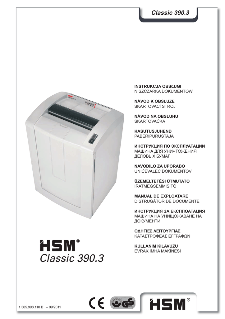 Classic 390.3 INSTRUKCJA OBSàUGI NISZCZARKA DOKUMENTÓW NÁVOD K OBSLUZE SKARTOVACÍ STROJ NÁVOD NA OBSLUHU SKARTOVAýKA KASUTUSJUHEND PABERIPURUSTAJA ɂɇɋɌɊɍɄɐɂə ɉɈ ɗɄɋɉɅɍȺɌȺɐɂɂ ɆȺɒɂɇȺ ȾɅə ɍɇɂɑɌɈɀȿɇɂə ȾȿɅɈȼɕɏ ȻɍɆȺȽ NAVODILO ZA UPORABO UNIýEVALEC DOKUMENTOV ÜZEMELTETÉSI ÚTMUTATÓ IRATMEGSEMMISÍTė MANUAL DE EXPLOATARE DISTRUGĂTOR DE DOCUMENTE ɂɇɋɌɊɍɄɐɂə ɁȺ ȿɄɋɉɅɈȺɌȺɐɂə ɆȺɒɂɇȺ ɇȺ ɍɇɂɓɈɀȺȼȺɇȿ ɇȺ ȾɈɄɍɆȿɇɌɂ ȅǻǾīǿǼȈ ȁǼǿȉȅȊȇīǿǹȈ KATAȈȉȇȅĭǼǹȈ Ǽīīȇǹĭȍȃ KULLANIM KILAVUZU EVRAK øMHA MAKøNESø Classic 390.3 1.365.998.110 B – 09/2011 polski 1 UĪytkowanie zgodne z przeznaczeniem, gwarancja Sprawdziü na tabliczce znamionowej z tyáu urządzenia, do jakiej szerokoĞci ciĊcia i na jakie napiĊcie zasilające zaprojektowano niszczarkĊ dokumentów i postĊpowaü zgodnie z odpowiednimi punktami instrukcji obsáugi. Niszczarka dokumentów przeznaczona jest wyáącznie do niszczenia papieru. ZaleĪnie od sposobu ciĊcia moĪliwe jest oprócz tego niszczenie niewielkich iloĞci nastĊpujących materiaáów: Rozmiar ciĊcia (mm) 3,9 5,8 3,9x40 1,9x15 Karty kredytowe Ɣ Ɣ Ɣ Páyty CD, dyskietki Ɣ Ɣ Ɣ Ɣ Wytrzymaáy mechanizm tnący jest odporny na zszywki i spinacze biurowe. Jedynie w przypadku niszczarek dokumentów o poziomie tajnoĞci HS Level 6 (1 x 5 mm) papier nie moĪe zawieraü zszywek i spinaczy biurowych. Okres rĊkojmi na niszczarkĊ dokumentów wynosi 2 lata. Na walce noĪowe ze stali jednolitej bĊdące elementami niszczarki dokumentów HSM istnieje gwarancja niezaleĪna od rĊkojmi (HSM Lifetime Warranty), która obowiązuje w caáym okresie Īycia urządzenia. Wyjątek stanowią niszczarki ze stopniem bezpieczeĔstwa 5 i poziomem HS 6. ZuĪycie, szkody wywoáane przez nieprawidáową obsáugĊ oraz niedozwolone ingerencje osób trzecich nie podlegają gwarancji ani rĊkojmi. Wskazówka: Niszczarki dokumentów z mechanizmem tnącym Ğcinki papieru są dostĊpne równieĪ opcjonalnie z urządzeniem do automatycznego smarowania mechanizmu tnącego. NaleĪy przestrzegaü zaáączonej dokumentacji olejarki, jeĞli maszyna jest w nią wyposaĪona. 09/2011 2 Wskazówki bezpieczeĔstwa KlasyÞkacja Wskazówka bezObjaĞnienie pieczeĔstwa OSTRZEĩE- ZlekcewaĪenie NIE ostrzeĪenia moĪe doprowadziü do obraĪeĔ zagraĪających Īyciu i zdrowiu. Uwaga ZlekcewaĪenie wskazówki moĪe doprowadziü do powstania szkód materialnych. Przed uruchomieniem maszyny przeczytaü instrukcjĊ obsáugi, przechowywaü instrukcjĊ do póĨniejszego uĪycia i przekazaü ją kolejnemu uĪytkownikowi. Przestrzegaü wszystkich informacji bezpieczeĔstwa umieszczonych na niszczarce dokumentów! OSTRZEĩENIE ZagroĪenie dla dzieci i innych osób! Urządzenia nie mogą obsáugiwaü osoby (w tym dzieci poniĪej 14 lat) o ograniczonych zdolnoĞciach Þzycznych, organoleptycznych i umysáowych, niedostatecznym doĞwiadczeniu i/lub niedostatecznej wiedzy, chyba Īe są one nadzorowane przez wáaĞciwą osobĊ odpowiedzialną za ich bezpieczeĔstwo lub otrzymaáy od niej instrukcje o tym, w jaki sposób urządzenie naleĪy obsáugiwaü. Dzieci naleĪy nadzorowaü w celu upewnienia siĊ, Īe urządzenie nie jest wykorzystywane do zabawy, Nie pozostawiaü bez nadzoru wáączonej niszczarki dokumentów. Classic 390.3 3 polski OSTRZEĩENIE NiebezpieczeĔstwo obraĪeĔ ciaáa! Nigdy nie wkáadaü rąk w szczelinĊ doprowadzania papieru. NiebezpieczeĔstwo zranienia w wyniku wciągniĊcia! Dáugie wáosy, luĨną odzieĪ, krawaty, szale, naszyjniki, bransolety itp. zabezpieczyü przed dostaniem siĊ do strefy szczeliny doprowadzania papieru. Nie niszczyü materiaáów mających tendencjĊ do tworzenia zapĊtleĔ, np. taĞmy, sznurki, folia z tworzywa sztucznego itd. Urządzenie i przewód naleĪy regularnie sprawdzaü po wzglĊdem uszkodzeĔ. W razie uszkodzenia lub nieprawidáowego dziaáania oraz przed przemieszczeniem lub czyszczeniem niszczarkĊ dokumentów naleĪy wyáączyü i wyciągnąü wtyczkĊ sieciową z gniazda wtykowego. – Urządzenie, wtyczkĊ sieciową i przewód zasilający naleĪy trzymaü z dala od otwartego páomienia i gorących powierzchni. Otwory wentylacyjne muszą byü odkryte i naleĪy zapewniü minimalny odstĊp 5 cm od Ğciany lub mebli. Prace serwisowe moĪe wykonywaü tylko personel serwisowy HSM i technicy serwisowi naszych partnerów kontraktowych. Adresy punktów serwisowych, patrz strona 72. NiebezpieczeĔstwo zranienia w wyniku odprysków! Podczas niszczenia twardych kart kredytowych, dysków CD lub dyskietek nosiü okulary ochronne. OSTRZEĩENIE Niebezpieczne napiĊcie zasilające! Nieprawidáowe obchodzenie siĊ z urządzeniem moĪe doprowadziü do poraĪenia prądem elektrycznym. – Przed podáączeniem wtyczki sieciowej sprawdziü, czy napiĊcie i czĊstotliwoĞü sieci elektrycznej zgadzają siĊ z parametrami podanymi na tabliczce znamionowej. – NaleĪy zapewniü áatwy dostĊp do wtyczki sieciowej. – Chroniü niszczarkĊ dokumentów przed kontaktem z wodą. Nie zanurzaü w wodzie ani przewodu zasilającego, ani wtyczki sieciowej. – Nigdy nie dotykaü wtyczki sieciowej mokrymi rĊkoma. – Nie wyciągnąü wtyczki sieciowej z gniazda wtykowego, ciągnąc za przewód zasilający, lecz zawsze trzymając za wtyczkĊ sieciową. – Urządzenie naleĪy uĪytkowaü wyáączenie w pomieszczeniach suchych. Nie naleĪy go uĪytkowaü w pomieszczeniach wilgotnych ani w czasie deszczu. 4 NiebezpieczeĔstwo w wyniku nieprawidáowego uĪytkowania Urządzenie naleĪy uĪytkowaü wyáącznie zgodnie z danymi zawartymi w rozdziale „UĪytkowanie zgodne z przeznaczeniem“. Uwaga Classic 390.3 09/2011 polski 3 Schemat poglądowy 5 Uruchamianie 1 • Przed uruchomieniem wykrĊciü Ğruby skrzydeákowe zabezpieczenia transportowego. 2 3 45 6 7 HSM GmbH + Co. KG Austrasse 1-9 88699 Frickingen / Germany 1 2 3 4 5 6 7 Drzwi Szczelina doprowadzania p