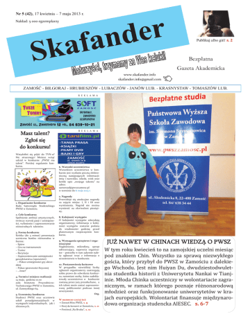 Nr 5 (42), 17 kwietnia – 7 maja 2013 r. r e d n a f a k S Nakład: 5 000 egzemplarzy Publikuj albo giń! s. 2 Bezpłatna Gazeta Akademicka www.skafander.info [email protected] ZAMOŚĆ - BIŁGORAJ - HRUBIESZÓW - LUBACZÓW - JANÓW LUB. - KRASNYSTAW - TOMASZÓW LUB. R E K L A M A Masz talent? Zgłoś się do konkursu! Wstydziłeś się pójść do TVN-u? Nic straconego! Możesz wziąć udział w konkursie „PWSZ ma talent”. Poniżej regulamin konkursu. 1. Organizator konkursu Rada Samorządu Studenckiego PWSZ w Zamościu. 2. Cele konkursu Spełnienie ambicji artystycznych, twórczy rozwój pasji i umiejętności, wyłonienie i zaprezentowanie różnorodnych talentów. 3. Forma konkursu Krótka (do 5 minut) prezentacja sceniczna bardzo różnorodna w formie: – Śpiew – Gra na instrumencie – Taniec – Recytacja – Zaprezentowanie umiejętności gawędziarstwa (opowieści) – Pokaz umiejętności gry aktorskiej – Pokaz sprawności fizycznej – …Inne? 4. Termin i miejsce realizacji 14 maja, godzina 10.00 aula Instytutu PrzyrodniczoTechnicznego PWSZ w Zamościu, ul. Zamoyskiego 64. 5. Uczestnicy konkursu Studenci PWSZ oraz uczniowie szkół ponadgimnazjalnych w występach indywidualnych, jak i zbiorowych. R E K L A M A 6. Warunki uczestnictwa Warunkiem uczestnictwa w konkursie jest wysłanie pocztą elektroniczną następujących informacji: imię i nazwisko, szkoła, wiek oraz krótki opis „swojego talentu” na adres: [email protected] w terminie do 6 maja 2013 r. 7. Nagrody Przewiduje się atrakcyjne nagrody za zajęcie miejsc: I, II i III oraz wyróżnienia. Nagród nie można wymienić na ekwiwalent pieniężny. 8. Kolejność występów O kolejności występów zdecydują organizatorzy; informacja o kolejności występów zostanie podana do wiadomości godzinę przed planowanym rozpoczęciem konkursu. 9. Wymagania sprzętowe i organizacyjne Nagłośnienie, mikrofony, sprzęt odtwarzający, zapewnia organizator – potrzeby w tym zakresie należy zgłaszać wraz z informacja o uczestnictwie w konkursie. 10. Postanowienia końcowe W przypadku niewielkiej liczby zgłoszeń organizatorzy zastrzegają sobie prawo do odwołania konkursu, natomiast osoby, które zadeklarowały uczestnictwo w konkursie zostaną przez jury przesłuchane, a ich talent może zostać zaprezentowany publiczności podczas innej uroczystości. Org. W numerze czytaj też: → Zostań Miss PWSZ, s. 9 → Enej da koncert w Zamościu, s. 11 → Festiwal „Na Bruku”, s. 12 JUŻ NAWET W CHINACH WIEDZĄ O PWSZ W tym roku kwiecień to na zamojskiej uczelni miesiąc pod znakiem Chin. Wszystko za sprawą niezwykłego gościa, który przybył do PWSZ w Zamościu z dalekiego Wschodu. Jest nim Huiyan Du, dwudziestodwuletnia studentka historii z Uniwersytetu Nankai w Tianjinie. Młoda Chinka uczestniczy w wolontariacie zagranicznym, w ramach którego poznaje różnonarodową młodzież oraz funkcjonowanie uniwersytetów w krajach europejskich. Wolontariat finansuje międzynarodowa organizacja studencka AIESEC. s. 6-7 2 www.skafander.info | www.facebook.com/skafander.info Przeczytaj i pomyśl! Może PuPeGroup to propozycja dla Ciebie? Rozmowa z doktorem Andrzejem Kowalczykiem z Zakładu Politologii PWSZ w Zamościu Na czym polega Pana pomysł? Już od pewnego okresu noszę się z zamiarem zaproszenia do współpracy osób – studentów, absolwentów – zainteresowanych bardzo różnie rozumianą formą działalności, jak ja to nazywam „publikatorskiej”, polegającej na szeroko rozumianej „graficzności” mającej kształt obrazkowy lub tekstowy. Moja propozycja skierowana jest do osób, które swoją przyszłość wiążą z rynkiem medialnym. Sami siebie postrzegają jako przyszłych twórców, np.: haseł reklamowych, publikacji dziennikarskich, opowieści, scenariuszy filmowych, tekstów i obrazów satyrycznych oraz innych znanych rodzajowi ludzkiemu form publicznej wypowiedzi. Gdyby udało się zebrać grupę pasjonatów, to uczynimy wszystko, aby ich zamiary lub już posiadane umiejętności podlegały dalszemu doskonaleniu i publicznemu prezentowaniu. Przyznaję, że brzmi to interesująco, ale do kogo szczególnie adresuje Pan swój pomysł? Nie ukrywam, że pracując w Zakładzie Politologii PWSZ im. Szymona Szymonowica w Zamościu oraz na Wydziale Politologii UMCS w Lublinie najbliższą mojemu zawodowi jako nauczyciela akademickiego formą działalności publikacyjnej są wydawnictwa naukowe wymagające zachowania specyficznych cech charakterystycznych tylko dla publikacji stricte naukowych. Jednak, uważam, że wymogi współczesności narzucają nam czasami możliwość, a czasami konieczność opanowania innych umiejętności. Dobrze, jeżeli jest to zbieżne z naszymi talentami i zainteresowaniami. Dlatego też sądzę, że osoby potencjalnie zainteresowane moją propozycją będą już absolwentami studiów akademickich lub jeszcze osobami uczącymi się. Jednak w praktyce nie można wykluczyć żadnego konkretnego przypadku. Miejsce jest dla wszystkich, również osób w bardziej zaawansowanym wieku. Zwróćmy uwagę na nazwę, PuPeGroup brzmi nie tylko intrygująco, może nawet trochę obscenicznie? To jest następna kwestia, którą chciałbym wyjaśnić. Sama nazwa nawiązuje do powszechnie używanego w kulturze anglosaskiej określenia: publish or perish (publikuj albo giń) będącego swoistym wyznacznikiem prestiżu zawodowego osób należących do wielu grup społecznych, których działalność zawodowa sprowadza się do wytworzenia określonego produktu obrazkowego lub tekstowego, a więc wszystkiego tego, co widzimy, czytając tytuły prasowe, oglądając reklamy, słuchając wypowiedzi słownych, oglądając obrazki satyryków. Poza tym, rozmawiając ze studentami politologii PWSZ w Zamościu, pytałem ich o opinię dotyczącą szczególnie pierwszego członu nazwy, a więc PuPe. Większość z nich uznała, że brzmi ona na tyle frapująco, że trzeba się zainteresować,