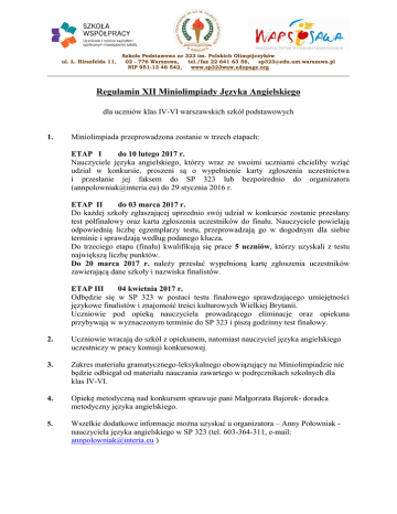 ul. L. Hirszfelda 11, Szkoła Podstawowa nr 323 im. Polskich Olimpijczyków 02 - 776 Warszawa, tel./fax 22 641 63 56, [email protected] NIP 951-13 48 542, www.sp323waw.edupage.org Regulamin XII Miniolimpiady Języka Angielskiego dla uczniów klas IV-VI warszawskich szkół podstawowych 1. Miniolimpiada przeprowadzona zostanie w trzech etapach: ETAP I do 10 lutego 2017 r. Nauczyciele języka angielskiego, którzy wraz ze swoimi uczniami chcieliby wziąć udział w konkursie, proszeni są o wypełnienie karty zgłoszenia uczestnictwa i przesłanie jej faksem do SP 323 lub bezpośrednio do organizatora ([email protected]) do 29 stycznia 2016 r. ETAP II do 03 marca 2017 r. Do każdej szkoły zgłaszającej uprzednio swój udział w konkursie zostanie przesłany test półfinałowy oraz karta zgłoszenia uczestników do finału. Nauczyciele powielają odpowiednią liczbę egzemplarzy testu, przeprowadzają go w dogodnym dla siebie terminie i sprawdzają według podanego klucza. Do trzeciego etapu (finału) kwalifikują się prace 5 uczniów, którzy uzyskali z testu największą liczbę punktów. Do 20 marca 2017 r. należy przesłać wypełnioną kartę zgłoszenia uczestników zawierającą dane szkoły i nazwiska finalistów. ETAP III 04 kwietnia 2017 r. Odbędzie się w SP 323 w postaci testu finałowego sprawdzającego umiejętności językowe finalistów i znajomość treści kulturowych Wielkiej Brytanii. Uczniowie pod opieką nauczyciela prowadzącego eliminacje oraz opiekuna przybywają w wyznaczonym terminie do SP 323 i piszą godzinny test finałowy. 2. Uczniowie wracają do szkół z opiekunem, natomiast nauczyciel języka angielskiego uczestniczy w pracy komisji konkursowej. 3. Zakres materiału gramatycznego-leksykalnego obowiązujący na Miniolimpiadzie nie będzie odbiegał od materiału nauczania zawartego w podręcznikach szkolnych dla klas IV-VI. 4. Opiekę metodyczną nad konkursem sprawuje pani Małgorzata Bajorek- doradca metodyczny języka angielskiego. 5. Wszelkie dodatkowe informacje można uzyskać u organizatora – Anny Połowniak nauczyciela języka angielskiego w SP 323 (tel. 603-364-311, e-mail: [email protected] )