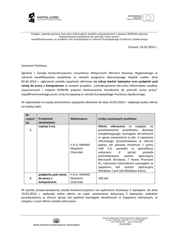 Projekt „Uatrakcyjnienie kierunku informatyka studiów stacjonarnych I stopnia WSNHiD poprzez dostosowanie kształcenia do potrzeb rynku pracy” współfinansowany ze środków Unii Europejskiej w ramach Europejskiego Funduszu Społecznego Poznań, 24.02.2014 r. Szanowni Państwo, Zgodnie z Zasadą konkurencyjności rozumieniu Wytycznych Ministra Rozwoju Regionalnego w zakresie kwalifikowania wydatków w ramach programu Operacyjnego Kapitał Ludzki, dnia 03.02.2014 r. ogłoszone zostało zapytanie ofertowe na zakup dwóch laptopów oraz podpórki pod ramię do pracy z komputerem w ramach projektu: „Uatrakcyjnienie kierunku informatyka studiów stacjonarnych I stopnia WSNHiD poprzez dostosowanie kształcenia do potrzeb rynku pracy” współfinansowanego przez Unię Europejską w ramach Europejskiego Funduszu Społecznego. W odpowiedzi na wyżej wymienione zapytanie ofertowe do dnia 19.02.2014 r. wpłynęła jedna oferta na każdą część: Nr części/ Lp. Przedmiot zamówienia Laptop 2 szt. Wykonawca Liczba uzyskanych punktów: F.H.U. KRAWO Wojciech Chanulak Oferta odrzucona ze względu na przedstawienie przedmiotu dostawy niespełniającego wymogów określonych w opisie zamówienia w pkt. 4 zapytania ofertowego (przedstawiony w ofercie laptop nie posiada minimum 1 portu USB 3.0, ponadto w specyfikacji wskazano iż sprzęt posiada preinstalowany system operacyjny Microsoft Windows 7 Home Premium PL, natomiast minimalnym wymogiem w zapytaniu był system operacyjny Windows 7 pro lub Windows 8 pro) F.H.U. KRAWO Wojciech Chanulak 100 pkt 1 2 podpórka pod ramię do pracy z komputerem W wyniku przeprowadzonej zasady konkurencyjności nie wyłoniono dostawcy 2 laptopów, do dnia 19.02.2014 r. wpłynęła jedna oferta na część zamówienia dotyczącą 2 laptopów, jednakże przedstawiony w ofercie sprzęt nie spełniał wymogów określonych w Zapytaniu ofertowym, w związku z czym oferta została odrzucona. Wyższa Szkoła Nauk Humanistycznych i Dziennikarstwa ul. gen. Tadeusza Kutrzeby 10, 61-719 Poznań tel. 61 66 05 229 fax 61 85 84 362 www.wsnhid.pl Projekt „Uatrakcyjnienie kierunku informatyka studiów stacjonarnych I stopnia WSNHiD poprzez dostosowanie kształcenia do potrzeb rynku pracy” współfinansowany ze środków Unii Europejskiej w ramach Europejskiego Funduszu Społecznego Jednocześnie dokonany został wybór dostawcy podpórki pod ramię do pracy z komputerem stanowiącej 2 część zamówienia, jedyną ofertę złożył wykonawca F.H.U. KRAWO Wojciech Chanulak, przedstawiony w ofercie sprzęt spełnia wymogi określone w zapytaniu ofertowym i ta oferta została wybrana. W wyniku przeprowadzonej zasady konkurencyjności: Na zakup 2 laptopów: nie wyłoniono wykonawcy. Na zakup podpórki pod ramię do pracy z komputerem na wykonawcę wybrano F.H.U. KRAWO Wojciech Chanulak. Dziękujemy za złożenie ofert. Wyższa Szkoła Nauk Humanistycznych i Dziennikarstwa ul. gen. Tadeusza Kutrzeby 10, 61-719 Poznań tel. 61 66 05 229 fax 61 85 84 362 www.wsnhid.pl