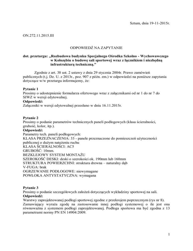 Sztum, dnia 19-11-2015r. ON.272.11.2015.III ODPOWIEDŹ NA ZAPYTANIE dot. przetargu: „Rozbudowa budynku Specjalnego Ośrodka Szkolno - Wychowawczego w Kołozębiu o budowę sali sportowej wraz z łącznikiem i niezbędną infrastrukturą techniczną.” Zgodnie z art. 38 ust. 2 ustawy z dnia 29 stycznia 2004r. Prawo zamówień publicznych (t.j. Dz. U. z 2013r., poz. 907 z późn. zm.) w odpowiedzi na poniższe zapytania dotyczące w/w przetargu informujemy, że: Pytanie 1 Prosimy o udostepnienie formularza ofertowego wraz z załącznikami od nr 1 do nr 7 do SIWZ w wersji edytowalnej. Odpowiedź: Załączniki w wersji edytowalnej przesłano w dniu 16.11.2015r. Pytanie 2 Prosimy o podanie parametrów technicznych paneli podłogowych (klasa ścieralności, grubość, kolor, itp.). Odpowiedź: Parametry tech. paneli podłogowych: KLASA PRZEZNACZENIA: 33 - panele przeznaczone do pomieszczeń użyteczności publicznej o dużym natężeniu ruchu KLASA ŚCIERALNOŚCI: AC5 GRUBOŚĆ: 10mm. BEZKLEJOWY SYSTEM MONTAŻU SZEROKOŚĆ DESKI: deski o szerokości ok. 190mm lub 160mm STRUKTURA POWIERZCHNI: struktura drewna – naturalny dąb V-FUGA: brak OGRZEWANIE PODŁOGOWE: niewymagane POWŁOKA ANTYSTATYCZNA: wymagana Pytanie 3 Prosimy o podanie szczegółowych założeń dotyczących wykładziny sportowej na sali. Odpowiedź: Warstwy zaprojektowanej podłogi sportowej zgodne z przekrojem poprzecznym (rys nr 8). Zamawiający wyraża zgodę na zastosowanie innej podłogi systemowej o ile jest ona równoważna z systemem podłogi zaprojektowanej. Podłoga sportowa ma być zgodna z 13 parametrami normy PN EN 14904:2009. 1 Pytanie 4 Z jakiego materiału drzwi zewnętrzne przyjąć do wyceny? W opisie do architektury zaistniała rozbieżność (PCV czy ALU?). Odpowiedź: Należy przyjąć do wyceny drzwi zewnętrzne z aluminium Pytanie 5 Prosimy o podanie szczegółowego opisu balustrad schodowych i balustrad przy podjeździe. Jaki kolor, z jakiego materiału itd. Odpowiedź: Schemat wykonania balustrad klatek schodowych zamieszczono w zestawie nr V pyt. 17 Balustrady przy podjeździe umieszczone na wysokości 0,75 i 0,9 m od płaszczyzny ruchu. Poręcze na słupkach z rur okrągłych RO 42,4x3,2mm pochwyty oraz słupki pośrednie wykonane z rur okrągłych RO 26,9x2,9mm. Elementy podjazdu malować proszkowo w kolorze szarym. Pytanie 6 Pozycja nr 457 przedmiaru robót cyt.: „Tablice informacyjne ogólne wg projektu wykończenia wnętrz”. Prosimy o udostepnienie przywołanego projektu. Pozycja nr 460 przedmiaru również przywołuje w/w projekt. Odpowiedź: Projektu wykończenia wnętrz nie przewiduje się. Tablice opisujące pokoje np. szatnia, magazyn sprzętu, pokój nauczycielski itd. o wymiarach min 100x300mm z płyty PCV gr. 1mm w kolorze biało niebieskim. Tablice dla znaków ewakuacyjnych, ppoż z płyty PCV gr. 1mm fotoluminescencyjne. Pytanie 7 Z jakiego materiału i o jakich wymiarach ma zostać wykonana tablica informacyjna na elewacji (poz. 458 przedmiaru). Odpowiedź: Tablica 90x200cm nad głównym wejściem do budynku z napisem „SALA SPORTOWA”. Tablica ze szkła bezpiecznego gr. 6mm, litery o wysokości 20cm w kolorze czerwonym. Pytanie 8 Prosimy o udostepnienie opisu wyposażenia podstawowego i pomocniczego sali przywołanego w przedmiarze robót. Odpowiedź: - Tablica świetlna sterowana bezprzewodowo: Wymiar tablicy 100 cm x 70 cm Tablica wskazuje parametry: czas rzeczywisty; czas gry - ustawiany w dowolnej konfiguracji w zakresie 0-90 minut; wynik gry 0-199. Wielkość znaków: ok 100 mm. Tablica powinna wydawać sygnał dźwiękowy. Znaki na tablicy widoczne z odległości - do 30 metrów, Zasilanie: 230 V / 50 Hz. Ciężar: ok. 25 kg. - Stanowisko sędziowskie: Stanowisko sędziowskie powinno składać się z: 2 a) Stojak sędziowski szt. 1 do siatkówki z regulacją wysokości i pulpitem. Stalowy lakierowany proszkowo. Stojak ze stopniową regulacją wysokości co 50mm, od 1150 do 1450 mm; S-119 Stojak do siatkówki plażowej ze stopniową regulacją wysokości co 50mm, od 1150 do 1450 mm b) Tablica wyników do tenisa stołowego szt. 3 Wymiary po ustawieniu: 25 x 16 x 12 cm Punkty: 0-25 Sety: 0-5 Zapięcie: zatrzaski c) Stolik sędziowski szt. 2 wykonany z profilu 30x30 i 40x20, malowany proszkowo. Blat wykonany z płyty laminowanej o gr 18 mm wykończony obrzeżem PCV 2mm. Zatyczki zabezpieczające podłogę przed zarysowaniem. Stolik posiada stopki ułatwiające wypoziomowanie stołu. Stolik 2-os posiada blat o wymiarze 1300x500. Krzesło sędziowskie szt. 5 wykonane z rury fi 25, malowanej proszkowo. Siedzisko i oparcie z lakierowanej sklejki bukowej o grubości 8 mm. Zatyczki zabezpieczające podłogę przed zarysowaniem. Rozmiar nr 7. - Siatka ochronna (piłkochwyty) o oczkach 4x4cm o wymiarach 12,5x7,0m. - Koszykówka główna - dwa kosze naścienne podnoszone elektrycznie pionowo na tablicach z ramą metalową. - Siatkówka - zestaw turniejowy - 2 słupki aluminiowe, 2 osłony na słupki, siatka turniejowa – 1 kpl - Drabinki gimnastyczne 90x250cm – 16 kpl - Trybuny składane teleskopowe typu ławkowego 3 rzędowe, dł. modułu 300cm, dla min 24 osób. Różnica poziomów między podestami: 300mm Wysokość stopni pośrednich: 150mm Wykończenie powierzchni części metalowych: malowanie proszkowe w kolorze szarym Materiał podestu: płyta antypoślizgowa gr. 18mm, kolor drewnopodobny Głębokość trybuny po rozłożeniu: 2050mm Głębokość trybuny po złożeniu: 1229mm Wysokość ostatniego podestu: 600mm - Trybuna składana jezdna –posiada możliwość ruchu w kierunku prostopadłym do ściany (płaszczyzny czołowej trybun) oraz - po uniesieniu jej przy pomocy systemowych wózków możliwość transportu w dowolne miejsce. Pytanie 9 Prosimy o podanie sposobu otwierania bram stalowych. Odpowiedź: Zamawiający udzielił odpowiedzi na powyższe pytanie w zestawie nr XVII pyt. 4. Pytanie 10 Prosimy o podanie parametrów koszy na śmieci – 5 kpl. Przywołanych w 