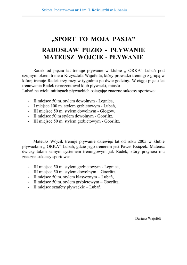Szkoła Podstawowa nr 1 im. T. Kościuszki w Lubaniu ,,SPORT TO MOJA PASJA” RADOSŁAW PUZIO - PŁYWANIE MATEUSZ WÓJCIK - PŁYWANIE Radek od pięciu lat trenuje pływanie w klubie ,, ORKA'' Lubań pod czujnym okiem trenera Krzysztofa Wajcfelta, który prowadzi treningi z grupą w której trenuje Radek trzy razy w tygodniu po dwie godziny. W ciągu pięciu lat trenowania Radek reprezentował klub pływacki, miasto Lubań na wielu mitingach pływackich osiągając znaczne sukcesy sportowe: - II miejsce 50 m. stylem dowolnym - Legnica, I miejsce 100 m. stylem grzbietowym - Lubań, III miejsce 50 m. stylem dowolnym - Głogów, II miejsce 50 m stylem dowolnym - Goorlitz, III miejsce 50 m. stylem grzbietowym - Goorlitz. Mateusz Wójcik trenuje pływanie dziewięć lat od roku 2005 w klubie pływackim ,, ORKA” Lubań, gdzie jego trenerem jest Paweł Książek. Mateusz ćwiczy takim samym systemem treningowym jak Radek, który przynosi mu znaczne sukcesy sportowe: - III miejsce 50 m. stylem grzbietowym - Legnica, III miejsce 50 m. stylem dowolnym – Goorlitz, II miejsce 50 m. stylem klasycznym – Lubań, II miejsce 50 m. stylem grzbietowym – Goorlitz, II miejsce sztafety pływackie – Lubań. Dariusz Wajcfelt