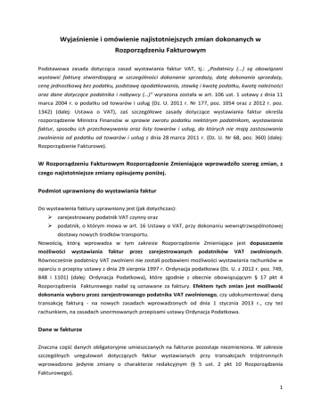Wyjaśnienie i omówienie najistotniejszych zmian dokonanych w Rozporządzeniu Fakturowym Podstawowa zasada dotycząca zasad wystawiania faktur VAT, tj.: „Podatnicy (…) są obowiązani wystawić fakturę stwierdzającą w szczególności dokonanie sprzedaży, datę dokonania sprzedaży, cenę jednostkową bez podatku, podstawę opodatkowania, stawkę i kwotę podatku, kwotę należności oraz dane dotyczące podatnika i nabywcy (…)” wyrażona została w art. 106 ust. 1 ustawy z dnia 11 marca 2004 r. o podatku od towarów i usług (Dz. U. 2011 r. Nr 177, poz. 1054 oraz z 2012 r. poz. 1342) (dalej: Ustawa o VAT), zaś szczegółowe zasady dotyczące wystawiania faktur określa rozporządzenie Ministra Finansów w sprawie zwrotu podatku niektórym podatnikom, wystawiania faktur, sposobu ich przechowywania oraz listy towarów i usług, do których nie mają zastosowania zwolnienia od podatku od towarów i usług z dnia 28 marca 2011 r. (Dz. U. Nr 68, poz. 360) (dalej: Rozporządzenie Fakturowe). W Rozporządzeniu Fakturowym Rozporządzenie Zmieniające wprowadziło szereg zmian, z czego najistotniejsze zmiany opisujemy poniżej. Podmiot uprawniony do wystawiania faktur Do wystawienia faktury uprawniony jest (jak dotychczas): zarejestrowany podatnik VAT czynny oraz podatnik, o którym mowa w art. 16 Ustawy o VAT, przy dokonaniu wewnątrzwspólnotowej dostawy nowych środków transportu. Nowością, którą wprowadza w tym zakresie Rozporządzenie Zmieniające jest dopuszczenie możliwości wystawiania faktur przez zarejestrowanych podatników VAT zwolnionych. Równocześnie podatnicy VAT zwolnieni nie zostali pozbawieni możliwości wystawiania rachunków w oparciu o przepisy ustawy z dnia 29 sierpnia 1997 r. Ordynacja podatkowa (Dz. U. z 2012 r. poz. 749, 848 i 1101) (dalej: Ordynacja Podatkowa), które zgodnie z obecnie obowiązującym § 17 pkt 4 Rozporządzenia Fakturowego nadal są uznawane za faktury. Efektem tych zmian jest możliwość dokonania wyboru przez zarejestrowanego podatnika VAT zwolnionego, czy udokumentować daną transakcję fakturą - na nowych zasadach wprowadzonych od dnia 1 stycznia 2013 r., czy też rachunkiem, na zasadach unormowanych przepisami ustawy Ordynacja Podatkowa. Dane w fakturze Znaczna część danych obligatoryjnie umieszczanych na fakturze pozostaje niezmieniona. W zakresie szczególnych uregulowań dotyczących faktur wystawianych przy transakcjach trójstronnych wprowadzono jedynie zmiany o charakterze redakcyjnym (§ 5 ust. 2 pkt 10 Rozporządzenia Fakturowego). 1 Rozporządzenie Zmieniające zlikwidowało wymóg umieszczania na fakturze dokumentującej nabycie paliw numeru rejestracyjnego samochodu, czy wymóg zamieszczania terminu płatności należności w przypadku małych podatników rozliczających się metodą kasową. Ponadto obecnie faktura nie musi zawierać oznaczenia "Faktura VAT". W nowym brzmieniu Rozporządzenia Fakturowego mówi się ogólnie o fakturze. Likwidacja powyższych obowiązków nie oznacza jednak, że podatnicy dla własnych potrzeb dokumentacyjnych nie mogą zamieszczać takich danych. 1. Dane obligatoryjne W Rozporządzeniu Fakturowym od 1 stycznia 2013 r. zlikwidowane zostały określenia „Faktura VATMP”, „Faktura VAT marża”, zlikwidowano także możliwość umieszczenia informacji, iż podatek VAT rozlicza nabywca. Jednocześnie wprowadzono obowiązek umieszczenia na fakturze: 1. wyrazów „metoda kasowa”, które zastępują dotychczasowe wyrażenie „Faktura VAT-MP” (§ 5 ust. 2 pkt 1 Rozporządzenia Fakturowego), 2. wyrazu „samofakturowanie” (§ 5 ust. 2 pkt 2 Rozporządzenia Fakturowego), 3. wyrazów „procedura marży dla biur podróży”, które zastępują dotychczasowe wyrażenie „FAKTURA VAT marża” bądź też odesłanie do przepisów art. 119 Ustawy o VAT (§ 5 ust. 2 pkt 3 Rozporządzenia Fakturowego), 4. wyrazów „procedura marży – towary używane”; „procedura marży – dzieła sztuki” lub „procedura marży – przedmioty kolekcjonerskie i antyki”, które zastępują dotychczasowe wyrażenie „FAKTURA VAT marża” bądź też odesłanie do przepisów art. 120 Ustawy o VAT (§ 5 ust. 2 pkt Rozporządzenia Fakturowego), 5. wyrazów „odwrotne obciążenie” – rozwiązanie to może być stosowane jako jedyne z dotychczasowych trzech obowiązujących oznaczeń dla tego rodzaju transakcji (§ 5 ust. 2 pkt 5 Rozporządzenia Fakturowego). Pozostał natomiast obowiązek umieszczania na fakturze podstawy zastosowania przez podatnika zwolnienia przy dostawie towarów czy wykonania usług. W przypadku zastosowania przez podatnika zwolnienia przy dostawie towarów czy wykonywaniu usług, jest on zobowiązany do wskazania dodatkowo na fakturze: a) „przepisu ustawy albo aktu wydanego na podstawie ustawy, na podstawie którego podatnik stosuje zwolnienie od podatku, b) przepisu dyrektywy, który zwalnia od podatku taką dostawę towarów lub takie świadczenie usług, lub 2 c) innej podstawy prawnej wskazującej na to, że dostawa towarów lub świadczenie usług korzysta ze zwolnienia” (§ 5 ust. 2 pkt 6 Rozporządzenia Fakturowego). Powyższe zmiany dotyczą podatników, którzy rozliczają VAT w procedurach szczególnych oraz małych podatników stosujących metodę kasową, przy czym mogą oni zachować dotychczasowe oznaczenia faktur, pod warunkiem, że naniosą dodatkowe oznaczenia np. wyrazy „metoda kasowa” czy „procedura marży dla biur podróży”. 2. Imiona i nazwiska lub nazwy podatnika i nabywcy W zmienionym § 5 ust. 1 Rozporządzenia Fakturowego wskazano, iż obecnie faktura powinna zawierać m.in. imiona i nazwiska lub nazwy podatnika i nabywcy towarów lub usług oraz ich adresy. Do dnia 31 grudnia 2012 roku z tego przepisu wynikało, że faktura miała zawierać m.in. "imiona i nazwiska lub nazwy bądź nazwy skrócone sprzedawcy i nabywcy oraz ich adresy". Przepis ten w nowym brzmieniu nie wskazuje, że faktura powinna zawierać "nazwy skr
