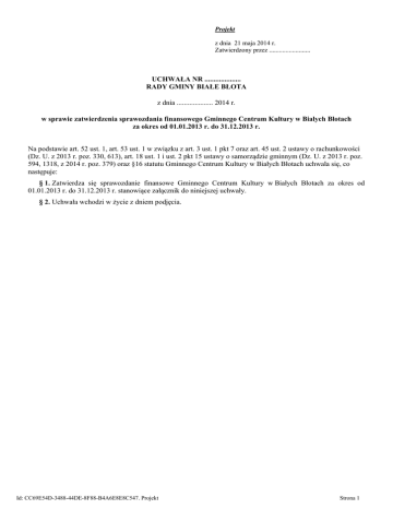 Projekt z dnia 21 maja 2014 r. Zatwierdzony przez ......................... UCHWAŁA NR .................... RADY GMINY BIAŁE BŁOTA z dnia .................... 2014 r. w sprawie zatwierdzenia sprawozdania finansowego Gminnego Centrum Kultury w Białych Błotach za okres od 01.01.2013 r. do 31.12.2013 r. Na podstawie art. 52 ust. 1, art. 53 ust. 1 w związku z art. 3 ust. 1 pkt 7 oraz art. 45 ust. 2 ustawy o rachunkowości (Dz. U. z 2013 r. poz. 330, 613), art. 18 ust. 1 i ust. 2 pkt 15 ustawy o samorządzie gminnym (Dz. U. z 2013 r. poz. 594, 1318, z 2014 r. poz. 379) oraz §16 statutu Gminnego Centrum Kultury w Białych Błotach uchwala się, co następuje: § 1. Zatwierdza się sprawozdanie finansowe Gminnego Centrum Kultury w Białych Błotach za okres od 01.01.2013 r. do 31.12.2013 r. stanowiące załącznik do niniejszej uchwały. § 2. Uchwała wchodzi w życie z dniem podjęcia. Id: CC69E54D-3488-44DE-8F88-B4A6E8E8C547. Projekt Strona 1 Sprawozdanie finansowe GCK za okres od 01.01.2013 r. do 31.12.2013 r. Sprawozdanie zawiera: 1. Bilans na dzień 31.12.2013 r. 2. Rachunek zysków i strat za okres od 01.01.2013 r. do 31.12.2013 r. 3. Informację dodatkową za okres od 01.01.2013 r. do 31.12.2013 r. 4. Sprawozdanie merytoryczne za okres od 01.01.2013 r. do 31.12.2013 r. Wprowadzenie do sprawozdania finansowego za okres od 01.01.2013 r. do 31.12.2013 r. I. INFORMACJE OGÓLNE: Id: CC69E54D-3488-44DE-8F88-B4A6E8E8C547. Projekt Strona 1 1. Dane identyfikacyjne jednostki: Nazwa: Gminne Centrum Kultury Siedziba: 86-005 Białe Błota, ul. Czysta 1A Nr NIP: 5542917559 Rejestracja: Rejestr Instytucji Kultury prowadzony przez Urząd Gminy w Białych Błotach pod nr 3 nr REGON 340029753 Podstawowy przedmiot działalności wg PKD (2007): 9004Z - działalność obiektów kulturalnych Gminne Centrum Kultury jest samorządową instytucją kultury powstałą 17.02.2012 roku na mocy Uchwały RGK.0007.179.2011 r. Rady Gminy Białe Błota z dnia 29 grudnia 2011 roku w sprawie połączenia gminnych instytucji kultury: Białobłockiego Ośrodka Kultury w Białych Błotach oraz Wiejskiego Ośrodka Kultury w Łochowie w jedną instytucję pod nazwą Gminne Centrum Kultury oraz nadania jej statutu. Przez nowo utworzoną jednostkę przejęte zostało mienie, zobowiązania i wierzytelności połączonych instytucji. GCK prowadzi działalność i gospodarkę finansową na podstawie ustawy o organizowaniu i prowadzeniu działalności kulturalnej z dnia 25 października 1991 r. (Dz. U. z 2012 r. poz. 406, z 2014 r. poz. 423). Ośrodek realizuje zadania z dziedziny wychowania, edukacji, upowszechniania kultury oraz rozwijania i zaspokajania potrzeb społeczeństwa w tej dziedzinie. 2. Informacje o posiadanych jednostkach organizacyjnych: Podmiot nie posiada wyodrębnionych jednostek organizacyjnych. 3. Wskazania okresu objętego sprawozdaniem: Sprawozdanie za okres obrotowy trwający od 01 stycznia 2013 r. do 31 grudnia 2013 r. 4. Informacje o trwaniu działalności: Sprawozdanie finansowe zostało sporządzone przy założeniu kontynuowania działalności. W okresie od dnia bilansowego do dnia sporządzenia sprawozdania nie nastąpiły istotne zdarzenia mające wpływ na działalność GCK. 5. Opodatkowanie: Zgodnie z art. 17 ust. 1 pkt 4 ustawy o podatku dochodowym od osób prawnych z dnia 15 lutego 1992 roku dochody instytucji kultury w części przeznaczonej na cele statutowe są wolne od podatku dochodowego. Gminne Centrum Kultury nie jest płatnikiem podatku VAT. 6. Badanie sprawozdania: Sprawozdanie finansowe sporządzone zostało na podstawie ksiąg rachunkowych prowadzonych w bieżącym okresie obrotowym zgodnie z przyjętymi zasadami polityki rachunkowości, w sposób zgodny z postanowieniami ustawy o rachunkowości. Sprawozdanie finansowe nie podlega obowiązkowi badania na podstawie art. 64 ustawy o rachunkowości. II. OMÓWIENIE PRZYJĘTYCH ZASAD (POLITYKI RACHUNKOWOŚCI) 1. Wycena aktywów i pasywów: Wykazane w bilansie aktywa i pasywa wycenia się przy uwzględnieniu nadrzędnych zasad rachunkowości, w sposób określony ustawą o rachunkowości. Podstawę wyceny aktywów i pasywów na dzień bilansowy stanowią: - dla rzeczowych aktywów trwałych oraz wartości niematerialnych i prawnych - ceny ich nabycia, pomniejszone o odpisy amortyzacyjne - dla zobowiązań - kwoty wymagające spłaty na dzień bilansowy - dla należności - kwoty wymagające spłaty na dzień bilansowy - dla środków pieniężnych w banku i kasie - ich wartość nominalna. 2. Ewidencja rzeczowych aktywów trwałych oraz wartości niematerialnych i prawnych: Składniki majątku o okresie używania dłuższym niż rok i wartości początkowej nieprzekraczającej 3 500,00 zł Id: CC69E54D-3488-44DE-8F88-B4A6E8E8C547. Projekt Strona 2 zalicza się do środków trwałych lub wartości niematerialnych i prawnych i wprowadza do ewidencji środków trwałych lub wartości niematerialnych i prawnych. Od tego rodzaju składników majątku dokonuje się jednorazowych odpisów amortyzacyjnych w miesiącu przekazania do użytkowania. Składniki majątku o wartości początkowej powyżej 3 500,00 zł zalicza się do środków trwałych lub wartości niematerialnych i prawnych i wprowadza do ewidencji środków trwałych lub wartości niematerialnych i prawnych. Odpisów amortyzacyjnych dokonuje się metodą liniową z zastosowaniem stawek amortyzacyjnych przewidzianych w wykazie rocznych stawek amortyzacyjnych, stanowiącym załącznik do ustawy o podatku dochodowym od osób prawnych. 3. Zmiany metod księgowości i wyceny dokonane w roku obrotowym: W bieżącym okresie obrotowym nie dokonano zmian metod księgowania ani wyceny. BILANS sporządzony na dzień 31.12.2013 r. AKTYWA stan na 31.12.2012 A Aktywa trwałe 182 757,47 PASYWA 31.12.2013 179 178,32 A Kapitał (fundusz) własny stan na 31.12.2012 31.12.2013 101 310,66 111 195,27 71 948,86 101 310,66 0,00 II Należne wpłaty na kapitał podstawowy (wielkość ujemna) 0,00 0,00 0,