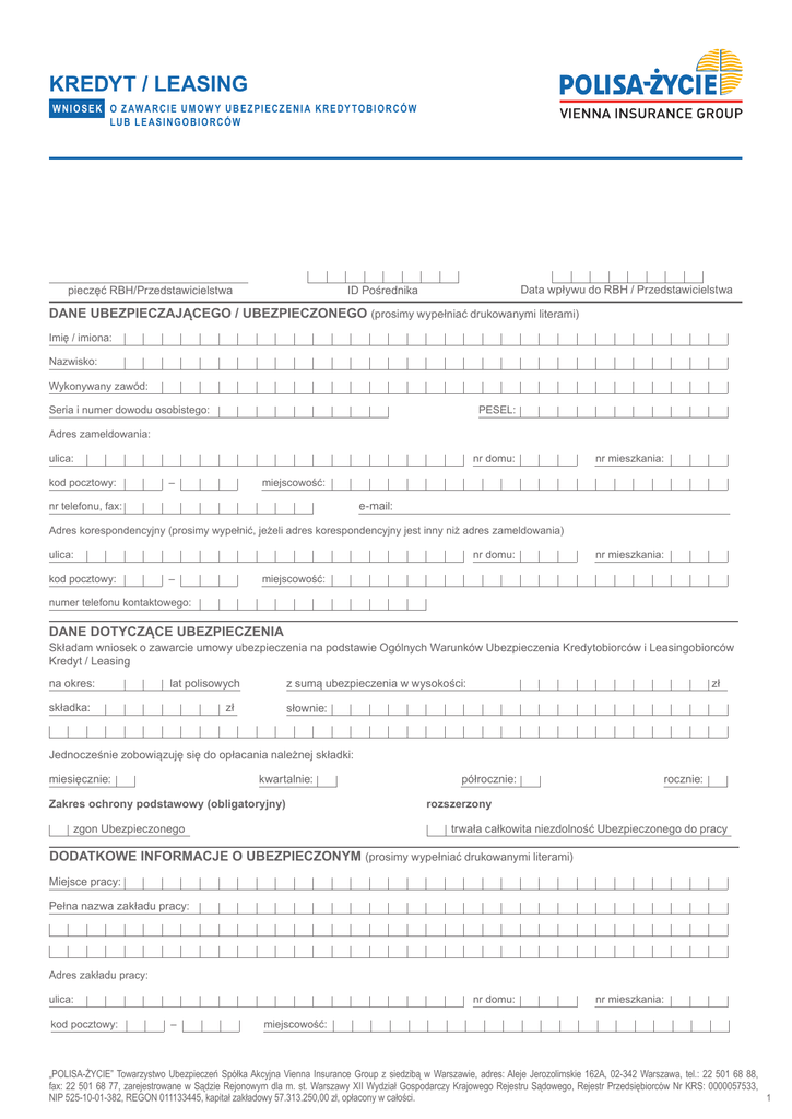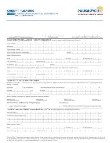 KREDYT / LEASING W N I O S E K O Z AWA R C I E U M O W Y U B E Z P I E C Z E N I A K R E DY T O B I O R C Ó W LUB LEASINGOBIORCÓW pieczęć RBH/Przedstawicielstwa Data wpływu do RBH / Przedstawicielstwa ID Pośrednika DANE UBEZPIECZAJĄCEGO / UBEZPIECZONEGO (prosimy wypełniać drukowanymi literami) Imię / imiona: Nazwisko: Wykonywany zawód: Seria i numer dowodu osobistego: PESEL: Adres zameldowania: ulica: kod pocztowy: nr domu: – nr mieszkania: miejscowość: e-mail: nr telefonu, fax: Adres korespondencyjny (prosimy wypełnić, jeżeli adres korespondencyjny jest inny niż adres zameldowania) ulica: kod pocztowy: nr domu: – nr mieszkania: miejscowość: numer telefonu kontaktowego: DANE DOTYCZĄCE UBEZPIECZENIA Składam wniosek o zawarcie umowy ubezpieczenia na podstawie Ogólnych Warunków Ubezpieczenia Kredytobiorców i Leasingobiorców Kredyt / Leasing na okres: lat polisowych składka: z sumą ubezpieczenia w wysokości: zł zł słownie: Jednocześnie zobowiązuję się do opłacania należnej składki: miesięcznie: kwartalnie: Zakres ochrony podstawowy (obligatoryjny) zgon Ubezpieczonego półrocznie: rocznie: rozszerzony trwała całkowita niezdolność Ubezpieczonego do pracy DODATKOWE INFORMACJE O UBEZPIECZONYM (prosimy wypełniać drukowanymi literami) Miejsce pracy: Pełna nazwa zakładu pracy: Adres zakładu pracy: ulica: kod pocztowy: nr domu: – nr mieszkania: miejscowość: „POLISA-ŻYCIE” Towarzystwo Ubezpieczeń Spółka Akcyjna Vienna Insurance Group z siedzibą w Warszawie, adres: Aleje Jerozolimskie 162A, 02-342 Warszawa, tel.: 22 501 68 88, fax: 22 501 68 77, zarejestrowane w Sądzie Rejonowym dla m. st. Warszawy XII Wydział Gospodarczy Krajowego Rejestru Sądowego, Rejestr Przedsiębiorców Nr KRS: 0000057533, NIP 525-10-01-382, REGON 011133445, kapitał zakładowy 57.313.250,00 zł, opłacony w całości. 1 Charakter wykonywanej pracy (zaznacz właściwe): biurowa lub administracyjna nie wymagająca pracy fizycznej wymagająca przebywania poza pomieszczeniami biurowymi i/lub okresowego wykonywania pracy fizycznej ciągła praca fizyczna Branża zatrudnienia (zaznacz właściwe): Wojsko Produkcja maszyn i środków transportu Pozostałe branże przemysłu produkcyjnego i przetwórczego Policja Hutnictwo i odlewnictwo Rolnictwo Straż pożarna Przemysł drzewny Transport kołowy Przemysł wydobywczy Przemysł gumowy i tworzyw sztucznych inne (jakie) Rybołówstwo, żegluga i transport morski Budownictwo Czy wykonywany zawód wymaga: TAK NIE pracy na wysokości powyżej 5 metrów? udziału w pracach wydobywczych i/lub budowlanych pod ziemią? naprawy lub konserwacji maszyn lub urządzeń wysokiego napięcia? udziału w połowie ryb na morzu z pokładu jednostki o długości do 25 metrów? stykania się z materiałami bądź substancjami: wybuchowym łatwopalnymi, trującymi lub żrącymi, radioaktywnymi bądź azbestem? (podkreśl właściwe) przebywania na morzu poza obszarem wód terytorialnych? dysponowania bronią palną? pracy w powietrzu na pokładzie samolotu licencjonowanych linii lotniczych? prowadzenia samochodów ciężarowych bądź autobusów poza obszarami zabudowanymi? Wzrost: cm Waga: Zmiana wagi w ostatnim roku / przyrost: kg kg spadek: kg Odpowiadając na pytania w poniższej tabeli, proszę wstawić znak „X” w odpowiedniej rubryce. W przypadku wstawienia znaku „X” w rubryce „TAK” na pytanie należy udzielić odpowiedzi szczegółowej. Pytanie TAK NIE ODPOWIEDŹ SZCZEGÓŁOWA 1 Czy w Pana/i najbliższej rodzinie (ojciec, matka, brat, siostra) ktoś chorował, choruje lub zmarł z powodu: choroby serca lub naczyń, nadciśnienia tętniczego, udaru mózgu, cukrzycy, nowotworu, choroby nerek, choroby dziedzicznej (np. hemofilia, dystrofia mięśniowa, inne), zaburzeń psychicznych, alkoholizmu? 2 Czy jest Pan/i obecnie ubezpieczony/a w ramach indywidualnych ubezpieczeń na życie? 3 Czy przy zawieraniu poprzednich umów ubezpieczenia spotkał/a się Pan/i z odmową, ograniczeniem, odroczeniem lub podwyższoną składką? 4 Czy uprawia Pan/i sporty? Jeżeli TAK, to proszę podać dziedzinę oraz określić czy uprawia Pan/i sport rekreacyjnie czy profesjonalnie. 5 Czy korzysta Pan/i z powietrznych środków transportu innych, niż środki koncesjonowanych przewoźników? 6 Czy pije Pan/i napoje alkoholowe? Jeżeli TAK, proszę podać jak często, w jakiej ilości i jaki rodzaj. 7 Czy pali lub kiedykolwiek palił/a Pan/i papierosy, tytoń? Jeżeli TAK, proszę podać od kiedy, jaką markę i ilość dziennie. 8 Czy używa lub używał/a Pan/i środków uznawanych za narkotyki (haszysz, marihuana, kokaina, amfetamina, heroina)? 9 Czy był/a Pan/i ofiarą wypadku komunikacyjnego lub innego? 10 Czy w okresie ostatnich pięciu lat: (w przypadku odpowiedzi TAK, proszę podać okresy, przyczyny, rodzaj i wynik zastosowanego leczenia): a) przebywał/a Pan/i w szpitalu (proszę dołączyć kopię karty wypisowej) lub podobnych placówkach w celu wykonania zabiegu, badań, przeprowadzenia leczenia? b) poddał/a się Pan/i leczeniu specjalistycznemu takiemu jak naświetlania, chemioterapia, immunoterapia, kobaltoterapia, inne (podać jakie)? c) wykonał/a Pan/i badania lekarskie (poza medycyną pracy) takie jak: analiza krwi, badanie moczu, elektrokardiogram, prześwietlenie? d) przeprowadzono u Pana/i transfuzję krwi lub preparatu krwiopochodnego? e) wykonywał/a Pan/i test na obecność wirusa HIV? jeśli tak to kiedy? jaki wynik: pozytywny (obecny); wynik negatywny (nieobecny) 2 Pytanie TAK NIE ODPOWIEDŹ SZCZEGÓŁOWA f) chorował/a na infekcję spowodowaną nabytym brakiem odporności organizmu (AIDS)? 11 Czy otrzymuje Pan/i rentę inwalidzką? Jeżeli TAK, proszę podać datę przyznania, przyczyną oraz rodzaj niezdolności do pracy. 12 Czy podjął/podjęła Pan/i kroki zmierzające do uzyskania renty inwalidzkiej? 13 Czy obecnie przerwał/a Pan/i pracę? Jeżeli TAK, proszę podać przyczynę, datę przerwania pracy oraz dat