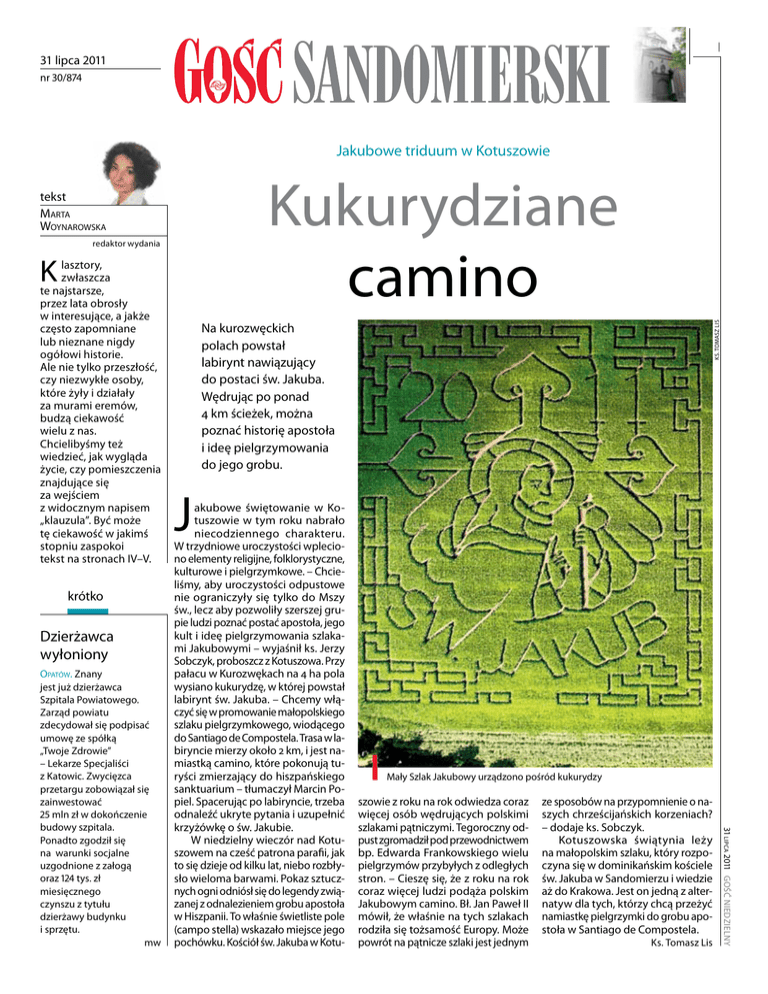 I 31 lipca 2011 nr 30/874 Jakubowe triduum w Kotuszowie redaktor wydania K lasztory, zwłaszcza te najstarsze, przez lata obrosły w interesujące, a jakże często zapomniane lub nieznane nigdy ogółowi historie. Ale nie tylko przeszłość, czy niezwykłe osoby, które żyły i działały za murami eremów, budzą ciekawość wielu z nas. Chcielibyśmy też wiedzieć, jak wygląda życie, czy pomieszczenia znajdujące się za wejściem z widocznym napisem „klauzula”. Być może tę ciekawość w jakimś stopniu zaspokoi tekst na stronach IV–V. krótko Dzierżawca wyłoniony Na kurozwęckich polach powstał labirynt nawiązujący do postaci św. Jakuba. Wędrując po ponad 4 km ścieżek, można poznać historię apostoła i ideę pielgrzymowania do jego grobu. J akubowe świętowanie w Kotuszowie w tym roku nabrało niecodziennego charakteru. W trzydniowe uroczystości wpleciono elementy religijne, folklorystyczne, kulturowe i pielgrzymkowe. – Chcieliśmy, aby uroczystości odpustowe nie ograniczyły się tylko do Mszy św., lecz aby pozwoliły szerszej grupie ludzi poznać postać apostoła, jego kult i ideę pielgrzymowania szlakami Jakubowymi – wyjaśnił ks. Jerzy Sobczyk, proboszcz z Kotuszowa. Przy pałacu w Kurozwękach na 4 ha pola wysiano kukurydzę, w której powstał labirynt św. Jakuba. – Chcemy włączyć się w promowanie małopolskiego szlaku pielgrzymkowego, wiodącego do Santiago de Compostela. Trasa w labiryncie mierzy około 2 km, i jest namiastką camino, które pokonują turyści zmierzający do hiszpańskiego sanktuarium – tłumaczył Marcin Popiel. Spacerując po labiryncie, trzeba odnaleźć ukryte pytania i uzupełnić krzyżówkę o św. Jakubie. W niedzielny wieczór nad Kotuszowem na cześć patrona parafii, jak to się dzieje od kilku lat, niebo rozbłysło wieloma barwami. Pokaz sztucznych ogni odniósł się do legendy związanej z odnalezieniem grobu apostoła w Hiszpanii. To właśnie świetliste pole (campo stella) wskazało miejsce jego pochówku. Kościół św. Jakuba w Kotu- Mały Szlak Jakubowy urządzono pośród kukurydzy szowie z roku na rok odwiedza coraz więcej osób wędrujących polskimi szlakami pątniczymi. Tegoroczny odpust zgromadził pod przewodnictwem bp. Edwarda Frankowskiego wielu pielgrzymów przybyłych z odległych stron. – Cieszę się, że z roku na rok coraz więcej ludzi podąża polskim Jakubowym camino. Bł. Jan Paweł II mówił, że właśnie na tych szlakach rodziła się tożsamość Europy. Może powrót na pątnicze szlaki jest jednym ze sposobów na przypomnienie o naszych chrześcijańskich korzeniach? – dodaje ks. Sobczyk. Kotuszowska świątynia leży na małopolskim szlaku, który rozpoczyna się w dominikańskim kościele św. Jakuba w Sandomierzu i wiedzie aż do Krakowa. Jest on jedną z alternatyw dla tych, którzy chcą przeżyć namiastkę pielgrzymki do grobu apostoła w Santiago de Compostela. Ks. Tomasz Lis 31 lipca 2011 Gość Niedzielny Opatów. Znany jest już dzierżawca Szpitala Powiatowego. Zarząd powiatu zdecydował się podpisać umowę ze spółką „Twoje Zdrowie” – Lekarze Specjaliści z Katowic. Zwycięzca przetargu zobowiązał się zainwestować 25 mln zł w dokończenie budowy szpitala. Ponadto zgodził się na warunki socjalne uzgodnione z załogą oraz 124 tys. zł miesięcznego czynszu z tytułu dzierżawy budynku i sprzętu. mw ks. Tomasz Lis Kukurydziane camino tekst Marta Woynarowska Dobiegają końca prace przy drodze wojewódzkiej relacji Tarnobrzeg–Stalowa Wola Tarnobrzeg–Stalowa Wola, w tym budowa obwodnicy Grębowa. zm Nowa promocja Sandomierz. Od 11 lipca po ulicach największych miast Polski, Krakowa, Warszawy czy Lublina, jeżdżą autobusy komunikacji miejskiej obklejone reklamami Sandomierza. Mobilna reklama stolicy diecezji to niejedyny pomysł na roz- propagowanie jej walorów, bowiem do niedawna w centrum Warszawy na ekranie LCD, zamontowanym w pasażu handlowym „Złote Tarasy” oraz w hotelu „Marriot”, można było zobaczyć spot reklamowy o Sandomierzu. zm Ratują i na wodzie Marta Woynarowska tor przeszkód, budowa wału przeciwpowodziowego, slalom łodzi motorowych i wyścig łodzi wiosłowych. Niewiele brakło, a stalowowolska drużyna uplasowałaby się na podium, bo po pierwszych konkurencjach zajmowała drugie miejsce. Zabrakło jednak mocy łodzi motorowej, na której startowali. Prezes stalowowolskiego OSP Mariusz Janeczko zapowiedział, że w przyszłym roku stalowowolska drużyna już nie będzie musiała narzekać na sprzęt. wm Prace przy wymianie dachu na kościele Matki Bożej Szkaplerznej w Stalowej Woli Wymieniono drewniany szkielet, w miejsce ceramicznej dachówki położona będzie blacha miedziana, taka jak na wieżach. – Od nikogo nie dostajemy pieniędzy, parafianie sami ponoszą koszty remontu – zapewnia proboszcz ks. kan. Jan Folcik. wm Wakacje z Bogiem Ministranci wyjechali w nagrodę za całoroczną posługę Stalowowolscy strażacy wodno-nurkowi podczas finału zawodów Tarnobrzeg . Milion złotych na modernizację dróg, które zostały zniszczone podczas ubiegłorocznej powodzi, oraz 600 tys. zł na oczyszczenie rowów melioracyjnych przekazał dla Tarnobrzega minister spraw wewnętrznych i administracji Jerzy Miller. Dzięki promesie będzie można wyremon- tować odcinki dróg miejskich na osiedlu Sielec, przy ulicach Spółdzielcza i Nowowiejska, a także na osiedlu Zakrzów, gdzie modernizacji poddane będą ulice: Ceglana, Elektryczna i Wędkarska. Prócz tego wykonana zostanie odbudowa przepustów. zm W wielu miastach powiatowych naszej diecezji obchodzono Święto Policji. Dziękowano stróżom prawa za ofiarną i pełną poświęceń służbę, zaś komendanci wręczali odznaczenia resortowe i awanse na kolejne stopnie policyjne. W Sandomierzu świętokrzyskie, wojewódzkie obchody policyjnego święta Stalowa Wola. Ponad 250 osób z formacyjnych grup dzieci i młodzieży z parafii MB Królow