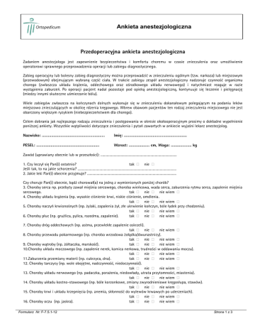Ankieta anestezjologiczna Przedoperacyjna ankieta anestezjologiczna Zadaniem anestezjologa jest zapewnienie bezpieczeństwa i komfortu choremu w czasie znieczulenia oraz umożliwienie operatorowi sprawnego przeprowadzenia operacji lub zabiegu diagnostycznego. Zabieg operacyjny lub bolesny zabieg diagnostyczny można przeprowadzić w znieczuleniu ogólnym (tzw. narkoza) lub miejscowym (przewodowym) obejmującym wybraną część ciała. W trakcie zabiegu zespół anestezjologiczny nadzoruje czynność organizmu chorego (zwłaszcza układu krążenia, oddechowego oraz ośrodkowego układu nerwowego) i natychmiast reaguje w razie wystąpienia zaburzeń. Po operacji pacjent nadal pozostaje pod opieką anestezjologiczną, kontynuuje się leczenie i pielęgnację (miedzy innymi skuteczne uśmierzanie bólu). Wiele zabiegów zwłaszcza na kończynach dolnych wykonuje się w znieczuleniu dokanałowym polegającym na podaniu leków miejscowo znieczulających w okolicę rdzenia kręgowego. Wbrew obawom pacjentów ten rodzaj znieczulenia miejscowego nie jest obarczony większym ryzykiem (niebezpieczeństwem dla chorego). Celem dobrania jak najlepszego rodzaju znieczulenia i postępowania w okresie okołooperacyjnym prosimy o dokładne wypełnienie poniższej ankiety. Wszystkie wątpliwości dotyczące znieczulenia i pytań zawartych w ankiecie wyjaśni lekarz anestezjolog. Nazwisko: ............................................................. Imię: ............................................................. PESEL: ............................................................. Wzrost: .................... cm, Waga: .................... kg Zawód (uprawiany obecnie lub w przeszłości): ....................................................................................... 1. Czy leczył się Pan(i) ostatnio? tak nie Jeśli tak, to na jakie schorzenia? ................................................................................................................. 2. Jakie leki Pan(i) obecnie przyjmuje? ...................................................................................................... Czy choruje Pan(i) obecnie, bądź chorował(a) na jedną z wymienionych poniżej chorób? 3. Choroby serca np. przebyty zawał mięśnia sercowego, choroba wieńcowa, wada serca, zaburzenia rytmu serca, zapalenie mięśnia sercowego. tak nie nie wiem 4. Choroby układu krążenia (np. wysokie ciśnienie krwi, niskie ciśnienie, omdlenia. tak nie nie wiem 5. Choroby naczyń krwionośnych (np. żylaki, zapalenia żył, złe ukrwienie kończyn, bóle łydek przy chodzeniu). tak nie nie wiem 6. Choroby płuc (np. gruźlica, pylica, rozedma, zapalenie). tak nie nie wiem 7. Choroby dróg oddechowych (np. astma, przewlekłe zapalenie oskrzeli). tak nie nie wiem 8. Choroby przewodu pokarmowego (np. choroba wrzodowa żołądka/dwunastnicy). tak nie nie wiem 9. Choroby wątroby (np. żółtaczka, marskość). tak nie nie wiem 10.Choroby układu moczowego (np. zapalenie nerek, kamica nerkowa, trudności w oddawaniu moczu). tak nie nie wiem 11.Zaburzenia przemiany materii (np. cukrzyca, dna). tak nie nie wiem 12. Choroby tarczycy (np. wole obojętne, nadczynność, niedoczynność). tak nie nie wiem 13. Choroby układu nerwowego (np. padaczka, porażenia, niedowłady, utrata przytomności, miastenia). tak nie nie wiem 14. Choroby układu kostno-stawowego (np. bóle korzonkowe, zmiany zwyrodnieniowe kręgosłupa, stawów). tak nie nie wiem 15. Choroby krwi i układu krzepnięcia (np. anemia, skłonność do wylewów krwawych po uderzeniach). tak nie nie wiem 16. Choroby oczu (np. jaskra). tak nie nie wiem Formularz Nr: F-7.5.1-12 Strona 1 z 3 Ankieta anestezjologiczna 17. Zmiany nastroju (np. depresja, nerwica). tak nie nie wiem 18. Uczulenia – alergie (np. katar sienny, leki, jodynę). tak nie nie wiem Jeśli tak, to na jakie substancje? ................................................................................................................. Jakie są objawy uczulenia ............................................................................................................................. 19. Inne schorzenia, nie wymienione powyżej? tak nie nie wiem Jeśli tak, to jakie? ............................................................................................................................................ 20. Czy był(a) Pan(i) już kiedyś operowany(a)? tak nie nie wiem Jeśli tak, to kiedy i z jakiego powodu? ...................................................................................................... ............................................................................................................................................................................... 21. Czy dobrze zniósł Pan(i) znieczulenie? tak nie nie wiem 22. Czy u krewnych Pana(i) wystąpiły kiedyś powikłania związane ze znieczuleniem? tak nie nie wiem 23. Czy miał Pan(i) transfuzję krwi? tak nie nie wiem Kiedy? .................................................................................................................................................................. 24. Kiedy miała Pani ostatnią miesiączkę? ............................................................................................... 25. Czy jest Pani w ciąży? tak nie nie wiem 26. Czy stosuje Pani doustne środki antykoncepcyjne? tak nie 27. Czy Pan(i) pali tytoń? tak nie Ile dziennie? ............................................ Od kiedy? ................................................................................... 28. Czy pije Pan(i) alkohol? tak rzadko dużo 29. Czy zażywa Pan(i) środki uspokajające, nasenne, narkotyki? tak nie Jakie? ................................................................................................................................................................... Tą część proszę pozostawić pustą do czasu rozmowy z lekarzem anestezjologiem Oświadczenie pacjenta: