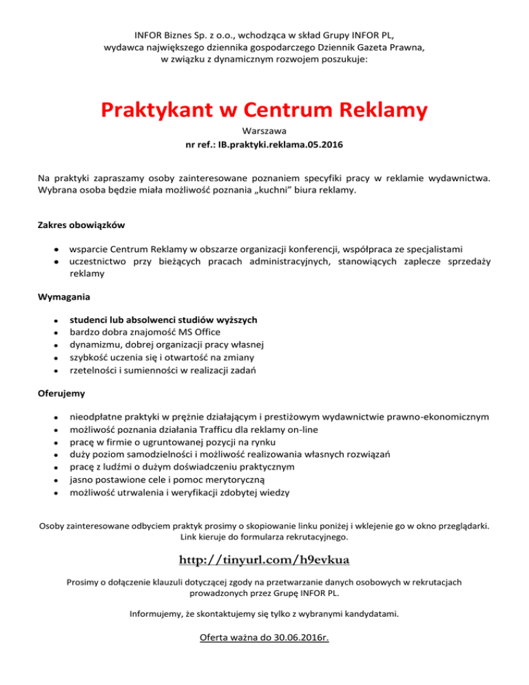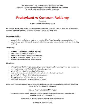 INFOR Biznes Sp. z o.o., wchodząca w skład Grupy INFOR PL, wydawca największego dziennika gospodarczego Dziennik Gazeta Prawna, w związku z dynamicznym rozwojem poszukuje: Praktykant w Centrum Reklamy Warszawa nr ref.: IB.praktyki.reklama.05.2016 Na praktyki zapraszamy osoby zainteresowane poznaniem specyfiki pracy w reklamie wydawnictwa. Wybrana osoba będzie miała możliwość poznania „kuchni” biura reklamy. Zakres obowiązków wsparcie Centrum Reklamy w obszarze organizacji konferencji, współpraca ze specjalistami uczestnictwo przy bieżących pracach administracyjnych, stanowiących zaplecze sprzedaży reklamy Wymagania studenci lub absolwenci studiów wyższych bardzo dobra znajomość MS Office dynamizmu, dobrej organizacji pracy własnej szybkość uczenia się i otwartość na zmiany rzetelności i sumienności w realizacji zadań Oferujemy nieodpłatne praktyki w prężnie działającym i prestiżowym wydawnictwie prawno-ekonomicznym możliwość poznania działania Trafficu dla reklamy on-line pracę w firmie o ugruntowanej pozycji na rynku duży poziom samodzielności i możliwość realizowania własnych rozwiązań pracę z ludźmi o dużym doświadczeniu praktycznym jasno postawione cele i pomoc merytoryczną możliwość utrwalenia i weryfikacji zdobytej wiedzy Osoby zainteresowane odbyciem praktyk prosimy o skopiowanie linku poniżej i wklejenie go w okno przeglądarki. Link kieruje do formularza rekrutacyjnego. http://tinyurl.com/h9evkua Prosimy o dołączenie klauzuli dotyczącej zgody na przetwarzanie danych osobowych w rekrutacjach prowadzonych przez Grupę INFOR PL. Informujemy, że skontaktujemy się tylko z wybranymi kandydatami. Oferta ważna do 30.06.2016r.