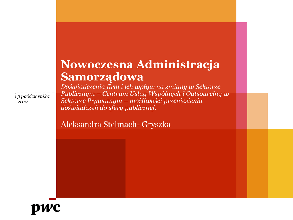 Nowoczesna Administracja Samorządowa 3 października 2012 Doświadczenia firm i ich wpływ na zmiany w Sektorze Publicznym – Centrum Usług Wspólnych i Outsourcing w Sektorze Prywatnym – możliwości przeniesienia doświadczeń do sfery publicznej. Aleksandra Stelmach- Gryszka Co to jest Centrum Usług Wspólnych? CUW to wyodrębniona część organizacji zorientowana na realizację czynności na zasadzie świadczenia usług (odbiorca i dostawca, jasne zasady i wynagrodzenie) innym podmiotom w ramach grupy. Gmina 1. Zadanie gminy 2. Zadanie gminy 3. Zadanie gminy Gmina 4. Zadanie gminy 5. Zadanie gminy Obsługa zadań i procesów dla wybranych jednostek 4 Etaty PwC 5 Etatów 3 Etaty 3 Etaty 5 Etatów 1. Zadanie gminy 2. Zadanie gminy 3. Zadanie gminy 4. Zadanie gminy 5. Zadanie gminy Obsługa zadań i procesów dla wybranych jednostek 15 Etatów 2 Korzyści wdrożenia CUW Oszczędności kosztowe Usprawnieni a jakości Aspekty strategiczne PwC 3 Jak rozwijają się CUW? Etap efektywności operacyjnej Etap efektywności organizacyjnej Etap efektywności kosztowej PwC 4 Jakie są trendy w obszarze CUW? • Polska jest liderem rynku CUW w Europie- otwarto już ponad 130 CUW i ciągle tworzone są nowe. Szacuje się, iż do końca 2012 roku w tym sektorze zatrudnienie znajdzie ponad 100 000 osób. • Wielofunkcyjne CUW dostarczające rozwiązania z zakresu finansów, zasobów ludzkich, zakupów, IT itd. • Wyższa efektywność CUW związana z ich stabilizacją oraz podnoszeniem kwalifikacji poprzez dostarczanie procesów bardziej skomplikowanych, wymagających specjalistycznej wiedzy np. technicznej, prawnej. • W coraz większym stopniu polskie firmy decydują się na wdrożenie CUW. PwC 5 A jak sytuacja wygląda na świecie? • 7% światowych SSC funkcjonuje w sektorze publicznym. • Światowe inwestycje rządowe w CUW rosną w tempie 20% rocznie. • W Stanach Zjednoczonych inicjatywy związane z CUW uznawane są za najlepszą strategię na ciężkie czasy. • Wg szacunków Advisory Group, w Wielkiej Brytanii obsługa administracyjna rządu kosztuje £ 9 miliardów rocznie więcej niż gdyby była oparta na najlepszych praktykach rynkowych. • CUW w sektorze wielowymiarowe. PwC publicznym stają się wielofunkcyjne oraz 6 Podsumowanie • Eksperci twierdzą, że CUW zawitają masowo również w Polskim sektorze publicznym. • To tylko kwestia czasu. • Ważne żeby się do tego kroku przygotować, aby podejmować mądre decyzje. PwC 7 Dziękuję! PwC 8