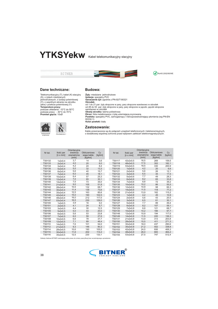 YTKSYekw Kabel telekomunikacyjny stacyjny RoHS RoHS 2002/95/WE Dane techniczne: Budowa: Telekomunikacyjny (T), kabel (K) stacyjny (S), o żyłach miedzianych jednodrutowych, o izolacji polwinitowej (Y), o wspólnym ekranie na ośrodku (ekw) i powłoce polwinitowej (Y) Temperatura pracy: podczas układania: -10°C do 50°C podczas pracy: - 40°C do 70°C Promień gięcia: 10xØ Żyły: miedziane jednodrutowe Izolacja: specjalny PVC Oznaczenie żył: zgodnie z PN-92/T-90321 Ośrodek: od 1 do 21 par: żyły skręcone w pary, pary skręcone warstwowo w ośrodek od 28 do 53 par: żyły skręcone w pary, pary skręcone w pęczki, pęczki skręcone warstwowo w ośrodek Obwój ośrodka: taśma poliestrowa Ekran: folia metalizowana z żyłą uziemiającą ocynowaną Powłoka: specjalny PVC, samogasnący i nierozprzestrzeniający płomienia (wg PN-EN 60332-1) Kolor powłoki: biały Zastosowanie: zastosowanie wnętrzowe PN-EN60332-1 Nr kat. Ilość par [n x mm] TS0132 TS0133 TS0134 TS0135 TS0136 TS0137 TS0138 TS0139 TS0140 TS0141 TS0142 TS0143 TS0144 TS0145 TS0146 TS0147 TS0100 TS0101 TS0103 TS0105 TS0106 TS0107 TS0108 TS0109 TS0110 TS0112 TS0114 TS0115 TS0116 1x2x0,4 2x2x0,4 3x2x0,4 5x2x0,4 6x2x0,4 7x2x0,4 10x2x0,4 12x2x0,4 14x2x0,4 21x2x0,4 28x2x0,4 30x2x0,4 35x2x0,4 42x2x0,4 48x2x0,4 53x2x0,4 1x2x0,5 2x2x0,5 3x2x0,5 5x2x0,5 6x2x0,5 7x2x0,5 10x2x0,5 12x2x0,5 14x2x0,5 21x2x0,5 28x2x0,5 30x2x0,5 35x2x0,5 Kable przeznaczone są do połączeń urządzeń telefonicznych i teletransmisyjnych, o dodatkowej wspólnej ochronie przed wpływem zakłóceń elektromagnetycznych. Orientacyjna Cu Obliczeniowa średnica zewnętrzna waga kabla [kg/km] [kg/km] [mm] 3,7 14 3,6 4,0 20 6,0 4,2 24 8,4 5,0 32 13,3 5,6 40 15,7 6,0 45 18,1 6,4 57 25,3 7,0 65 30,1 7,5 73 35,0 9,0 105 51,8 10,5 132 68,7 11,4 139 73,6 12,5 163 85,6 15,0 190 102,5 16,0 212 117,0 16,5 230 129,0 3,9 16 5,0 4,1 24 8,7 4,4 30 12,5 5,0 43 20,0 5,6 53 23,8 6,0 59 27,6 6,6 78 37,7 7,1 89 46,4 7,6 101 54,0 9,3 146 80,3 10,6 190 105,5 11,6 202 114,2 12,5 230 133,1 Nr kat. TS0117 TS0118 TS0119 TS0120 TS0121 TS0122 TS0132 TS0133 TS0134 TS0135 TS0136 TS0137 TS0138 TS0123 TS0124 TS0126 TS0127 TS0128 TS0129 TS0130 TS0148 TS0149 TS0131 TS0150 TS0151 TS0152 TS0153 TS0154 TS0155 Ilość par [n x mm] 42x2x0,5 48x2x0,5 53x2x0,5 1x2x0,6 2x2x0,6 3x2x0,6 5x2x0,6 6x2x0,6 7x2x0,6 10x2x0,6 12x2x0,6 14x2x0,6 21x2x0,6 1x2x0,8 2x2x0,8 3x2x0,8 5x2x0,8 6x2x0,8 7x2x0,8 10x2x0,8 12x2x0,8 14x2x0,8 21x2x0,8 28x2x0,8 30x2x0,8 35x2x0,8 42x2x0,8 48x2x0,8 53x2x0,8 Zakłady Kablowe BITNER zastrzegają sobie prawo do zmiany specyfikacji bez wcześniejszego uprzedzenia ® 38 Orientacyjna średnica Obliczeniowa zewnętrzna waga kabla [mm] [kg/km] 16,5 269 17,5 302 18,5 330 4,2 20 5,6 26 6,5 35 7,7 49 8,2 65 8,8 72 10,2 86 10,9 98 11,5 118 13,9 162 4,2 26 5,6 43 6,5 61 7,7 89 8,2 107 8,8 121 10,2 166 10,9 194 11,5 220 13,9 313 15,5 411 18,0 437 21,2 502 24,5 606 26,0 683 27,5 747 Cu [kg/km] 159,5 182,1 200,9 6,6 12,1 17,5 28,3 33,8 39,2 55,5 66,3 77,2 115,2 10,9 20,5 30,1 49,4 59,1 68,7 97,7 117,0 136,3 203,8 271,3 290,6 338,8 406,3 464,2 512,4
