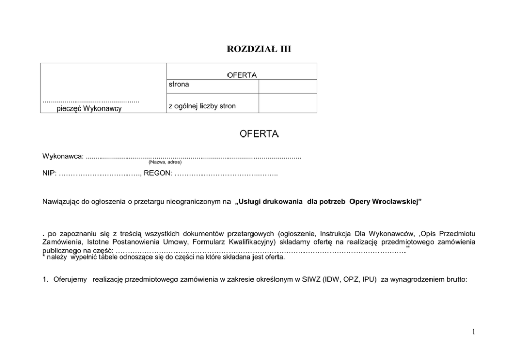 ROZDZIAŁ III OFERTA strona ................................................ pieczęć Wykonawcy z ogólnej liczby stron OFERTA Wykonawca: ........................................................................................................... (Nazwa, adres) NIP: ……………………………., REGON: ……………………………...…….. Nawiązując do ogłoszenia o przetargu nieograniczonym na „Usługi drukowania dla potrzeb Opery Wrocławskiej” . po zapoznaniu się z treścią wszystkich dokumentów przetargowych (ogłoszenie, Instrukcja Dla Wykonawców, ,Opis Przedmiotu Zamówienia, Istotne Postanowienia Umowy, Formularz Kwalifikacyjny) składamy ofertę na realizację przedmiotowego zamówienia publicznego na część: ………………………………………………………………………………………………………….** * naleŜy wypełnić tabele odnoszące się do części na które składana jest oferta. 1. Oferujemy realizację przedmiotowego zamówienia w zakresie określonym w SIWZ (IDW, OPZ, IPU) za wynagrodzeniem brutto: 1 Część I – Druki małe Wymagania szczególne dotyczące pozycji asortymentu od 1 do 21: 1. Świecenie – system CTP 2. Druk: cyfrowa forma offsetowa 3. Maszyna czterokolorowa 4. Dostarczanie proofów, w tym digitalnych do poszczególnych wydawnictw (zaznaczenie odpowiedniego druku w specyfikacji) 5. Kontrola przesyłanych plików pod względem technicznym 1. Ulotka wersja 1 Rodzaj druku a) Format A5 148 x 210 mm, Druk 4 + 0 Papier 135 g b)Format A5 148 x 210 mm, Druk 4 + 4 Papier 135 g 500 2 000 5 000 Cena za nakład 10 000 20 000 50.000 100.000 2. Ulotka wersja 2 Rodzaj druku a) Format A4 210 x 297 mm Druk 4 + 0 Papier 135 g 1 000 1 500 5 000 Cena za nakład 10.000 50 000 100 000 300 000 2 b) Format A4 210 x 297 mm Druk 4 + 4 Papier 135 g 3. Ulotka wersja 3 Rodzaj druku Format A4 210 x 297 mm Druk 4 + 4 Papier 175 g kreda matt Uwagi: bigowanie do A5, lakier offsetowy zewnętrznie 300 500 1 000 Cena za nakład 2 000 3 000 5 000 10 000 4. Ulotka wersja 4 Rodzaj druku a) Format 2/3 A4 200 x 210 mm Druk 4 + 4 Papier kreda matt 175g Uwagi: bigowanie do 100 x 210 mm, Zabezpieczenie: lakier offsetowy b) Format 2/3 A4 200 x 210 mm Druk 4 + 4 Papier kreda matt 250g Uwagi: bigowanie do 100 x 210 mm, Zabezpieczenie: lakier offsetowy c) Format 2/3 A4 200 x 210 mm Druk 5 + 5 Papier kreda matt 250g Uwagi: bigowanie do 100 x 210 mm, Zabezpieczenie: lakier offsetowy 300 500 700 Cena za nakład 1 000 1 500 2 000 3 000 3 5. Ulotka wersja 5 Rodzaj druku a) Format A4 210 x 297 mm (bigowanie do formatu A5 - 148 x 210 mm) Druk 4 + 4 Papier: okładka – 250 g; środek – 170g Zabezpieczenie okładki lakier offsetowy zewnętrznie oprawa zeszytowa zszywana ilość stron – 8 w tym okładka b) … kaŜde kolejne 4 strony w środku do wersji a) c) … kaŜde kolejne 8 stron w środku do wersji a) d) … kaŜde kolejne 16 stron w środku do wersji a) e) Format A4 210 x 297 mm (bigowanie do formatu A5 - 148 x 210 mm) Druk 5 + 5 Papier: okładka – 250 g; środek - 170g Zabezpieczenie okładki lakierem offsetowym Zabezpieczenie wszystkich stron – lakier offsetowy oprawa zeszytowa zszywana ilość stron – 8 w tym okładka f) … kaŜde kolejne 4 strony w środku do wersji e) g) … kaŜde kolejne 8 strony w środku do wersji e) h) … kaŜde kolejne 16 strony w środku do wersji e) 500 700 1000 Cena za nakład 1 500 2 000 3 000 4 000 5 000 10 000 6. Ulotka wersja 6 Rodzaj druku Format 75 x 165 mm Druk 4 + 4 Papier kreda matt 250 g 500 1 000 Cena za nakład 2 000 3 000 4 7. Ulotka wersja 7 Rodzaj druku a)...Format 100 x 210 mm Druk 4 + 2 Papier kreda matt 170 g b)...Format 100 x 210 mm Druk 4 + 4 Papier kreda matt 170 g c)...Format 100 x 210 mm Druk 5 + 5 Papier kreda matt 170 g Zabezpieczenie stron – lakier offsetowy 500 1 000 Cena za nakład 2 000 3 000 250 500 700 5 000 10 000 8. Zaproszenie Rodzaj druku a)...Format 1/3 A4 (100 x 210 mm) Druk 4 + 4 Papier: kreda matt 250 g Uwagi: lakier offsetowy zewnętrznie b)...Format 1/3 A4 (100 x 210 mm) Druk 5 + 4 Papier: kreda matt 250 g Uwagi: lakier offsetowy zewnętrznie c)...Format 1/3 A4 (100 x 210 mm) Druk 5 + 5 Papier: kreda matt 250 g Uwagi: lakier offsetowy zewnętrznie d)...Format 1/3 A4 (100 x 210 mm) Druk 5 + 4 Papier: kreda matt 350 g Uwagi: lakier offsetowy zewnętrznie e)...Format 1/3 A4 (100 x 210 mm) Druk 5 + 5 Papier: kreda matt 350 g Uwagi: lakier offsetowy zewnętrznie Cena za nakład 1 000 1 500 2 000 3 000 5 9. Repertuar wersja 1 Cena za nakład Rodzaj druku a) Format 105 x 160 mm Druk 4 + 4, digital proof: 1 strona okładki, 2 Okładka i strony wybrane ze środka –digital proof (na Ŝyczenie) Papier: środek 135 g kreda matt, okładka 200g lakierowana offsetowo zewnętrznie oprawa szyta okładka 4 strony 32 strony b) kaŜde kolejne 4 strony c) kaŜde kolejne 8 stron d) kaŜde kolejne 16 stron 500 1 000 2 000 3 000 5 000 7 000 10 000 10. Repertuar wersja 2 Rodzaj druku 1 000 2 000 3 000 Cena za nakład 5 000 10 000 15 000 50.000 Format 300 x 630 mm Druk 4 + 4 Papier kreda 170 g Zabezpieczenie lakier offsetowy Bigowanie podwójne do formatu 100 x 210 mm 6 11. Repertuar – wersja 3 Rodzaj druku Składanka o formacie 425x340 mm, falcowana do formatu 85x85 mm papier 130g kreda mat druk 1+1 doklejana okładka o formacie 90x90 mm karton jednostronnie kredowany 250g druk 4+0 + folia błysk zewnętrznie 500 1 000 Cena za nakład 2 000 3 000 5 000 10 000 1 000 Cena za nakład 2 000 3 000 5 000 10 000 12. Repertuar – wersja 4 Rodzaj druku a) Format 148 x 297 mm Druk 4 + 4 Okładka i strony wybrane ze środka –digital proof (na Ŝyczenie) Papier środek: 135 g kreda matt okładka 250 g kreda matt lakierowana offsetowo zewnętrznie Uwagi: oprawa klejona 24 strony b) kaŜde kolejne 2 strony do wersji a c) kaŜde kolejne 8 strony do wersji a d) kaŜde kolejne 16 strony do wersji a e) Format 148 x 297 mm Druk 4 + 4 Okładka i strony wybrane ze środka –digital proof (na Ŝy
