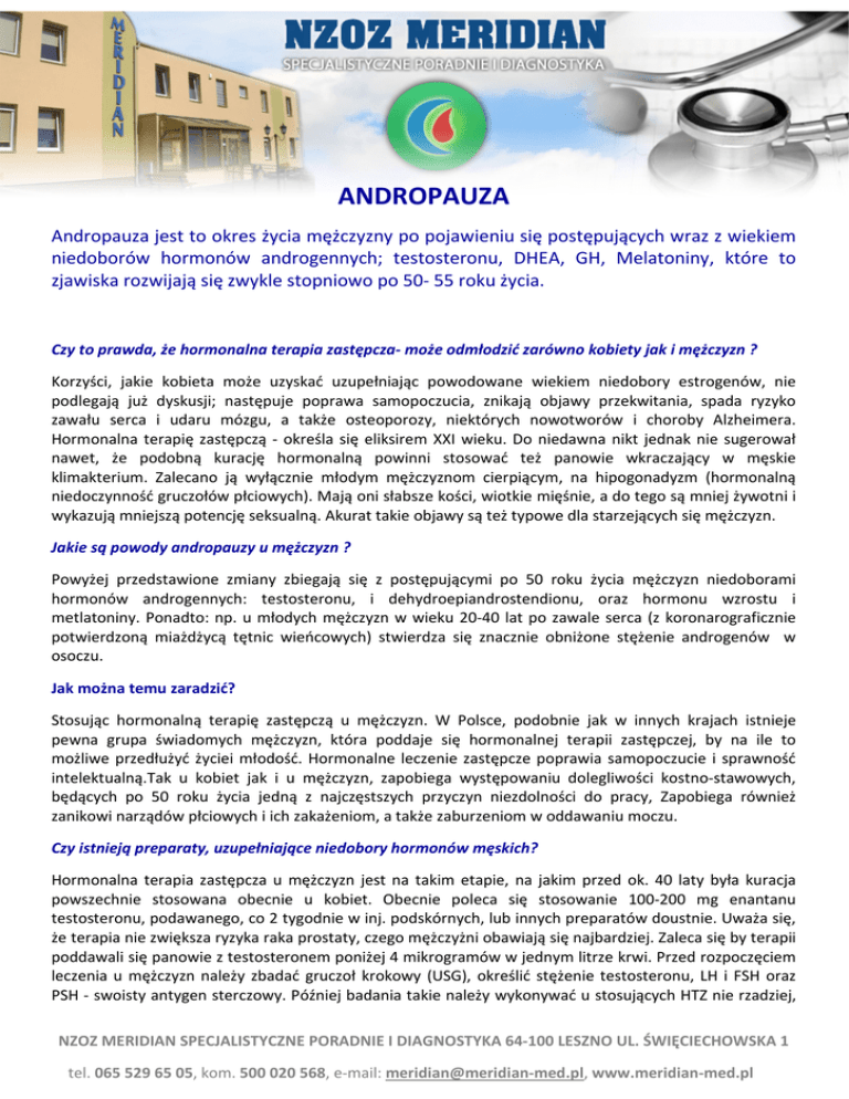 ANDROPAUZA Andropauza jest to okres życia mężczyzny po pojawieniu się postępujących wraz z wiekiem niedoborów hormonów androgennych; testosteronu, DHEA, GH, Melatoniny, które to zjawiska rozwijają się zwykle stopniowo po 50- 55 roku życia. Czy to prawda, że hormonalna terapia zastępcza- może odmłodzić zarówno kobiety jak i mężczyzn ? Korzyści, jakie kobieta może uzyskać uzupełniając powodowane wiekiem niedobory estrogenów, nie podlegają już dyskusji; następuje poprawa samopoczucia, znikają objawy przekwitania, spada ryzyko zawału serca i udaru mózgu, a także osteoporozy, niektórych nowotworów i choroby Alzheimera. Hormonalna terapię zastępczą - określa się eliksirem XXI wieku. Do niedawna nikt jednak nie sugerował nawet, że podobną kurację hormonalną powinni stosować też panowie wkraczający w męskie klimakterium. Zalecano ją wyłącznie młodym mężczyznom cierpiącym, na hipogonadyzm (hormonalną niedoczynność gruczołów płciowych). Mają oni słabsze kości, wiotkie mięśnie, a do tego są mniej żywotni i wykazują mniejszą potencję seksualną. Akurat takie objawy są też typowe dla starzejących się mężczyzn. Jakie są powody andropauzy u mężczyzn ? Powyżej przedstawione zmiany zbiegają się z postępującymi po 50 roku życia mężczyzn niedoborami hormonów androgennych: testosteronu, i dehydroepiandrostendionu, oraz hormonu wzrostu i metlatoniny. Ponadto: np. u młodych mężczyzn w wieku 20-40 lat po zawale serca (z koronarograficznie potwierdzoną miażdżycą tętnic wieńcowych) stwierdza się znacznie obniżone stężenie androgenów w osoczu. Jak można temu zaradzić? Stosując hormonalną terapię zastępczą u mężczyzn. W Polsce, podobnie jak w innych krajach istnieje pewna grupa świadomych mężczyzn, która poddaje się hormonalnej terapii zastępczej, by na ile to możliwe przedłużyć życiei młodość. Hormonalne leczenie zastępcze poprawia samopoczucie i sprawność intelektualną.Tak u kobiet jak i u mężczyzn, zapobiega występowaniu dolegliwości kostno-stawowych, będących po 50 roku życia jedną z najczęstszych przyczyn niezdolności do pracy, Zapobiega również zanikowi narządów płciowych i ich zakażeniom, a także zaburzeniom w oddawaniu moczu. Czy istnieją preparaty, uzupełniające niedobory hormonów męskich? Hormonalna terapia zastępcza u mężczyzn jest na takim etapie, na jakim przed ok. 40 laty była kuracja powszechnie stosowana obecnie u kobiet. Obecnie poleca się stosowanie 100-200 mg enantanu testosteronu, podawanego, co 2 tygodnie w inj. podskórnych, lub innych preparatów doustnie. Uważa się, że terapia nie zwiększa ryzyka raka prostaty, czego mężczyżni obawiają się najbardziej. Zaleca się by terapii poddawali się panowie z testosteronem poniżej 4 mikrogramów w jednym litrze krwi. Przed rozpoczęciem leczenia u mężczyzn należy zbadać gruczoł krokowy (USG), określić stężenie testosteronu, LH i FSH oraz PSH - swoisty antygen sterczowy. Później badania takie należy wykonywać u stosujących HTZ nie rzadziej, NZOZ MERIDIAN SPECJALISTYCZNE PORADNIE I DIAGNOSTYKA 64-100 LESZNO UL. ŚWIĘCIECHOWSKA 1 tel. 065 529 65 05, kom. 500 020 568, e-mail: [email protected], www.meridian-med.pl niż co 12 miesięcy. Z innych preparatów można wymienić melatoninę i dostępny już ok. ponad 1 roku w Polsce Dehydroepiandrostendionu tabletkach. Wnioski Menopauza i andropauza należą do głównych problemów zdrowia publicznego i wywierają wpływ na jakość życia prawie 10-cio milionowej populacji kobiet i mężczyzn po 50 roku życia w naszym kraju. Wyrównanie niedoborów hormonalnych przeciwdziała procesom starzenia się i zaniku ważnych dla życia tkanek i narządów. Autor: Lekarz medycyny Marian Zieliński - Specjalista Endokrynolog i w Chorobach wewnętrznych NZOZ MERIDIAN SPECJALISTYCZNE PORADNIE I DIAGNOSTYKA 64-100 LESZNO UL. ŚWIĘCIECHOWSKA 1 tel. 065 529 65 05, kom. 500 020 568, e-mail: [email protected], www.meridian-med.pl