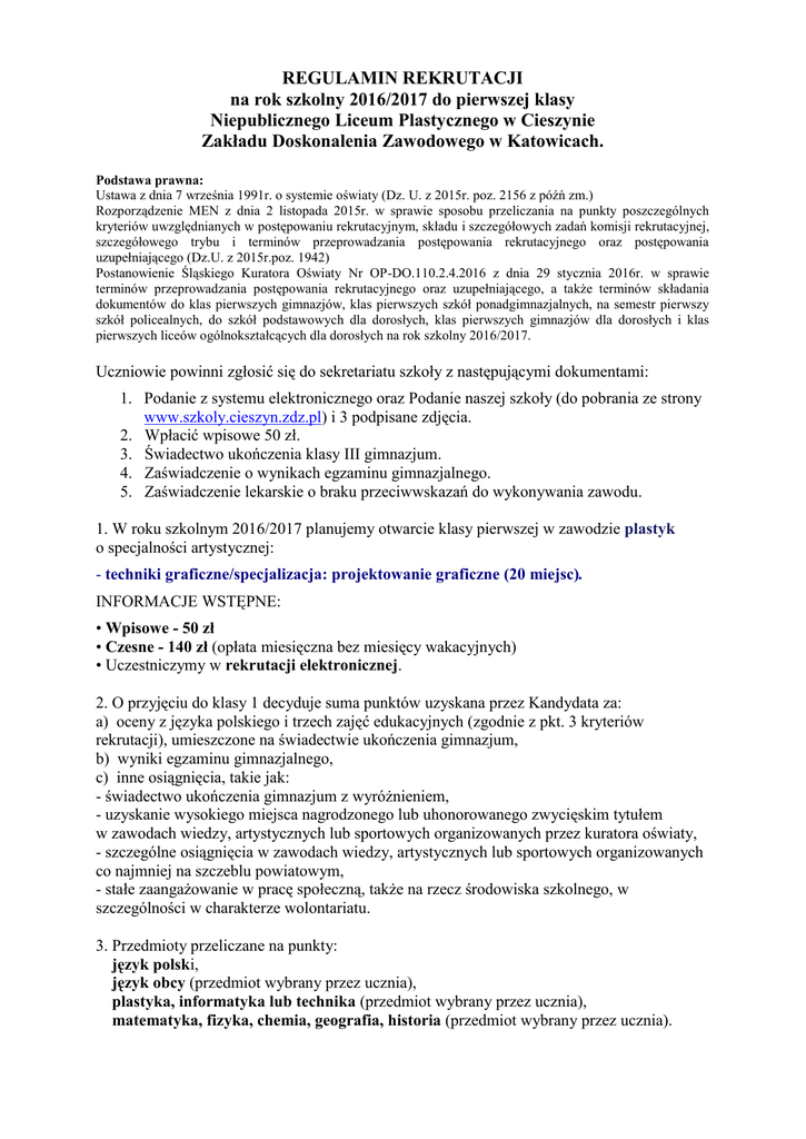 REGULAMIN REKRUTACJI na rok szkolny 2016/2017 do pierwszej klasy Niepublicznego Liceum Plastycznego w Cieszynie Zakładu Doskonalenia Zawodowego w Katowicach. Podstawa prawna: Ustawa z dnia 7 września 1991r. o systemie oświaty (Dz. U. z 2015r. poz. 2156 z późń zm.) Rozporządzenie MEN z dnia 2 listopada 2015r. w sprawie sposobu przeliczania na punkty poszczególnych kryteriów uwzględnianych w postępowaniu rekrutacyjnym, składu i szczegółowych zadań komisji rekrutacyjnej, szczegółowego trybu i terminów przeprowadzania postępowania rekrutacyjnego oraz postępowania uzupełniającego (Dz.U. z 2015r.poz. 1942) Postanowienie Śląskiego Kuratora Oświaty Nr OP-DO.110.2.4.2016 z dnia 29 stycznia 2016r. w sprawie terminów przeprowadzania postępowania rekrutacyjnego oraz uzupełniającego, a także terminów składania dokumentów do klas pierwszych gimnazjów, klas pierwszych szkół ponadgimnazjalnych, na semestr pierwszy szkół policealnych, do szkół podstawowych dla dorosłych, klas pierwszych gimnazjów dla dorosłych i klas pierwszych liceów ogólnokształcących dla dorosłych na rok szkolny 2016/2017. Uczniowie powinni zgłosić się do sekretariatu szkoły z następującymi dokumentami: 1. Podanie z systemu elektronicznego oraz Podanie naszej szkoły (do pobrania ze strony www.szkoly.cieszyn.zdz.pl) i 3 podpisane zdjęcia. 2. Wpłacić wpisowe 50 zł. 3. Świadectwo ukończenia klasy III gimnazjum. 4. Zaświadczenie o wynikach egzaminu gimnazjalnego. 5. Zaświadczenie lekarskie o braku przeciwwskazań do wykonywania zawodu. 1. W roku szkolnym 2016/2017 planujemy otwarcie klasy pierwszej w zawodzie plastyk o specjalności artystycznej: - techniki graficzne/specjalizacja: projektowanie graficzne (20 miejsc). INFORMACJE WSTĘPNE: • Wpisowe - 50 zł • Czesne - 140 zł (opłata miesięczna bez miesięcy wakacyjnych) • Uczestniczymy w rekrutacji elektronicznej. 2. O przyjęciu do klasy 1 decyduje suma punktów uzyskana przez Kandydata za: a) oceny z języka polskiego i trzech zajęć edukacyjnych (zgodnie z pkt. 3 kryteriów rekrutacji), umieszczone na świadectwie ukończenia gimnazjum, b) wyniki egzaminu gimnazjalnego, c) inne osiągnięcia, takie jak: - świadectwo ukończenia gimnazjum z wyróżnieniem, - uzyskanie wysokiego miejsca nagrodzonego lub uhonorowanego zwycięskim tytułem w zawodach wiedzy, artystycznych lub sportowych organizowanych przez kuratora oświaty, - szczególne osiągnięcia w zawodach wiedzy, artystycznych lub sportowych organizowanych co najmniej na szczeblu powiatowym, - stałe zaangażowanie w pracę społeczną, także na rzecz środowiska szkolnego, w szczególności w charakterze wolontariatu. 3. Przedmioty przeliczane na punkty: język polski, język obcy (przedmiot wybrany przez ucznia), plastyka, informatyka lub technika (przedmiot wybrany przez ucznia), matematyka, fizyka, chemia, geografia, historia (przedmiot wybrany przez ucznia). 4. Zasady przeliczania ocen uzyskanych w gimnazjum na punkty: celujący – 20 punktów bardzo dobry –16 punktów dobry – 12 punktów dostateczny – 8 punktów dopuszczający – 2 punkty 5. Absolwenci gimnazjów zwolnieni przez dyrektora Okręgowej Komisji Egzaminacyjnej z egzaminu gimnazjalnego otrzymują dodatkową liczbę punktów za oceny z języka polskiego i 3 wybranych zajęć edukacyjnych otrzymanych na świadectwie ukończenia gimnazjum. 6.Maksymalna liczba punktów do uzyskania w wyniku rekrutacji wynosi – 260 punktów: 100 punktów – to maksymalny wynik za egzamin gimnazjalny, 100 punktów – kandydat może uzyskać łącznie za oceny z wybranych przedmiotów, świadectwo z wyróżnieniem oraz za inne osiągnięcia odnotowane na świadectwie ukończenia gimnazjum. 60 punktów – kandydat może uzyskać za egzamin praktyczny. 7. Egzamin praktyczny składa się z trzech części: rysunku, malarstwa, kompozycji przestrzennej oraz rozmowy na temat zainteresowań wybraną dziedziną sztuki i zjawiskami kulturalnymi. Egzamin zostanie przeprowadzony 7 czerwca 2016 r.(wtorek) o godz. 15:00. 10. Kandydaci, którzy ukończyli gimnazjum w latach wcześniejszych i podlegają obowiązkowi nauki mogą uczestniczyć w rekrutacji. 11. O przyjęciu do szkoły decyduje zaliczony egzamin praktyczny, uzyskana liczba punktów oraz kolejność zgłoszeń. 12. Wszelkie sprawy dotyczące warunków lub kryteriów branych pod uwagę w postępowaniu rekrutacyjnym, a nie ujęte w niniejszym dokumencie, regulują zapisy rozdziału 2a ustawy z dnia 7 września 1991r. o systemie oświaty (Dz. U. z 2015r. poz. 2156 z późń zm.) oraz rozporządzenie MEN z dnia 2 listopada 2015r. w sprawie sposobu przeliczania na punkty poszczególnych kryteriów uwzględnianych w postępowaniu rekrutacyjnym, składu i szczegółowych zadań komisji rekrutacyjnej, szczegółowego trybu i terminów przeprowadzania postępowania rekrutacyjnego oraz postępowania uzupełniającego (Dz.U. z 2015r.poz. 1942) 12. Szczegółowe terminy rekrutacji: od 6 maja do 21 czerwca 2016r. termin składania wniosków o przyjęcie do szkoły ponadgimnazjalnej. Kandydatów obowiązuje egzamin praktyczny, który odbędzie się w dniu 7 czerwca 2016r. Kandydaci składają podanie jedynie w szkole pierwszego wyboru, Egzamin praktyczny do Liceum Plastycznego odbędzie się w dniu 7.06.2016r. i będzie składał się z III etapów (Każdy z etapów będzie punktowany w zakresie od 0 do 20 punktów): Etap I: 7.06.2016 r godz. 15:.00 - rysunek z natury (czas trwania 60 minut), Etap II: 7.06.2016r. godz. 16:05 - malarstwo (czas trwania 60 minut), Etap III: 7.06.2016r. godz. 17:10 - kompozycja i rozmowa kwalifikacyjna dotycząca ogólnych wiadomości z zakresu plastyki. Ogłoszenie wyników egzaminu wstępnego 8.06.2016r. o godzinie 9.00. Na egzamin praktyczny należy przynieść : legitymację szkolną, blok rysunkowy A3, przybory do rysunku (ołówki, gumka, temperówka), przybory do malarstwa (pędzle, naczynie na wodę, farby plakatowe). od 24 czerw