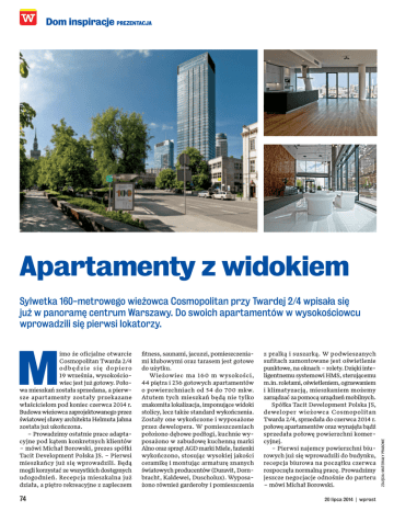 Dom inspiracje prezentacja Apartamenty z widokiem M imo że oficjalne otwarcie Cosmopolitan Twarda 2/4 o d b ę d z i e s i ę d o p i e ro 19 września, wysokościo wiec jest już gotowy. Poło wa mieszkań została sprzedana, a pierw sze apartamenty zostały przekazane właścicielom pod koniec czerwca 2014 r. Budowa wieżowca zaprojektowanego przez światowej sławy architekta Helmuta Jahna została już ukończona. – Prowadzimy ostatnie prace adapta cyjne pod kątem konkretnych klientów – mówi Michał Borowski, prezes spółki Tacit Development Polska JS. – Pierwsi mieszkańcy już się wprowadzili. Będą mogli korzystać ze wszystkich dostępnych udogodnień. Recepcja mieszkalna już działa, a piętro rekreacyjne z zapleczem 74 fitness, saunami, jacuzzi, pomieszczenia mi klubowymi oraz tarasem jest gotowe do użytku. Wieżowiec ma 160 m wysokości, 44 piętra i 236 gotowych apartamentów o powierzchniach od 54 do 700 mkw. Atutem tych mieszkań będą nie tylko znakomita lokalizacja, imponujące widoki stolicy, lecz także standard wykończenia. Zostały one wykończone i wyposażone przez dewelopera. W pomieszczeniach położono dębowe podłogi, kuchnie wy posażono w zabudowę kuchenną marki Alno oraz sprzęt AGD marki Miele, łazienki wykończono, stosując wysokiej jakości ceramikę i montując armaturę znanych światowych producentów (Duravit, Dorn bracht, Kaldewei, Duscholux). Wyposa żono również garderoby i pomieszczenia z pralką i suszarką. W podwieszanych sufitach zamontowane jest oświetlenie punktowe, na oknach – rolety. Dzięki inte ligentnemu systemowi HMS, sterującemu m.in. roletami, oświetleniem, ogrzewaniem i klimatyzacją, mieszkaniem możemy zarządzać za pomocą urządzeń mobilnych. Spółka Tacit Development Polska JS, deweloper wieżowca Cosmopolitan Twarda 2/4, sprzedała do czerwca 2014 r. połowę apartamentów oraz wynajęła bądź sprzedała połowę powierzchni komer cyjnej. – Pierwsi najemcy powierzchni biu rowych już się wprowadzili do budynku, recepcja biurowa na początku czerwca rozpoczęła normalną pracę. Prowadzimy jeszcze negocjacje odnośnie do parteru – mówi Michał Borowski. 20 lipca 2014 | wprost Zdjęcia: materiały prasowe Sylwetka 160-metrowego wieżowca Cosmopolitan przy Twardej 2/4 wpisała się już w panoramę centrum Warszawy. Do swoich apartamentów w wysokościowcu wprowadzili się pierwsi lokatorzy.