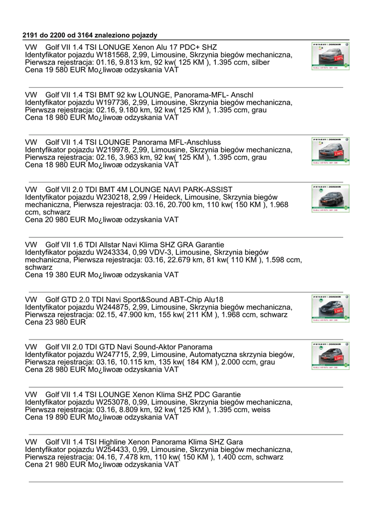 2191 do 2200 od 3164 znaleziono pojazdy VW Golf VII 1.4 TSI LONUGE Xenon Alu 17 PDC+ SHZ Identyfikator pojazdu W181568, 2,99, Limousine, Skrzynia biegów mechaniczna, Pierwsza rejestracja: 01.16, 9.813 km, 92 kw( 125 KM ), 1.395 ccm, silber Cena 19 580 EUR Mo¿liwoæ odzyskania VAT VW Golf VII 1.4 TSI BMT 92 kw LOUNGE, Panorama-MFL- Anschl Identyfikator pojazdu W197736, 2,99, Limousine, Skrzynia biegów mechaniczna, Pierwsza rejestracja: 02.16, 9.180 km, 92 kw( 125 KM ), 1.395 ccm, grau Cena 18 980 EUR Mo¿liwoæ odzyskania VAT VW Golf VII 1.4 TSI LOUNGE Panorama MFL-Anschluss Identyfikator pojazdu W219978, 2,99, Limousine, Skrzynia biegów mechaniczna, Pierwsza rejestracja: 02.16, 3.963 km, 92 kw( 125 KM ), 1.395 ccm, grau Cena 18 980 EUR Mo¿liwoæ odzyskania VAT VW Golf VII 2.0 TDI BMT 4M LOUNGE NAVI PARK-ASSIST Identyfikator pojazdu W230218, 2,99 / Heideck, Limousine, Skrzynia biegów mechaniczna, Pierwsza rejestracja: 03.16, 20.700 km, 110 kw( 150 KM ), 1.968 ccm, schwarz Cena 20 980 EUR Mo¿liwoæ odzyskania VAT VW Golf VII 1.6 TDI Allstar Navi Klima SHZ GRA Garantie Identyfikator pojazdu W243334, 0,99 VDV-3, Limousine, Skrzynia biegów mechaniczna, Pierwsza rejestracja: 03.16, 22.679 km, 81 kw( 110 KM ), 1.598 ccm, schwarz Cena 19 380 EUR Mo¿liwoæ odzyskania VAT VW Golf GTD 2.0 TDI Navi Sport&Sound ABT-Chip Alu18 Identyfikator pojazdu W244875, 2,99, Limousine, Skrzynia biegów mechaniczna, Pierwsza rejestracja: 02.15, 47.900 km, 155 kw( 211 KM ), 1.968 ccm, schwarz Cena 23 980 EUR VW Golf VII 2.0 TDI GTD Navi Sound-Aktor Panorama Identyfikator pojazdu W247715, 2,99, Limousine, Automatyczna skrzynia biegów, Pierwsza rejestracja: 03.16, 10.115 km, 135 kw( 184 KM ), 2.000 ccm, grau Cena 28 980 EUR Mo¿liwoæ odzyskania VAT VW Golf VII 1.4 TSI LOUNGE Xenon Klima SHZ PDC Garantie Identyfikator pojazdu W253078, 0,99, Limousine, Skrzynia biegów mechaniczna, Pierwsza rejestracja: 03.16, 8.809 km, 92 kw( 125 KM ), 1.395 ccm, weiss Cena 19 890 EUR Mo¿liwoæ odzyskania VAT VW Golf VII 1.4 TSI Highline Xenon Panorama Klima SHZ Gara Identyfikator pojazdu W254433, 0,99, Limousine, Skrzynia biegów mechaniczna, Pierwsza rejestracja: 04.16, 7.478 km, 110 kw( 150 KM ), 1.400 ccm, schwarz Cena 21 980 EUR Mo¿liwoæ odzyskania VAT VW Golf VII 1.6 TDI Comfortline Tag SHZ Navi Alu Identyfikator pojazdu W263167, 2,99, Limousine, Skrzynia biegów mechaniczna, Pierwsza rejestracja: 03.15, 44.950 km, 81 kw( 110 KM ), 1.598 ccm, weiss Cena 14 980 EUR Mo¿liwoæ odzyskania VAT
