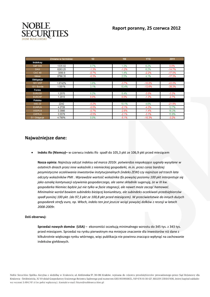 Raport poranny, 25 czerwca 2012 Najważniejsze dane: Indeks Ifo (Niemcy)– w czerwcu indeks Ifo spadł do 105,3 pkt ze 106,9 pkt przed miesiącem Nasza opinia: Najniższy odczyt indeksu od marca 2010r. potwierdza niepokojące sygnały wysyłane w ostatnich dniach przez inne wskaźniki z niemieckiej gospodarki, m.in. przez coraz bardziej pesymistyczne oczekiwania inwestorów instytucjonalnych (indeks ZEW) czy najniższe od trzech lata odczyty wskaźników PMI . Wprawdzie wartość wskaźnika Ifo powyżej poziomu 100 pkt interpretuje się jako oznakę kontynuacji ożywienia gospodarczego, ale same składniki sugerują, że w III kw. gospodarka Niemiec będzie już nie tylko w fazie stagnacji, ale nawet może zacząć hamować. Minimalnie wzrósł bowiem subindeks bieżącej koniunktury, ale subindeks oczekiwań przedsiębiorców spadł poniżej 100 pkt. (do 97,3 pkt ze 100,8 pkt przed miesiącem). W przeciwieństwie do innych dużych gospodarek strefy euro, np. Włoch, indeks ten jest jeszcze wciąż powyżej dołków z recesji w latach 2008-2009r. Dziś obserwuj: Sprzedaż nowych domów (USA) – ekonomiści oczekują minimalnego wzrostu do 345 tys. z 343 tys. przed miesiącem. Sprzedaż na rynku pierwotnym ma mniejsze znaczenie dla inwestorów niż dane z kilkukrotnie większego rynku wtórnego, więc publikacja nie powinna znacząco wpłynąć na zachowanie indeksów giełdowych. Analiza techniczna: GPW WIG20 Na początku drugiej dekady czerwca doszło do wypełnienia formacji dołkowej (bump-and-run reversal bottom) z zasięgiem wybicia ocenianym na 2 350 pkt. Poza linią prowadzącą tej formacji (ok. 2 150 pkt), główne wsparcia lokują się na poziomach 2 200 pkt (podstawa 2-dniowej bocznej korekty) oraz 2 219 pkt (minimum cofnięcia sprzed tygodnia). W trzecim dniu zeszło-tygodniowego cofnięcia pojawiła się biała świeca, która została oparta o najwyższy z wymienionych poziomów. Możliwie więc, iż korekta została już zakończona. Lotos Wiosenna korekta spadkowa została zakończona dynamicznym wybiciem w górę z utworzonej na przełomie maja i czerwca 4-tygodniowej formacji rozszerzającego się dna. W trakcie ostatnich trzech sesji miał miejsce ruch powrotny do górnego ograniczenia tej formacji. Związane z nim wsparcie podkreślone jest przez połowę wysokiej białej świecy z 15 czerwca (26.60). ING BSK Trwająca od połowy marca korekta przybrała formę kanału spadkowego. Przed dwoma tygodniami został on opuszczony góra, co sugeruje, iż korekta została zakończona. W połowie ubiegłego tygodnia miał miejsce ruch powrotny do górnej linii kanału. Ostatnia biała świeca sygnalizuje możliwość powrotu do zwyżki, otwierając przy tym drogę do budowy kilkutygodniowego układu oRGR z linią szyi przebiegającą na wysokości 78.0. Analiza techniczna: Waluty EUR/USD Kurs eurodolara po chwilowym zatrzymaniu się w okolicach podstawy formacji podwójnego szczytu rozpoczyna nowy tydzień od kontynuacji spadków. Tym samym zwiększa się szansa na realizację wspomnianego w poprzedniej analizie scenariusza, którego celem jest poziom 1,2368, wynikający z wysokości formacji. Wcześniej natomiast warto obserwować rynek w okolicach 1,2463, wynikających ze zniesienia 61,8% ostatniej korekty, które potencjalnie mogłyby zareagować jako wsparcie oraz przy których wypadają także dołki z pierwszej połowy czerwca. USD/PLN Kurs po wybiciu linii trendu spadkowego zatrzymał się w piątek przy zniesieniu 38,2%, po czym po chwilowym odreagowaniu złotego, przetestował ponownie linię trendu, która zadziałała jako wsparcie. Wprawdzie podstawa opisywanej wcześniej formacji podwójnego dna została przełamana, jednak obrona linii trendu daje szansę na powrót do wzrostów i w najbliższym czasie kurs może ponownie próbować zaatakować poziom 3,4263, wynikający z 38,2% ostatniego ruchu spadkowego. Jeśli udałoby się przebić ten poziom, mogłoby to otworzyć drogę do dalszych wzrostów, a docelowym poziomem są okolice 3,4899-3,4930, przy których wypada zarówno szczyt z 12 czerwca jak i 61,8% ostatniej korekty. Na drodze do celu warto jednak śledzić zachowanie kursu w okolicach 3,4596 (50% korekty), które potencjalnie mogłyby zadziałać jako opór. Wsparciem natomiast pozostaje linia trendu wzrostowego oraz ostatni dołek z 22 czerwca na poziomie 3,3706. Departament Analiz Rynkowych Noble Securities S.A. Łukasz Wróbel , Główny Analityk [email protected] Tel: +48 600 942 105 Analiza techniczna – GPW: Krzysztof Ojczyk , Starszy Analityk [email protected] Tel: +48 12 422 31 00 w. 113 Analiza techniczna – waluty: Dominik Łebek, Departament Rynków Zagranicznych [email protected] Tel: +48 22 212 54 35 Jeżeli nie życzą sobie Państwo otrzymywać codziennego Przeglądu Rynków Noble Securities S.A., prosimy o odesłanie pustego maila z tematem "Wypisz_mnie". Niniejsze opracowanie jest jedynie materiałem informacyjnym do użytku odbiorcy. Materiał został przygotowany z należytą starannością i rzetelnością, na podstawie ogólnodostępnych informacji, ale ani autor, ani Noble Securities S.A. nie gwarantują jego kompletności i dokładności. Wszystkie opinie i prognozy przedstawione w tym opracowaniu są jedynie wyrazem opinii autora (autorów) w dniu publikacji i i nie są to opinie czy prognozy Noble Securities S.A., a opinie te lub prognozy mogą ulec zmianie bez zapowiedzi. Materiał nie został sporządzony zgodnie z wymogami określonymi w Rozporządzeniu Ministra Finansów z dnia 19 października 2005r. w sprawie informacji stanowiących rekomendacje dotyczące instrumentów finansowych, ich emitentów lub wystawców (Dz.U. Nr 206, poz. 1715). Nie stanowi rekomendacji w rozumieniu tego Rozporządzenia, nie powinien być też rozumiany jako materiał o charakterze doradczym lub jako podstawa do podejmowania działań lub decyzji inwestycyjnych. Osoba korzystająca z opracowania nie może rezygnować z przeprowadzenia nieza