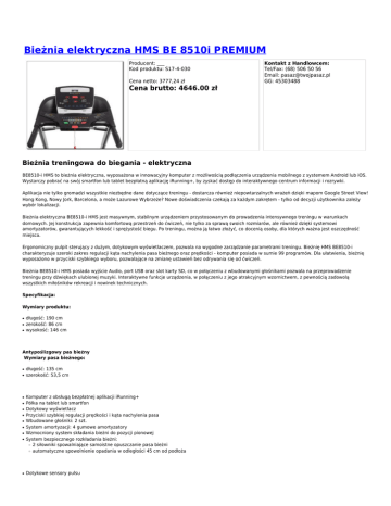 Bieżnia elektryczna HMS BE 8510i PREMIUM Producent: ___ Kod produktu: S17-4-030 Cena netto: 3777,24 zł Kontakt z Handlowcem: Tel/Fax: (68) 506 50 56 Email: [email protected] GG: 45303488 Cena brutto: 4646.00 zł Bieżnia treningowa do biegania - elektryczna BE8510-i HMS to bieżnia elektryczna, wyposażona w innowacyjny komputer z możliwością podłączenia urządzenia mobilnego z systemem Android lub iOS. Wystarczy pobrać na swój smartfon lub tablet bezpłatną aplikację iRunning+, by zyskać dostęp do interaktywnego centrum informacji i rozrywki. Aplikacja nie tylko gromadzi wszystkie niezbędne dane dotyczące treningu - dostarcza również niepowtarzalnych wrażeń dzięki mapom Google Street View! Hong Kong, Nowy Jork, Barcelona, a może Lazurowe Wybrzeże? Nowe doświadczenia czekają za każdym zakrętem - tylko od decyzji użytkownika zależy wybór lokalizacji. Bieżnia elektryczna BE8510-i HMS jest masywnym, stabilnym urządzeniem przystosowanym do prowadzenia intensywnego treningu w warunkach domowych. Jej konstrukcja zapewnia komfortową przestrzeń do ćwiczeń, nie tylko za sprawą swoich rozmiarów, ale również dzięki systemowi amortyzatorów, gwarantujących lekkość i sprężystość biegu. Po treningu, można ją łatwo złożyć, co docenią osoby, dla których ważna jest oszczędność miejsca. Ergonomiczny pulpit sterujący z dużym, dotykowym wyświetlaczem, pozwala na wygodne zarządzanie parametrami treningu. Bieżnię HMS BE8510-i charakteryzuje szeroki zakres regulacji kąta nachylenia pasa bieżnego oraz prędkości - komputer posiada w sumie 99 programów. Dla ułatwienia, bieżnię wyposażono w przyciski szybkiego wyboru, pozwalające na zmianę ustawień bez odrywania się od ćwiczeń. Bieżnia BE8510-i HMS posiada wyjście Audio, port USB oraz slot karty SD, co w połączeniu z wbudowanymi głośnikami pozwala na przeprowadzenie treningu przy dźwiękach ulubionej muzyki. Interaktywne funkcje urządzenia, w połączeniu z jego atrakcyjnym wzornictwem, z pewnością zadowolą wszystkich miłośników rekreacji i nowinek technicznych. Specyfikacja: Wymiary produktu: ● ● ● długość: 190 cm zerokość: 86 cm wysokość: 146 cm Antypoślizgowy pas bieżny Wymiary pasa bieżnego: ● ● ● ● ● ● ● ● ● ● długość: 135 cm szerokość: 53,5 cm Komputer z obsługą bezpłatnej aplikacji iRunning+ Półka na tablet lub smartfon Dotykowy wyświetlacz Przyciski szybkiej regulacji prędkości i kąta nachylenia pasa Wbudowane głośniki: 2 szt. System amortyzacji: 4 gumowe amortyzatory Wzmocniony system składania bieżni do pozycji pionowej System bezpiecznego rozkładania bieżni: 2 siłowniki spowalniające samoistne opuszczanie pasa bieżni automatyczne spowolnienie opadania w odległości 45 cm od podłoża ❍ ❍ ● Dotykowe sensory pulsu ● ● ● ● ● ● ● ● ● ● Klucz bezpieczeństwa 4 kółka transportowe Gniazdo Audio 3,5 mm - dołączony kabel Wyjście słuchawkowe Gniazdo USB - możliwość podłączenia telefonu lub pamięci flash Czytnik kart SD Silnik: 3,5 HP Zasilanie sieciowe: 230 V Waga produktu: 97 kg Maksymalne obciążenie produktu: 180 kg Funkcje komputera: ● ● ● ● ● ● ● ● ● ● ● ● obsługa bezpłatnej aplikacji iRunning+ czas prędkość kąta nachylenia pasa odległość scan spalane kalorie puls 2 moduły pomiaru spalania tłuszczu kontrola tempa bicia serca ustawienia użytkownika 99 programów Uwagi: Przeznaczona do użytku domowego. Gwarancja 24 miesiące Kod produktu:S17-4-030 ID produktu:151341 Granos Group sp. z o.o. ul. Sulechowska 4a budynek 45 65-001 Zielona Góra