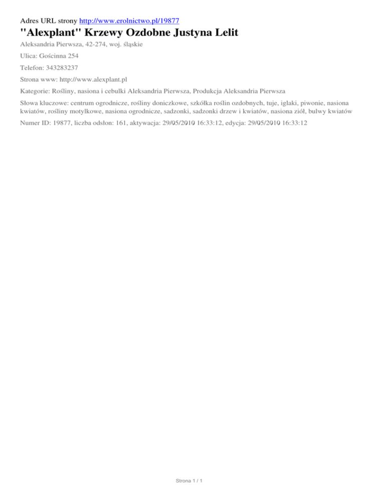 Adres URL strony http://www.erolnictwo.pl/19877 "Alexplant" Krzewy Ozdobne Justyna Lelit Aleksandria Pierwsza, 42-274, woj. śląskie Ulica: Gościnna 254 Telefon: 343283237 Strona www: http://www.alexplant.pl Kategorie: Rośliny, nasiona i cebulki Aleksandria Pierwsza, Produkcja Aleksandria Pierwsza Słowa kluczowe: centrum ogrodnicze, rośliny doniczkowe, szkółka roślin ozdobnych, tuje, iglaki, piwonie, nasiona kwiatów, rośliny motylkowe, nasiona ogrodnicze, sadzonki, sadzonki drzew i kwiatów, nasiona ziół, bulwy kwiatów Numer ID: 19877, liczba odsłon: 161, aktywacja: 29/05/2010 16:33:12, edycja: 29/05/2010 16:33:12 Strona 1 / 1