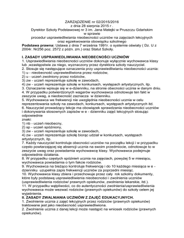 ZARZĄDZENIE nr 02/2015/2016 z dnia 28 sierpnia 2015 r . Dyrektor Szkoły Podstawowej nr 3 im. Jana Matejki w Pruszczu Gdańskim w sprawie procedur usprawiedliwiania nieobecności uczniów na zajęciach lekcyjnych oraz egzekwowania obowiązku szkolnego Podstawa prawna: Ustawa z dnia 7 września 1991r. o systemie oświaty ( Dz. U z 2004r. Nr256 poz. 2572 z późn. zm.) oraz Statut Szkoły. I. ZASADY USPRAWIEDLIWIANIA NIEOBECNOŚCI UCZNIÓW 1. Usprawiedliwiania nieobecności uczniów dokonuje wyłącznie wychowawca klasy lub ,wzastępstwie za niego, wyznaczony przez dyrektora szkoły nauczyciel. 2. Stosuje się następujące oznaczenia przy usprawiedliwianiu nieobecności ucznia: 1) u - nieobecność usprawiedliwiona przez rodziców, 2) u - uczeń zwolniony przez rodziców, 3) zw - uczeń reprezentuje szkołę w zawodach, 4) zw - uczeń reprezentuje szkołę w konkursach, występach artystycznych, itp. 3. Oznaczenie wpisuje się w e-dzienniku, na stronie obecności ucznia w danym dniu. 4. W przypadku potwierdzonych wagarów wychowawca odnotowuje ten fakt w zeszycie uwag, a nieobecność zaznacza w dzienniku. 5. Wychowawca we frekwencji nie uwzględnia nieobecności ucznia w celu reprezentowania szkoły na zawodach, konkursach, występach artystycznych itd. 6. Nauczyciel prowadzący lekcje ma obowiązek sprawdzania nieobecności uczniów i dokonywania stosownych zapisów w e - dzienniku zajęć lekcyjnych stosując odpowiednie znaki: 1) nb - uczeń nieobecny, 2) sp - uczeń spóźniony, 3) zw - uczeń reprezentuje szkołę w zawodach, 4) zw - uczeń reprezentuje szkołę biorąc udział w konkursach, występach artystycznych, itp. 7. Każdy nauczyciel kontroluje obecności uczniów na początku lekcji i w przypadku często powtarzającej się absencji ucznia na swoim przedmiocie, odnotowuje to w zeszycie uwag oraz powiadamia wychowawcę klasy. Wychowawca podejmuje odpowiednie działania. 8. W przypadku częstych spóźnień ucznia na zajęciach, powyżej 5 w miesiącu, wychowawca powiadamia o tym fakcie rodziców. 9. Wychowawca na bieżąco kontroluje frekwencję i do 10 każdego miesiąca w e dzienniku uzupełnia zapis frekwencji uczniów za poprzedni miesiąc. 10. Wychowawca klasy zbiera i przechowuje przez cały rok szkolny dokumenty, które były podstawą usprawiedliwienia nieobecności i zwolnienia uczniów (usprawiedliwienia rodziców/ prawnych opiekunów, zwolnienia lekarskie, itd.). 11. W przypadku wątpliwości, co do autentyczności zwolnienia/usprawiedliwienia wychowawca może wezwać rodziców (prawnych opiekunów) do szkoły celem jej wyjaśnienia. II. ZASADY ZWALNIANIA UCZNIÓW Z ZAJĘĆ EDUKACYJNYCH. 1. Zwolnienie ucznia z zajęć lekcyjnych przez rodziców (prawnych opiekunów) traktowane jest jako nieobecność usprawiedliwiona. 2. Zwolnienie ucznia z danej lekcji może nastąpić na wniosek rodziców (prawnych opiekunów). 3. Zwolnienie dokonywane przez rodziców winno mieć formę pisemną (wzór zwolnienia zał. II). 4. W przypadku kontaktu telefonicznego lub osobistego należy żądać pisemnego potwierdzenia decyzji rodziców, najpóźniej do następnego dnia zajęć lekcyjnych. Zwolnienie uczeń przekazuje wychowawcy. 5. W przypadku nieobecności wychowawcy uczeń zwalnia się u nauczyciela danego przedmiotu/ pedagoga lub wicedyrektora szkoły. 6. Nauczyciel zwalniający ucznia na zawody sportowe jest zobowiązany do pozostawienia w pokoju nauczycielskim pisemnego wykazu uczniów zwalnianych z określonej ilości godzin. W przypadku zwalniania ucznia przez nauczyciela z określonych zajęć lekcyjnych i pozalekcyjnych nauczyciel pisemnie w e - dzienniku. 7. Zwolnienie ucznia w przypadku określonym w punkcie 6 wymaga akceptacji dyrektora. 8. Uczniowie zwolnieni z zajęć wychowania fizycznego mają obowiązek przebywać w miejscu, w którym pozostała część klasy odbywa zajęcia. Jeżeli wychowanie fizyczne jest pierwszą lub ostatnią lekcją rodzice (prawni opiekunowie) mogą złożyć pisemne oświadczenie, że wyrażają zgodę na pobyt dziecka w tym czasie w domu. III. ZASADY EGZEKWOWANIA OBOWIĄZKU SZKOLNEGO 1. Rodzice (prawni opiekunowie) mają obowiązek pisemnego usprawiedliwiania nieobecności dziecka w szkole w terminie 7 dni od zakończenia nieobecności. 2. O przewidywanej dłuższej niż 1 tydzień nieobecności dziecka ( np. pobyt w sanatorium, szpitalu, przewlekła choroba) rodzice (prawni opiekunowie) są zobowiązani powiadomić wychowawcę pisemnie. 3. W przypadku dłuższych nieobecności, zwłaszcza nieusprawiedliwionych, trwających co najmniej 1 tydzień lub 30 godzin w miesiącu, a także w przypadku ewidentnych wagarów wychowawca: 1) przekazuje dyrektorowi szkoły, pedagogowi szkolnemu informację o takich uczniach. 2) powiadamia rodziców (prawnych opiekunów) telefonicznie, a jeśli zajdzie taka potrzeba listownie / za potwierdzeniem odbioru/ o absencji ucznia i wzywa ich do szkoły celem wyjaśnienia danej sytuacji, 3) wspólnie z pedagogiem szkolnym przeprowadza rozmowę z uczniem, 4) w obecności dyrektora, lub pedagoga szkolnego, przeprowadza rozmowę z rodzicami (prawnymi opiekunami) i uczniem, w której informuje ich o ewentualnych konsekwencjach nieobecności dziecka, a także zobowiązuje ich do spowodowania systematycznego uczęszczania dziecka do szkoły. 4. Każde działanie podejmowane przez wychowawcę lub pedagoga szkolnego związane z egzekwowaniem obowiązku szkolnego ucznia wychowawca odnotowuje, wypełniając notatkę służbową. 5. Przez niespełnienie obowiązku szkolnego należy rozumieć nieusprawiedliwioną nieobecność w okresie jednego miesiąca na co najmniej 50% obowiązkowych zajęć edukacyjnych. 5. W przypadku braku współpracy rodziców (prawnych opiekunów) z wychowawcą (rodzice/ prawni opiekunowie nie uczestniczą w zebraniach i konsultacjach, nie wyrażają chęci na spotkania indywidualne itp.) lub kiedy podjęte wspólne działania nie dają oczekiwanych rezultatów, (uczeń w dalszym ciągu nie r
