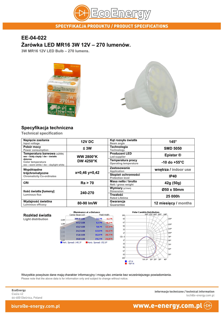 EE-04-022 Żarówka LED MR16 3W 12V – 270 lumenów. 3W MR16 12V LED Bulb – 270 lumens. Specyfikacja techniczna Technical specification Napięcie zasilania Input voltage Pobór mocy Power consumption 12V DC ≤ 3W Temperatura barwowa (±200k) ww – biały ciepły / dw – światło dzienne Color temperature WW 2800°K DW 4250°K Ilość światła [lumeny] Luminous flux Technologia Technology Led supplier Temperatura pracy Operating temperature Zastosowanie x=0,46 y=0,42 Chromaticity Co-ordinates CRI Beam angle Producent LED ww – warm white / dw – daylight white Współrzędne trójchromatyczne Kąt rozsyłu światła Application Stopień ochronności Protection level Ra > 70 Masa netto / brutto Nett / gross weight Wymiary (±1mm) 240-270 Dimension Trwałość Rated Lifetime Wydajność świetlna Luminous efficacy 80-90 lm/W Gwarancja Guarantee 145° SMD 5050 Epistar ® -10 do +55°C wnętrza / indoor use IP40 42g (50g) Ø50 x 50mm 25 000h 12 miesięcy / months Rozkład światła Light distribution Wszystkie powyższe dane mają charakter informacyjny i mogą ulec zmianie bez wcześniejszego powiadomienia. Please note that the above data is for information only and subject to change without notice. INSTRUKCJA OBSŁUGI / USER MANUAL Zewnętrzna obudowa modułu nagrzewa się do temperatury nawet + 65°C podczas normalnej pracy na otwartym powietrzu. Należy się upewnić, że przypadkowy kontakt z urządzeniem w trakcie użytkowania jest niemożliwy. UWAGA! Ryzyko oparzenia. WARNING: Hot cover, risk of burns. The outer casing of the module is heated up to a temperature + 65 ° C during normal operation in the open air. Make sure that accidental contact with the device in use is impossible. WYMIANA ŻARÓWKI: 1) 2) 3) 4) Upewnij się, że napięcie pracy żarówki jest zgodne z napięciem instalacji. Upewnij się, że gwint lub trzonek żarówki są zgodne z gwintem lub gniazdem oprawy (np. E27, E14, GU10, MR16). Przed instalacją lub wymianą żarówki wyłącz napięcie. Upewnij się, że żarówka która będzie wymieniana uległa wychłodzeniu i nie spowoduje oparzeń (jeśli żarówka świeci, wyłącz oświetlenie i odczekaj 15 minut aż żarówka się wychłodzi). 5) Wykręć starą żarówkę. 6) Wkręć nową żarówkę marki EcoEnergy. 7) Włącz napięcie i zapal żarówkę. REPLACEMENT BULBS: 1) 2) 3) 4) Make sure that the lamp voltage matches the voltage of the system. Make sure that the thread or cap lamps are compatible with threaded or socket fitting (eg, E27, E14, GU10, MR16). Before installing or replacing the bulb off voltage. Make sure that the light bulb has been changed to be cooled down and will not burn (if the bulb lights, turn off the lights and wait for 15 minutes for the lamp to cool down). 5) Remove the old bulb. 6) Install the new bulb brand EcoEnergy. 7) Turn on the voltage and light bulb. DEKLARACJA ZGODNOŚCI WE nr 12-06-2012-EN Deklarujemy, że następujące żarówki marki EcoEnergy: Kod produktu : EE-04-020, EE-04-021, EE-04-022, EE-04-022 Parametry : 12V DC; 3W są zgodne z Rozporządzeniem Rady (EWG) i regulacjami przyjętymi w Krajach Członkowskich zgodnie z dyrektywami : LVD - 2006/95/EC – urządzenia elektrycznie niskonapięciowe EMC - 2004/108/EC – kompatybilność elektromagnetyczna Zostały zastosowane następujące normy zharmonizowane, wraz ze wszystkimi późniejszymi zmianami i uzupełnieniami: PN-EN 60598-1:2009/A11:2009 PN-EN 61347-1:2010 PN-EN 61347-2-13:2008 PN-EN 62471:2010 PN-EN 55015:2011 PN-EN 61547:2009 PN-EN 61000-3-2:2007 PN-EN 61000-3-3:2011 Odpowiedzialny za tą deklarację, jako upoważniony przedstawiciel producenta: EcoEnergy Sp. z o.o. Cieśle 42 56-400 Oleśnica Ostatnie dwie cyfry roku, w którym naniesiono oznaczenie CE : 12 CE DECLARTION OF CONFORMITY No. 12-06-2012-EN We declare that the following EcoEnergy LED Bulbs: Product Code : EE-04-020, EE-04-021, EE-04-022, EE-04-022 Parameters : 12V DC; 3W are in accordance with the Council Regulation (EEC) and the regulations adopted in Member States in conformity with the directives: LVD - 2006/95/EC – Low Voltage Directive EMC - 2004/108/EC – Electromagnetic Compatibility The following harmonized standards, together with all subsequent amendments and additions have been applied: EN 60598-1:2009/A11:2009 EN 61347-1:2010 EN 61347-2-13:2008 EN 62471:2010 EN 55015:2011 EN 61547:2009 EN 61000-3-2:2007 EN 61000-3-3:2011 Responsible for this declaration, as an authorized EcoEnergy Sp. z o.o. representative of the manufacturer: Cieśle 42 56-400 Oleśnica The last two digits of the year in which the CE marking was affixed: 12